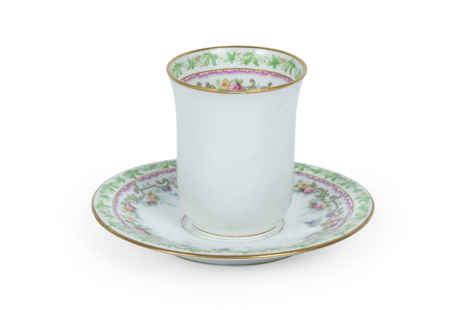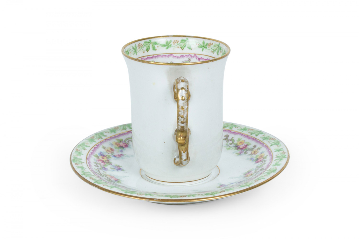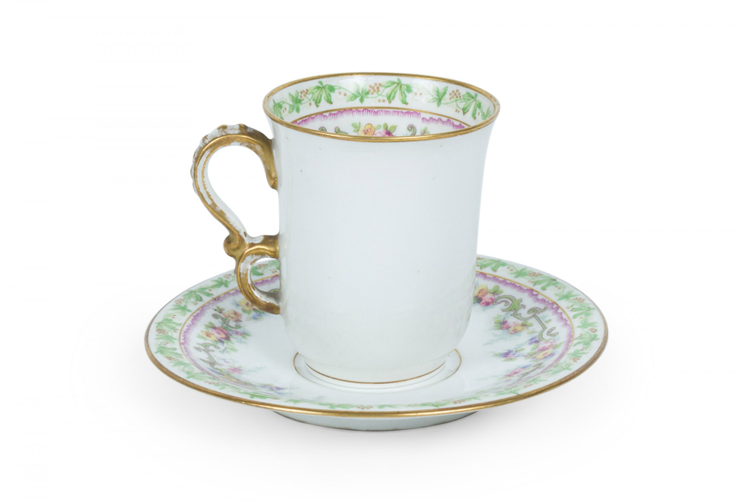 Set of 5 French Victorian white porcelain tea cups and saucers with pink and green floral decoration and gold trim. (PRICED AS SET)