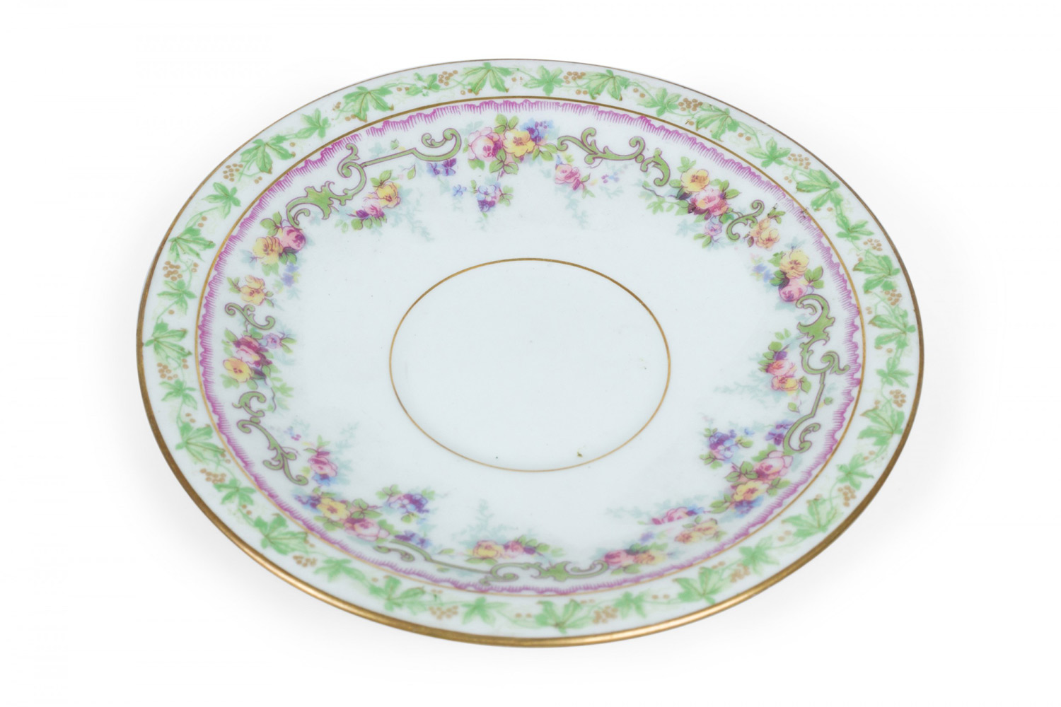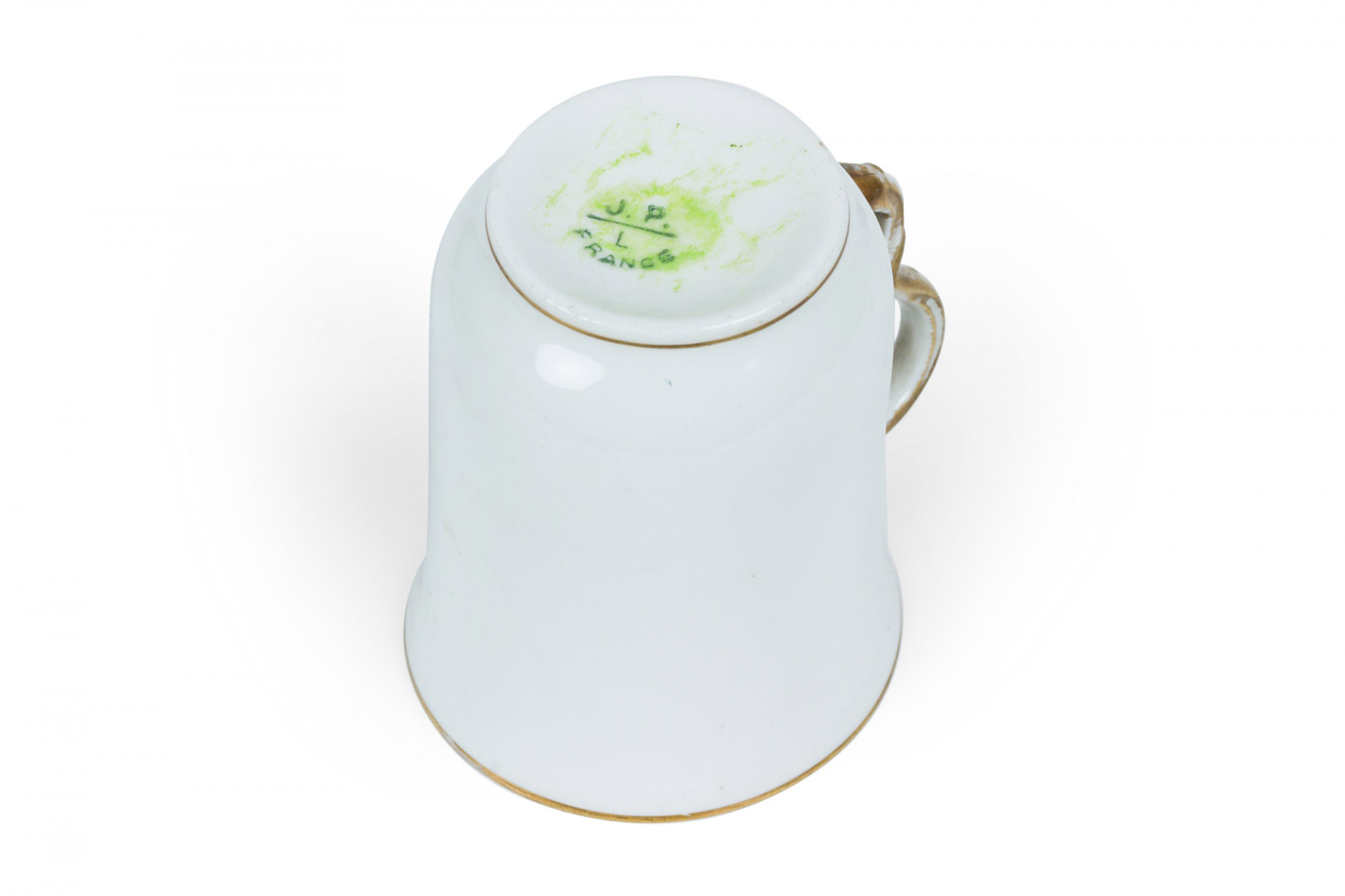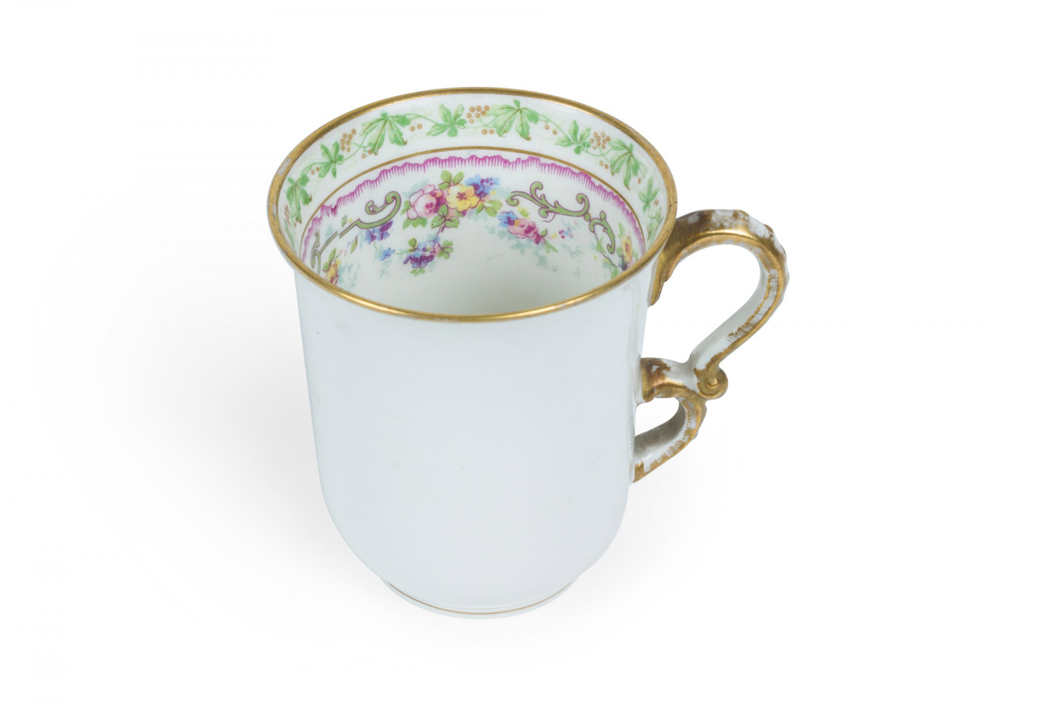 Set of 5 French Victorian white porcelain tea cups and saucers with pink and green floral decoration and gold trim. (PRICED AS SET)