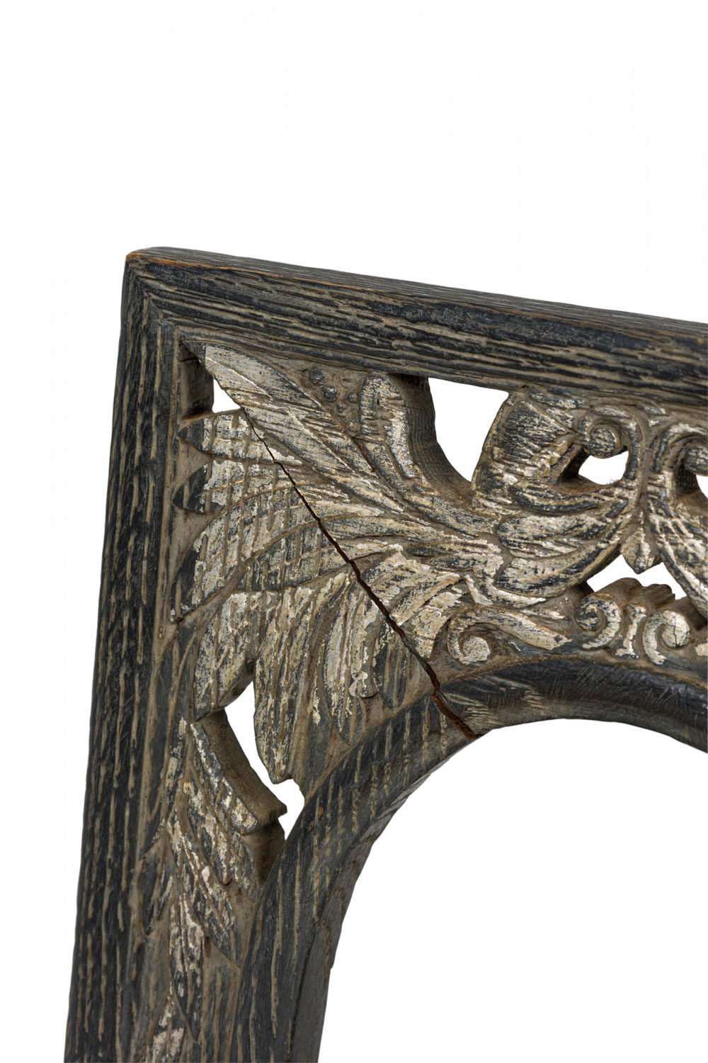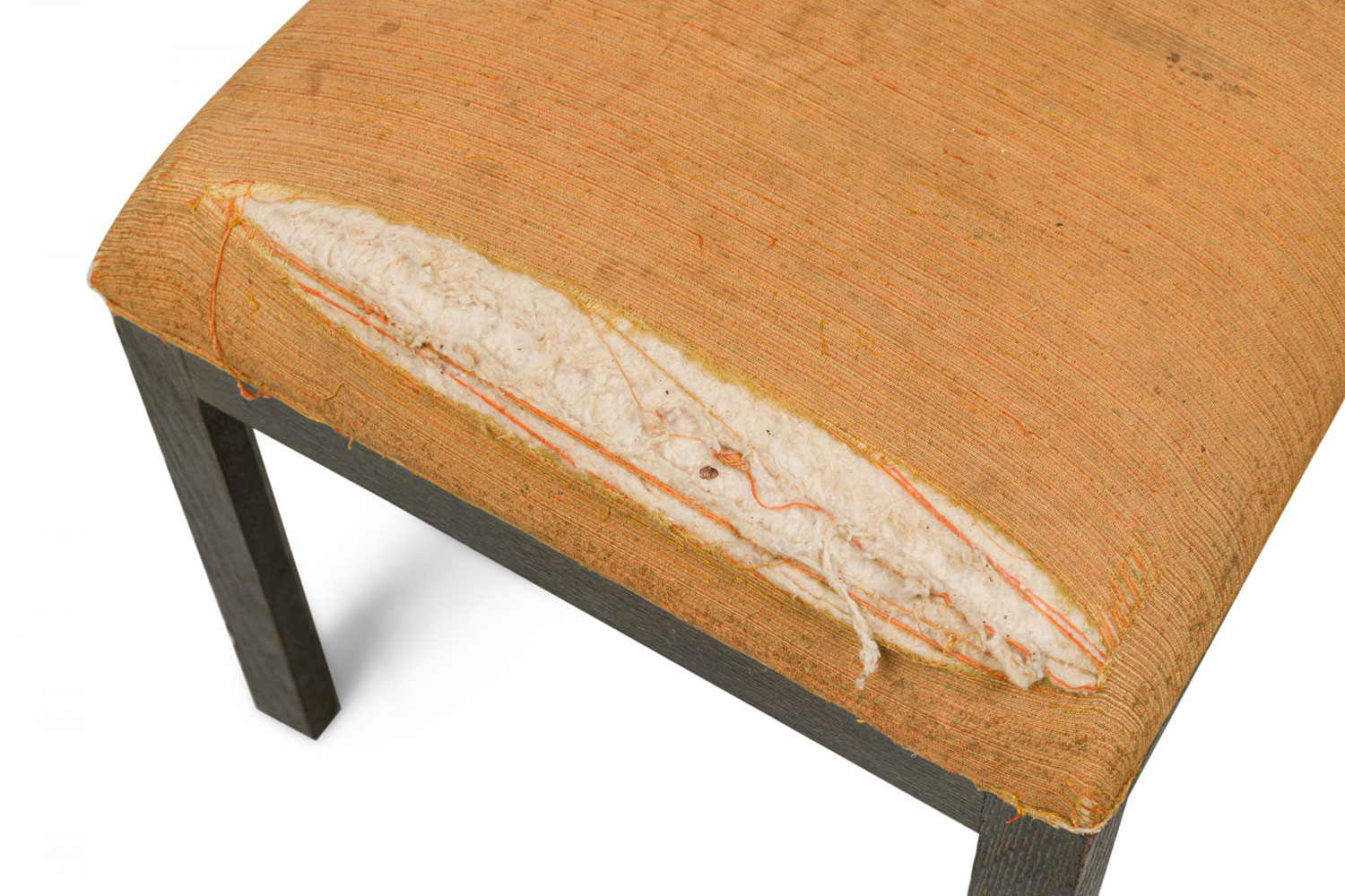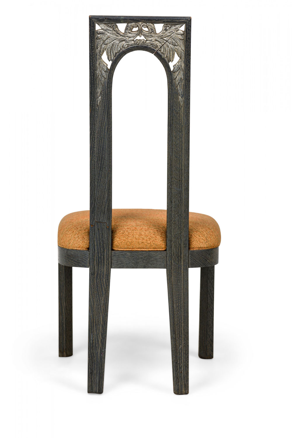 SET of 6 Mid-Century (1940s) American Modern dining chairs with cerused gray frames, narrow rectangular openwork backrests featuring an arched interior, carved in a wing design with silver leaf accents, with seats upholstered in a textured gold fabric, standing on 2 straight front legs and slightly splayed back legs. (PRICED AS SET) (JAMES MONT)