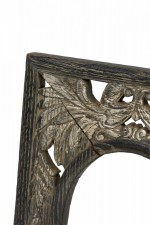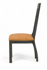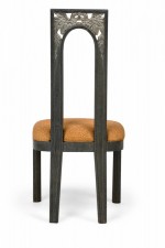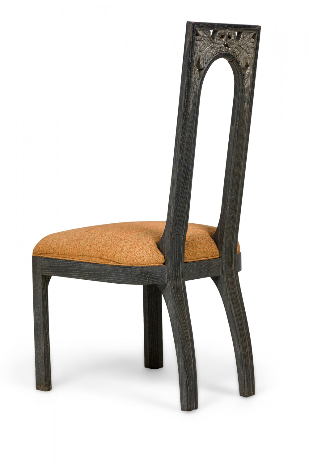 SET of 6 Mid-Century (1940s) American Modern dining chairs with cerused gray frames, narrow rectangular openwork backrests featuring an arched interior, carved in a wing design with silver leaf accents, with seats upholstered in a textured gold fabric, standing on 2 straight front legs and slightly splayed back legs. (PRICED AS SET) (JAMES MONT).
