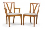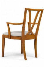 SET of 6 American Mid-Century (1950s) dining chairs (2 armchairs and 4 side chairs) with carved maple frames featuring a square back with a fluted "X" design and white woven fabric upholstered seats. (TOMLINSON MFG)(PRICED AS SET).