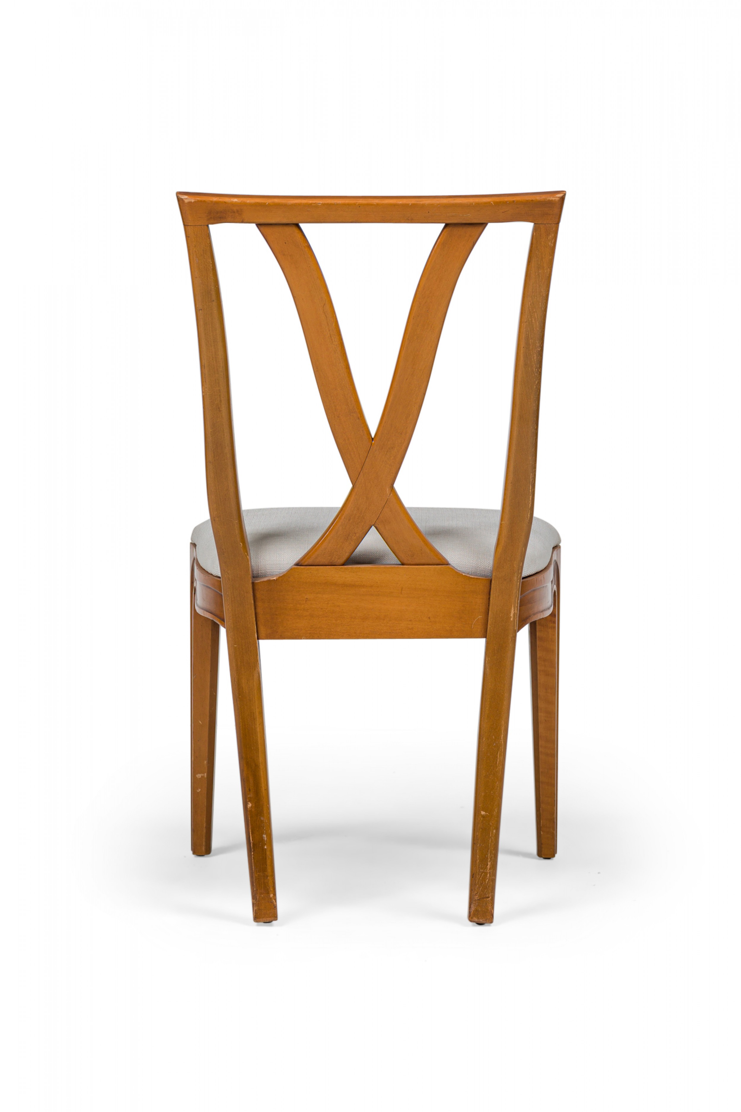 SET of 6 American Mid-Century (1950s) dining chairs (2 armchairs and 4 side chairs) with carved maple frames featuring a square back with a fluted "X" design and white woven fabric upholstered seats. (TOMLINSON MFG)(PRICED AS SET)