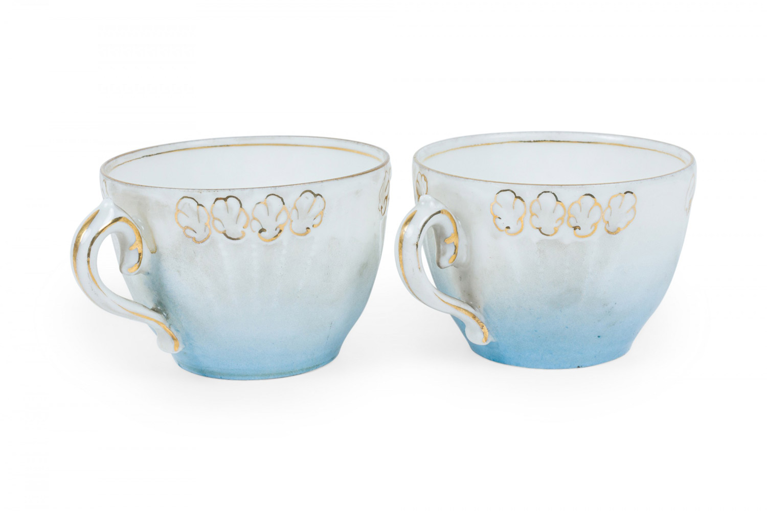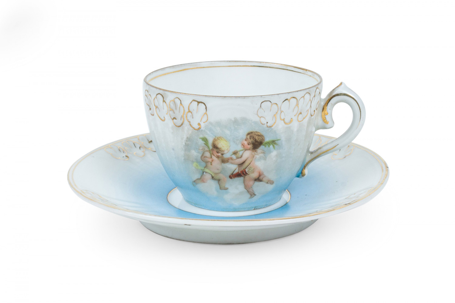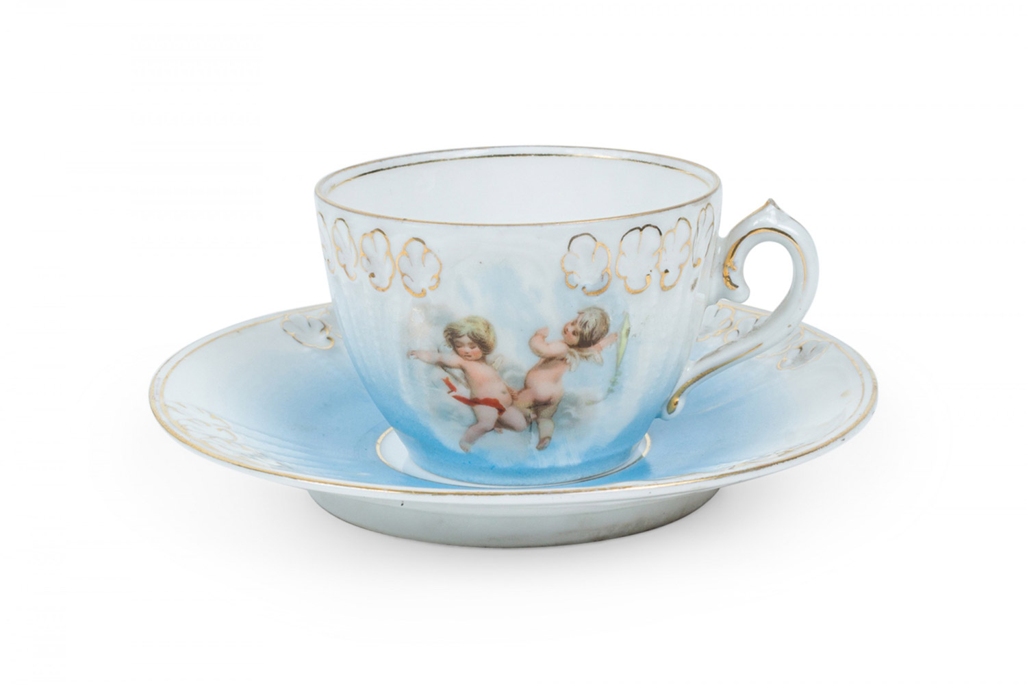 Set of 7 French Victorian blue and white porcelain tea cups and saucers with cupid design. (PRICED AS SET)
