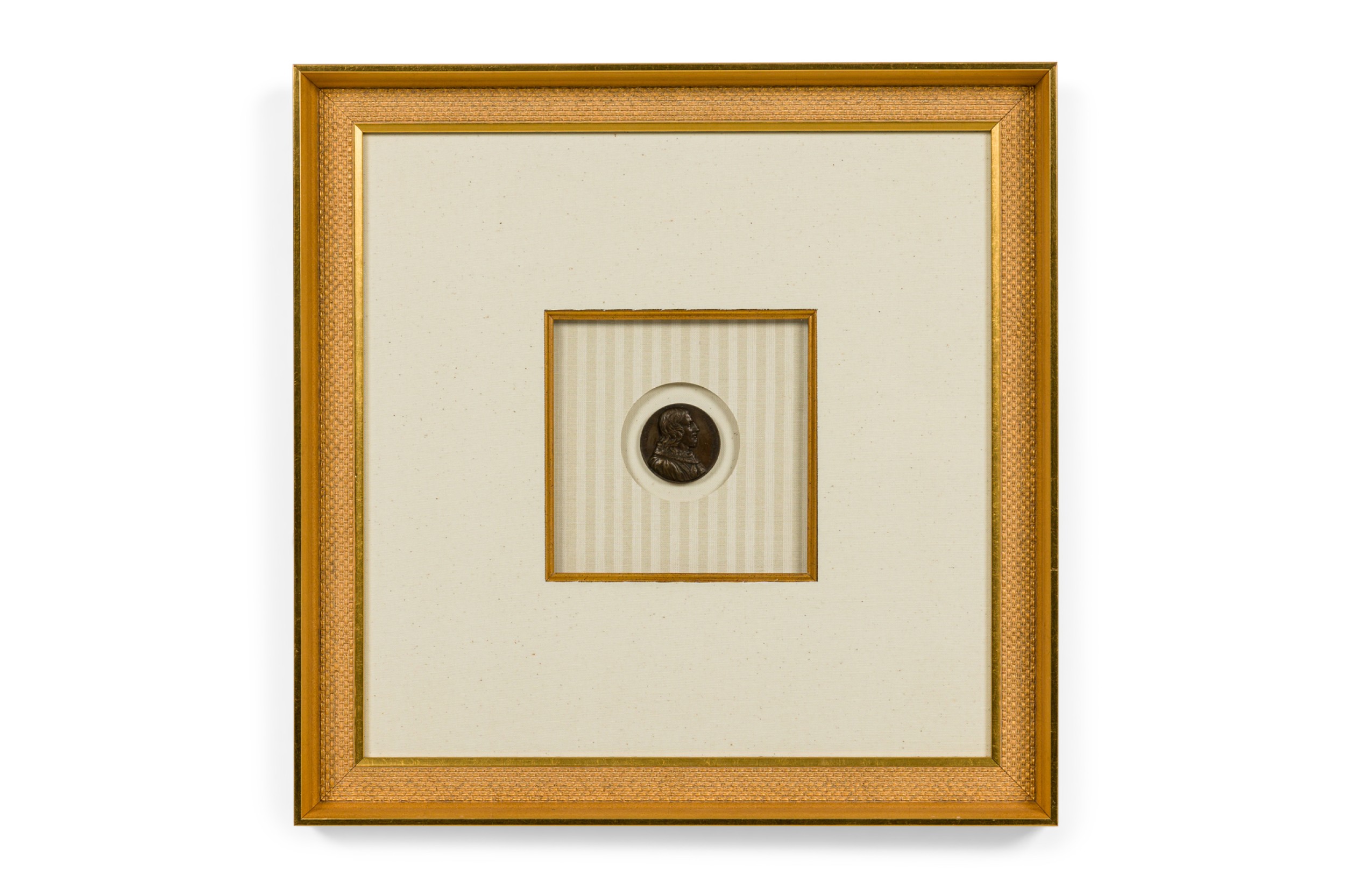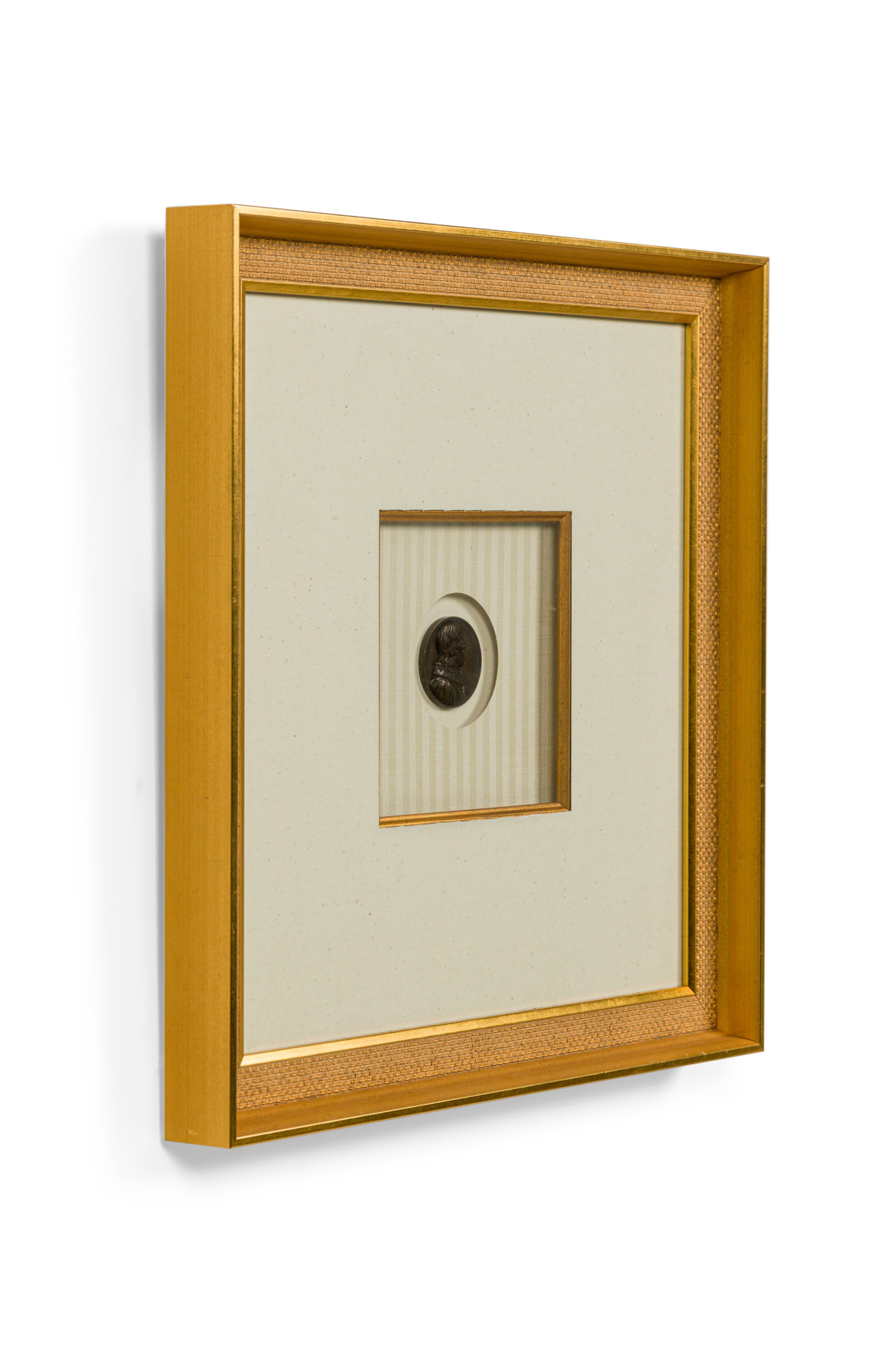 9 Armand Auguste Caqué French Empire commemorative coins in square gold frames placed in a floating beige and cream striped mat (PRICED EACH).