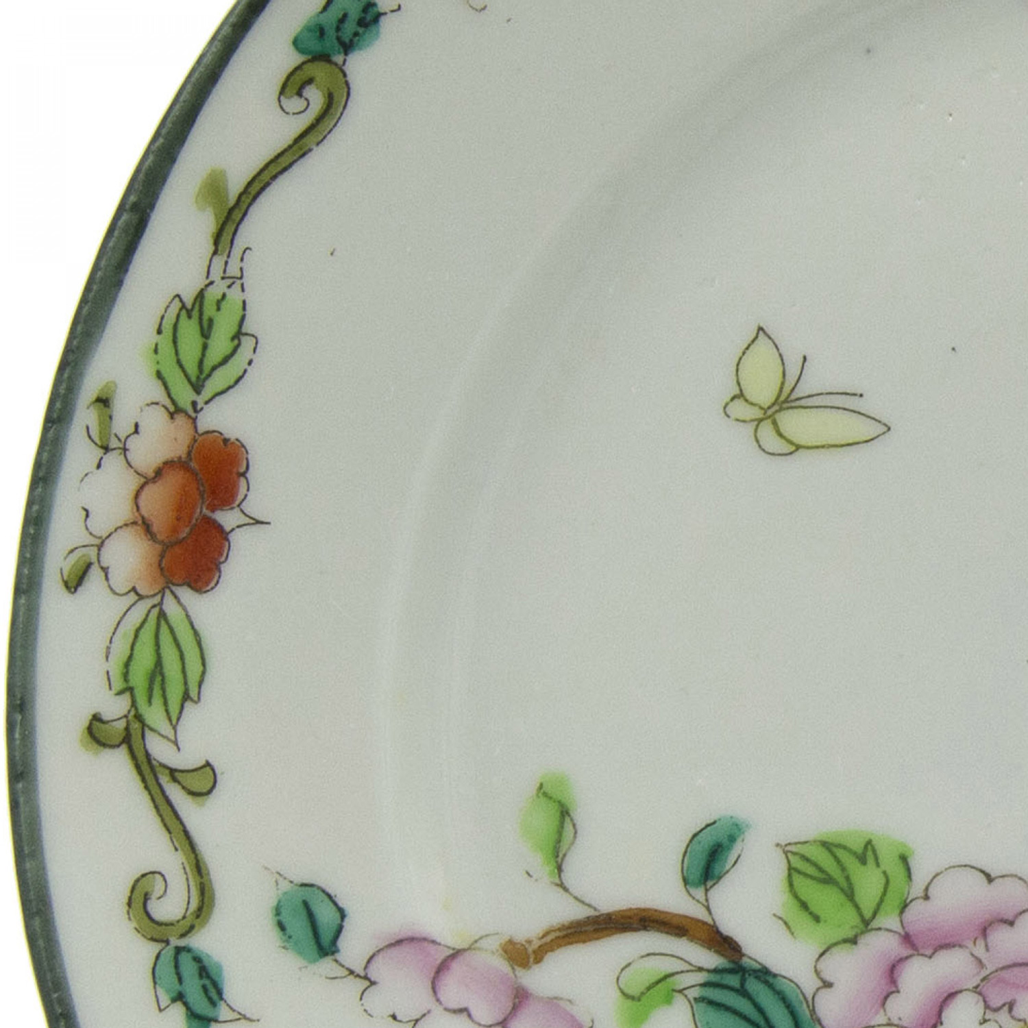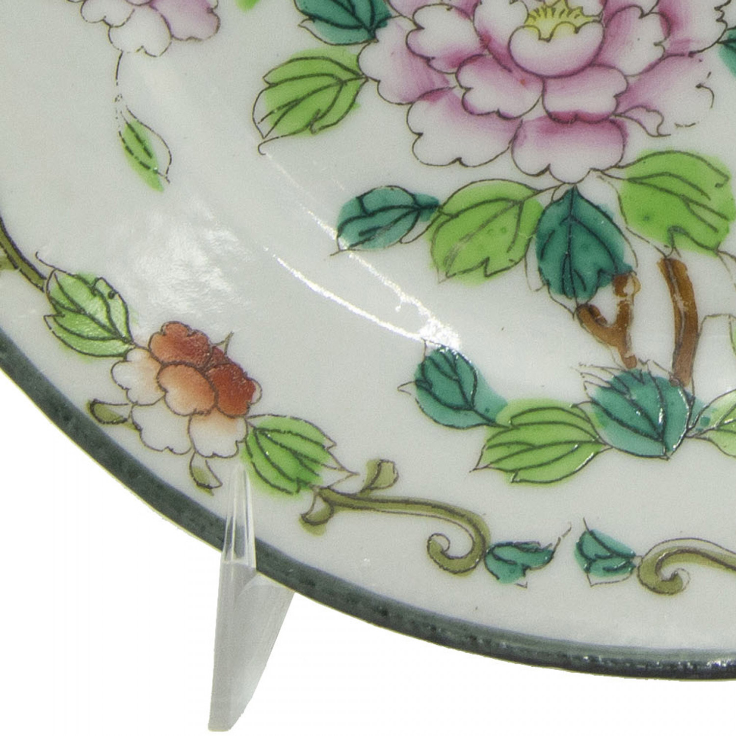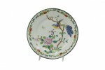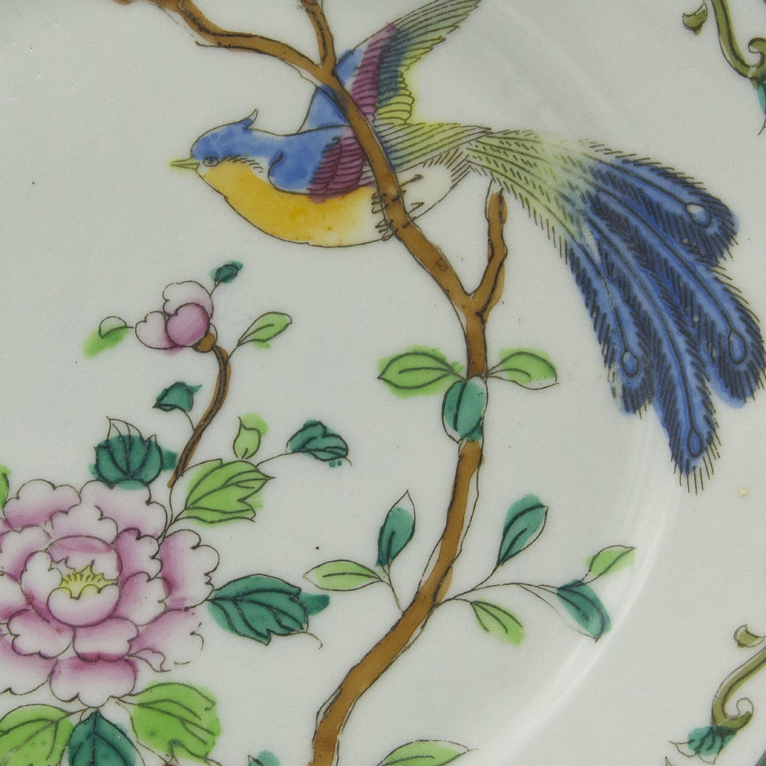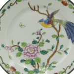 Set of 6 white porcelain plates with floral and bird design with green border.