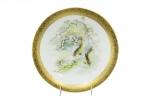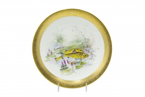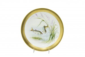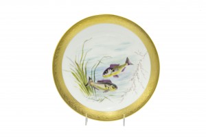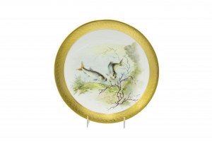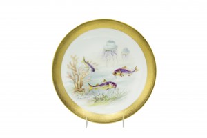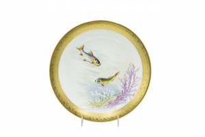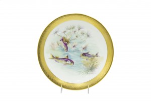 Set of 12 French Victorian-style (Early 20th Century) porcelain plates with gilt border and depicting fish, designed and signed E. de Fressignes (by Elite of Paris for Bawo & Dotter of New York)
