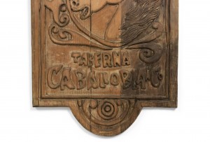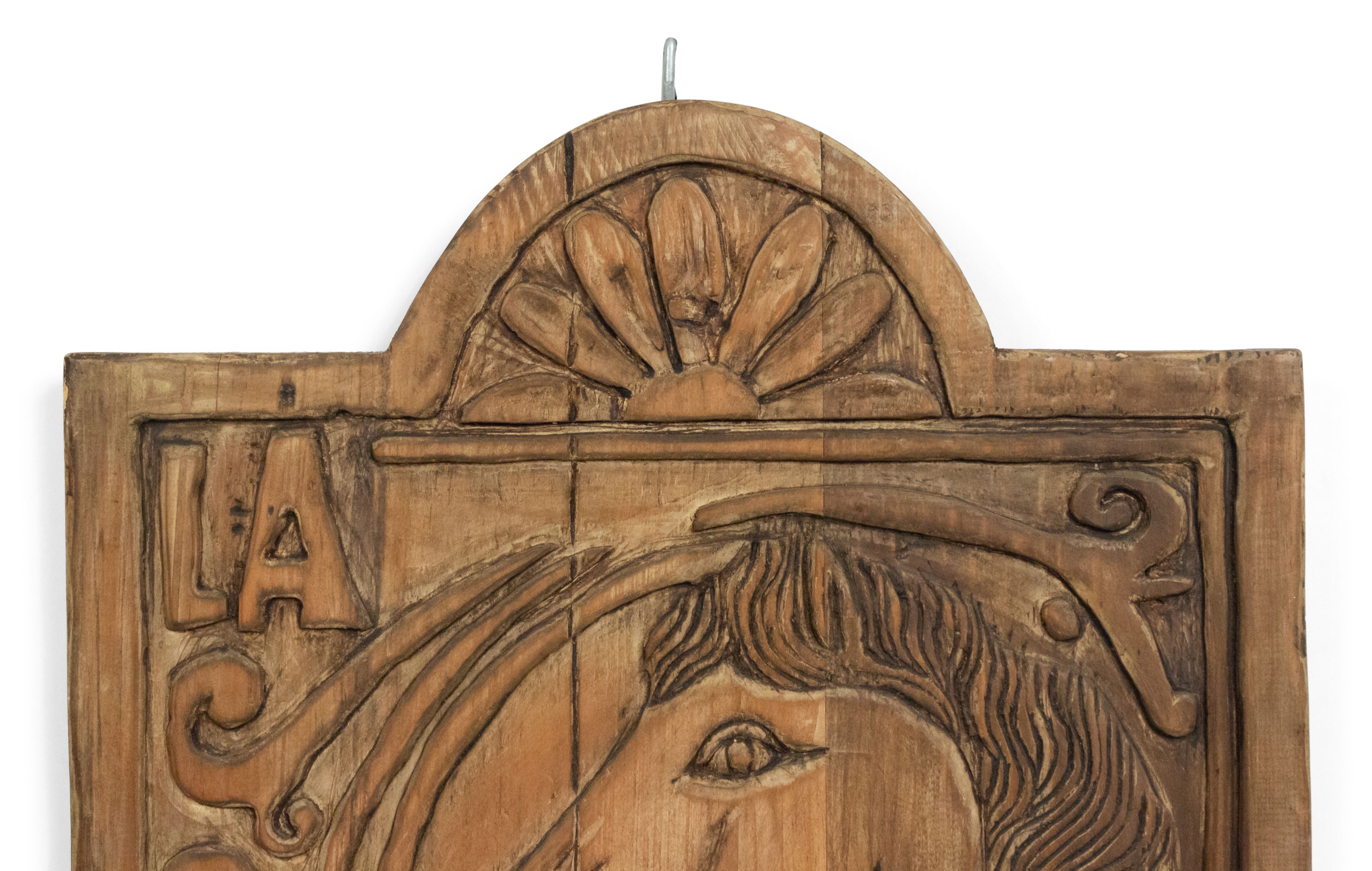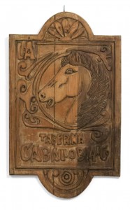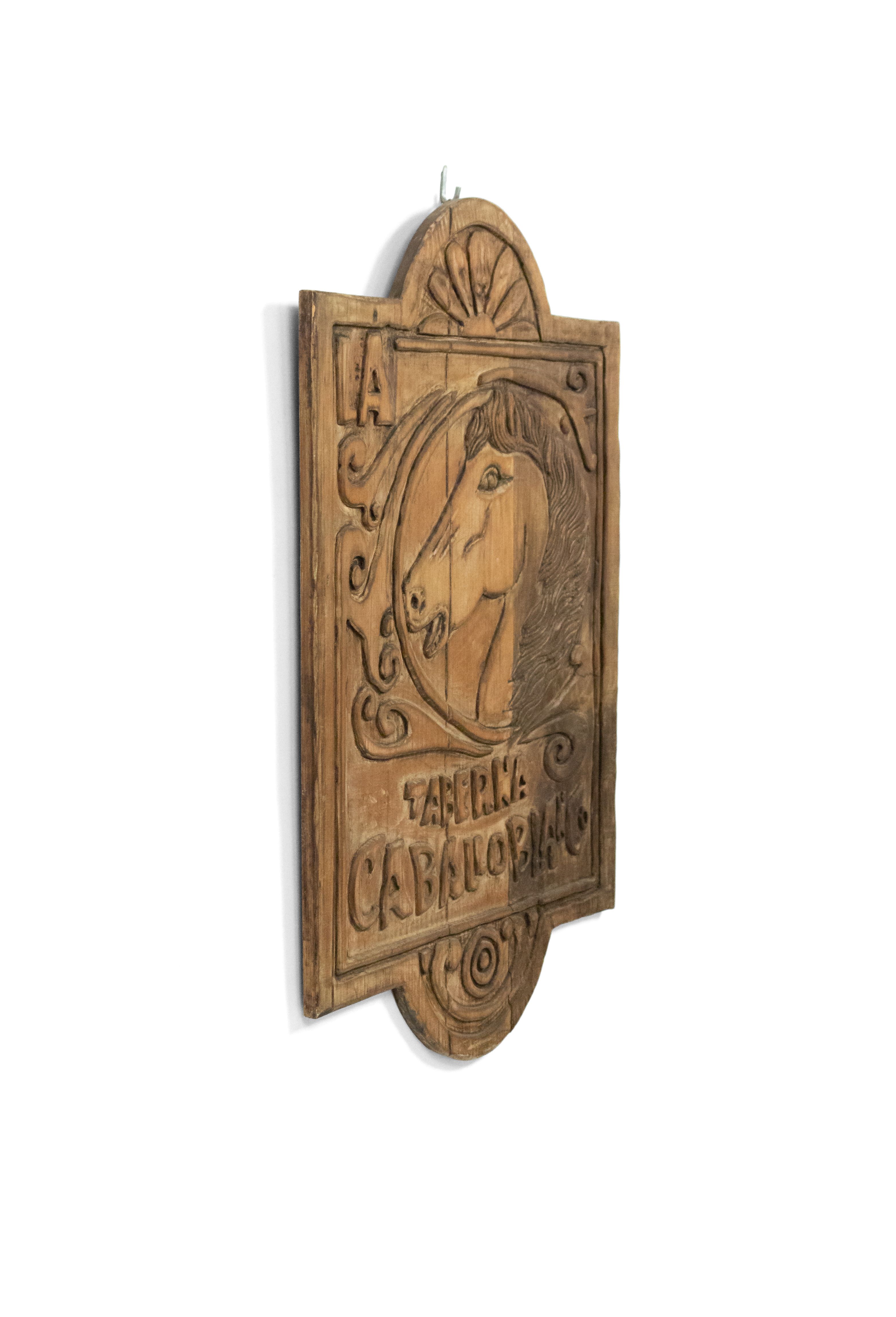 Spanish Provincial (20th Cent) style painted and carved horse head wall plaque/sign (La Taberna Caballoblanco) (Related item: 049724D).