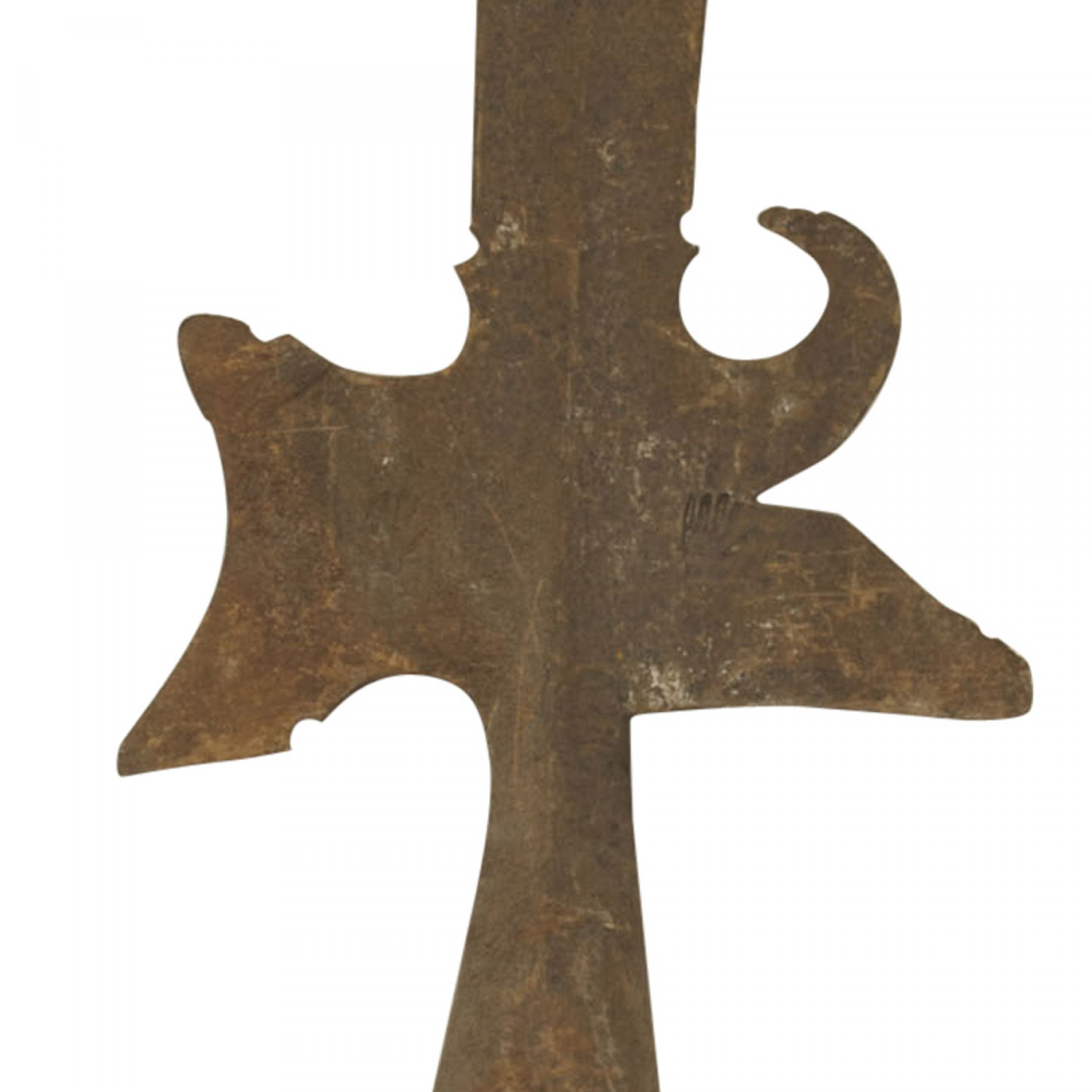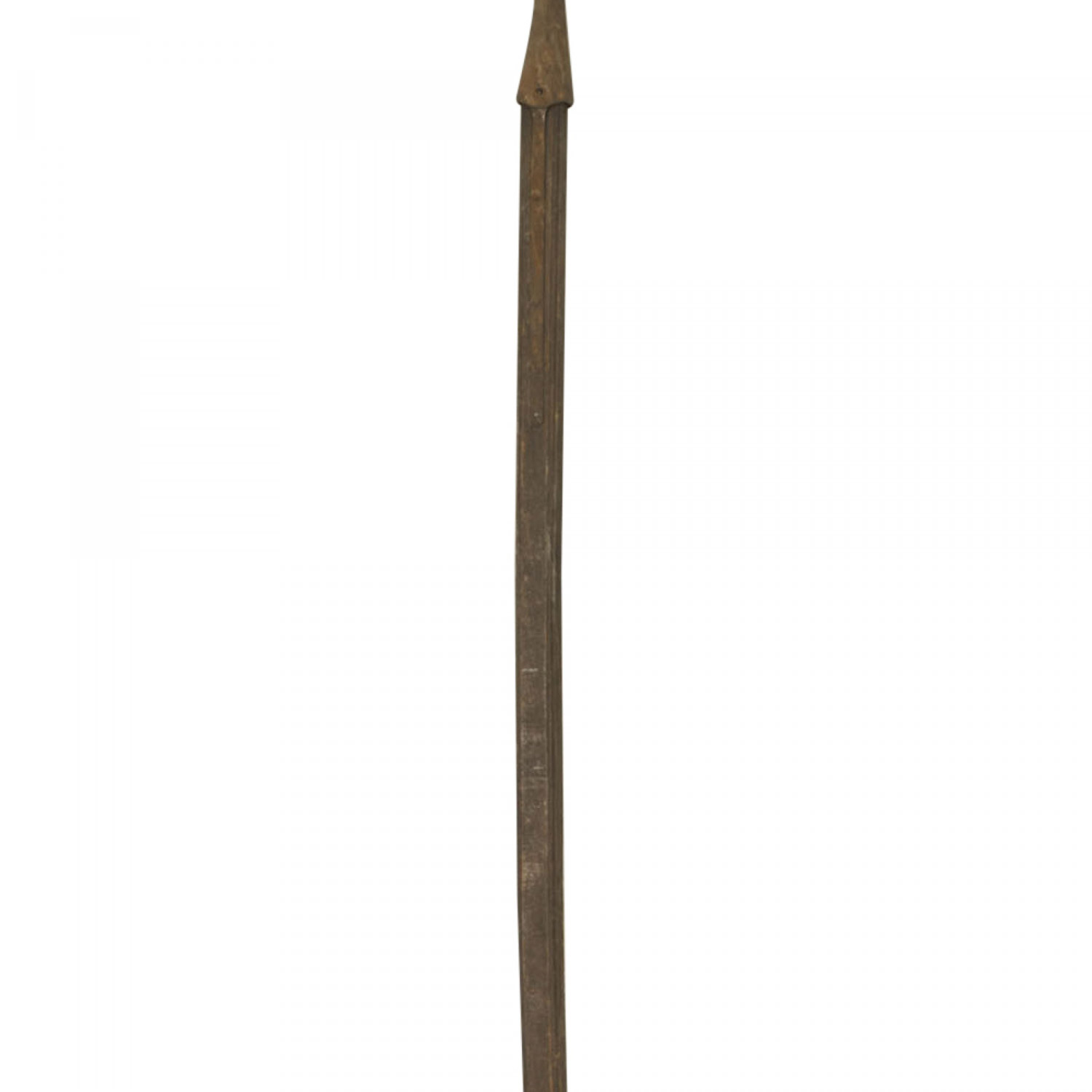 English Renaissance-style halberd spear with square wooden shaft and 31-inch iron blade with two small hand prints..