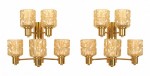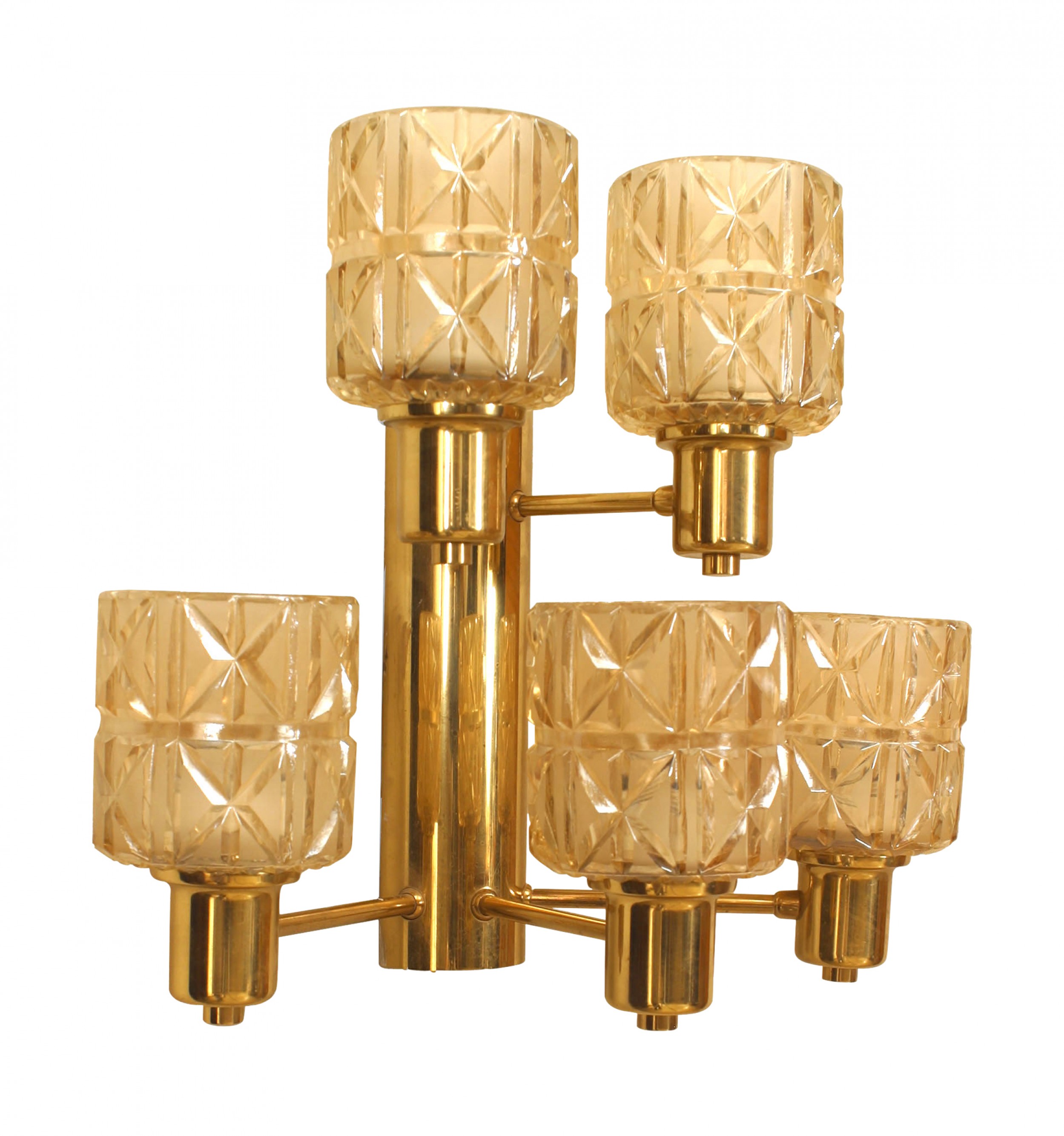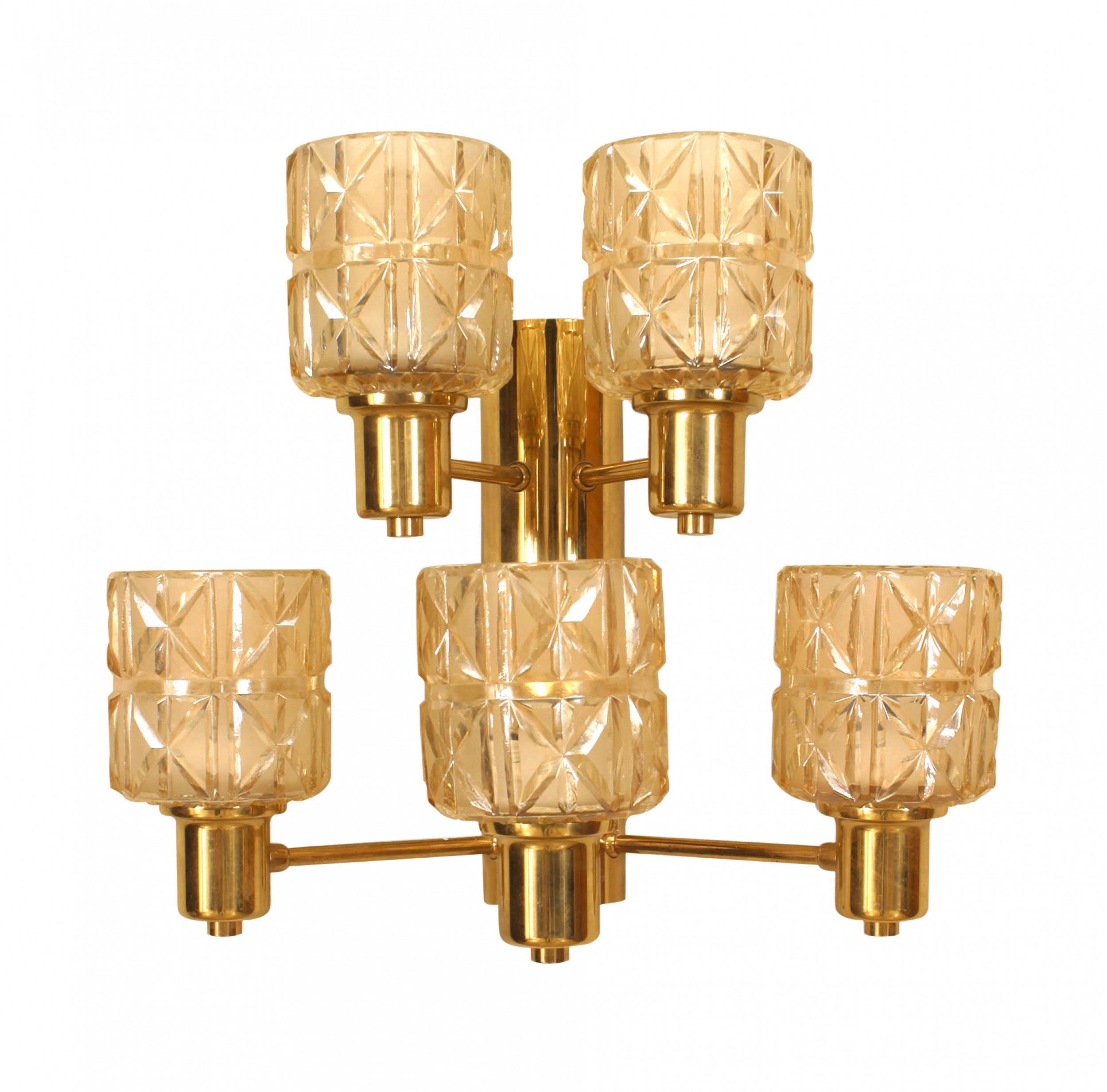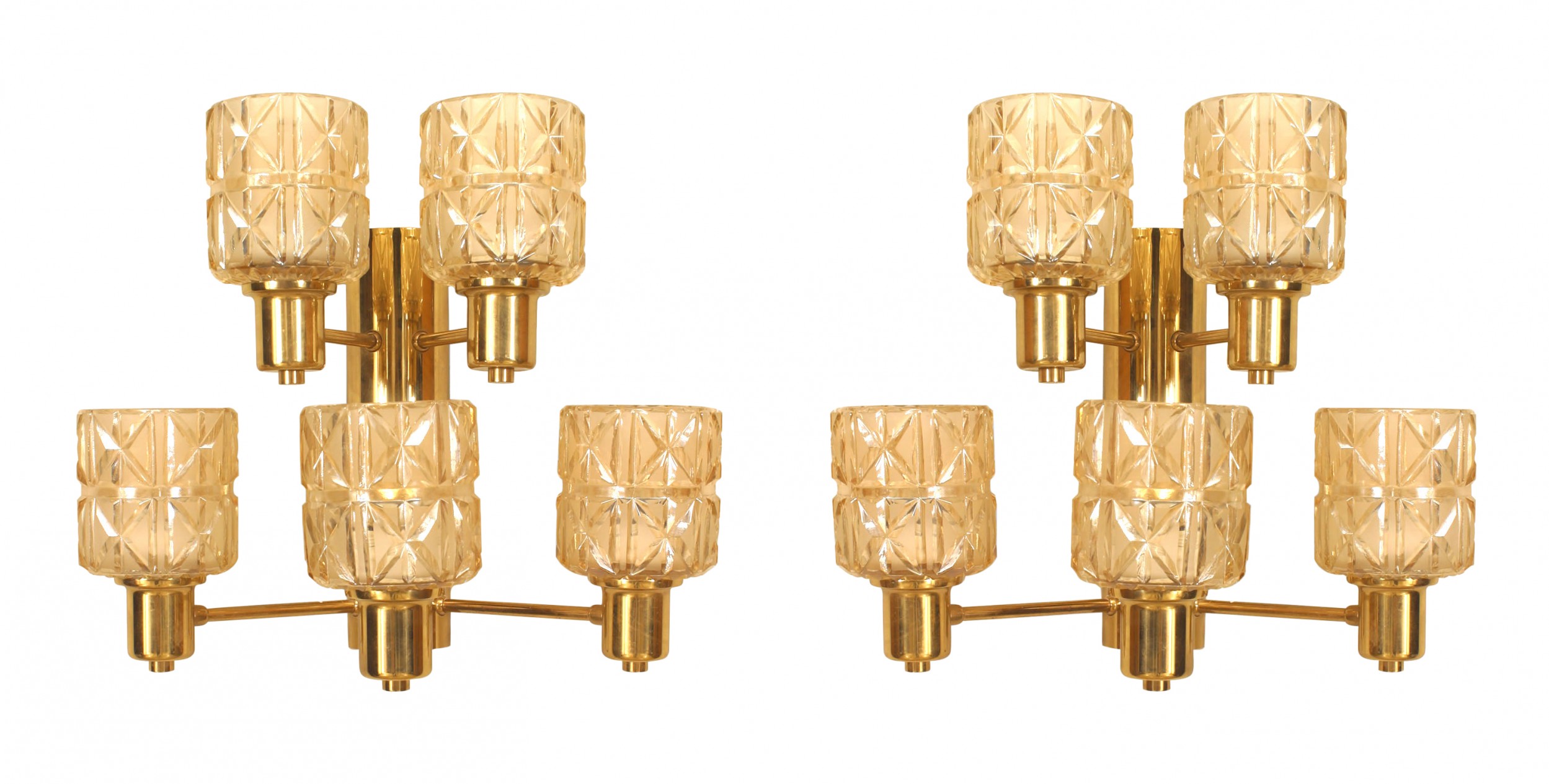 PAIR of Swedish Mid-Century (1950s) wall sconces with a two-tier brass frame supporting two cut glass shades on the upper tier and three shades on the lower (attributed to HANS-AGNE JAKOBSSON).