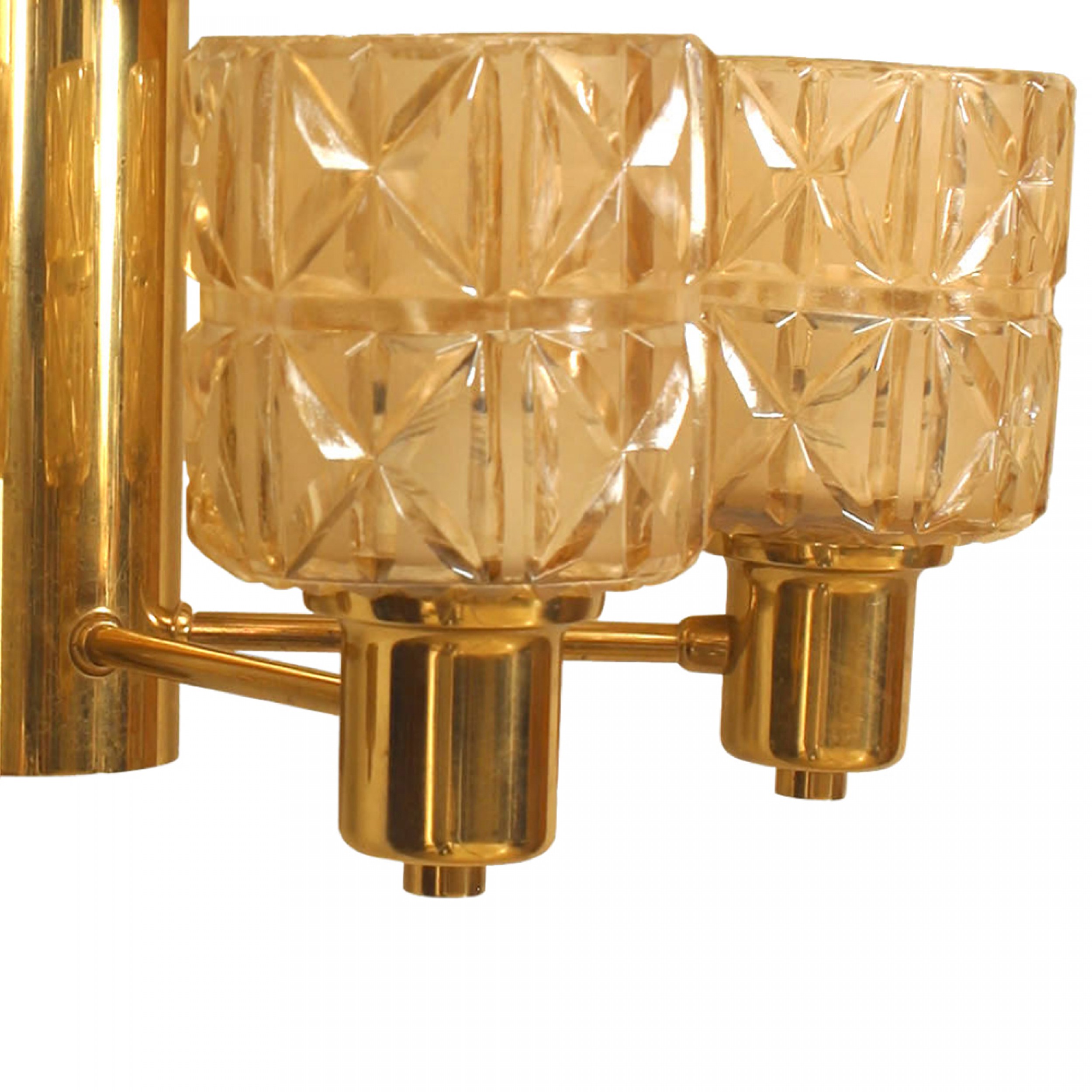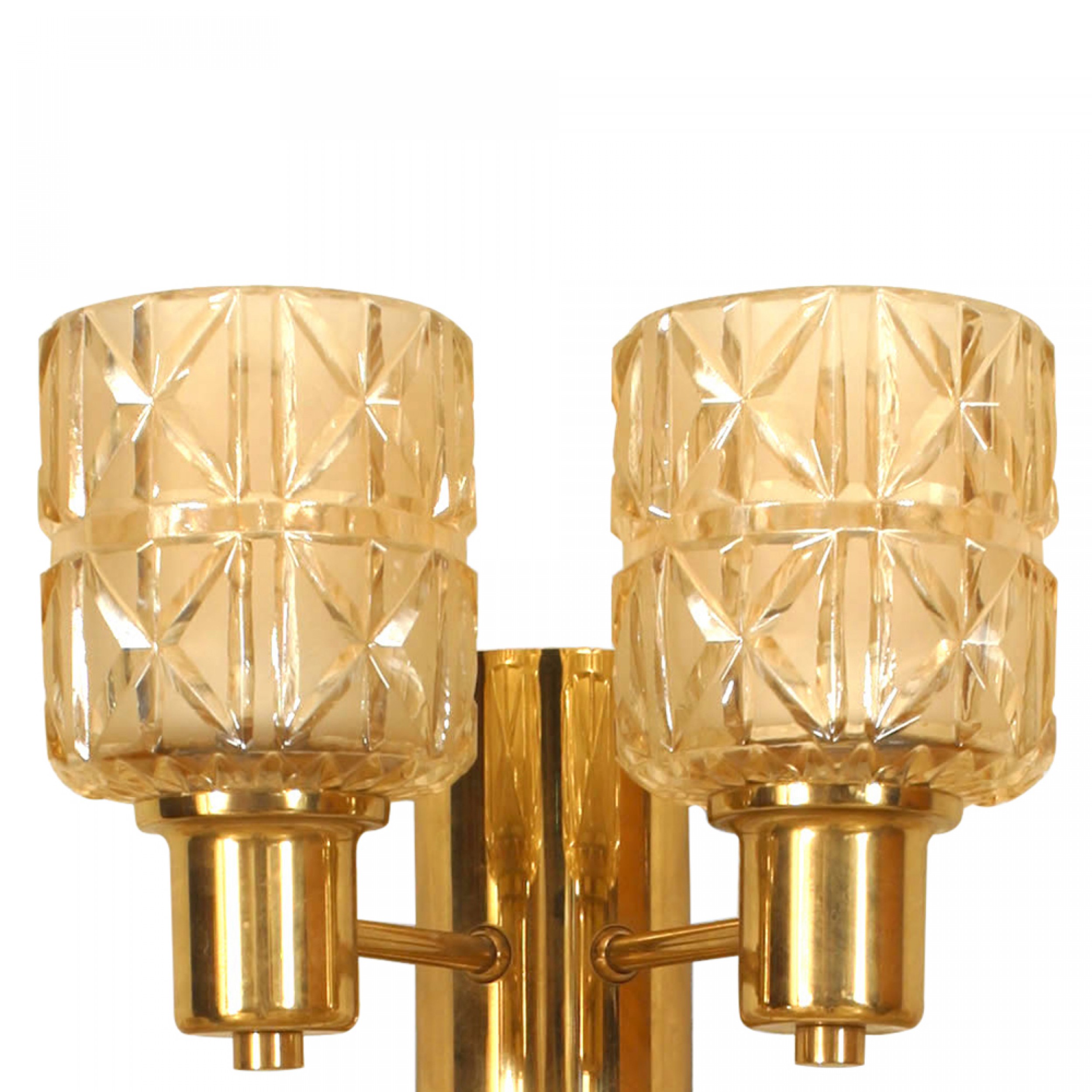 PAIR of Swedish Mid-Century (1950s) wall sconces with a two-tier brass frame supporting two cut glass shades on the upper tier and three shades on the lower (attributed to HANS-AGNE JAKOBSSON)