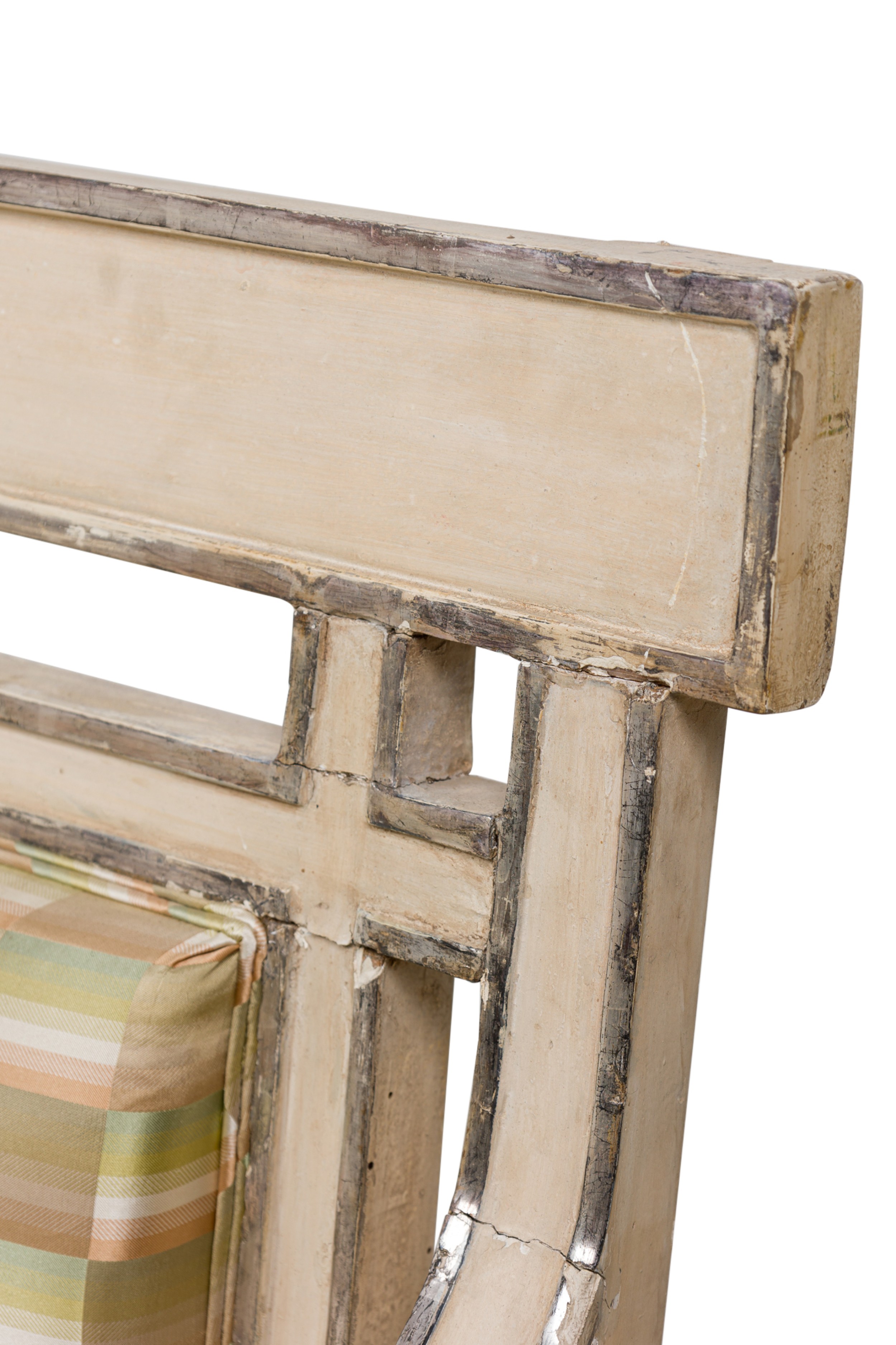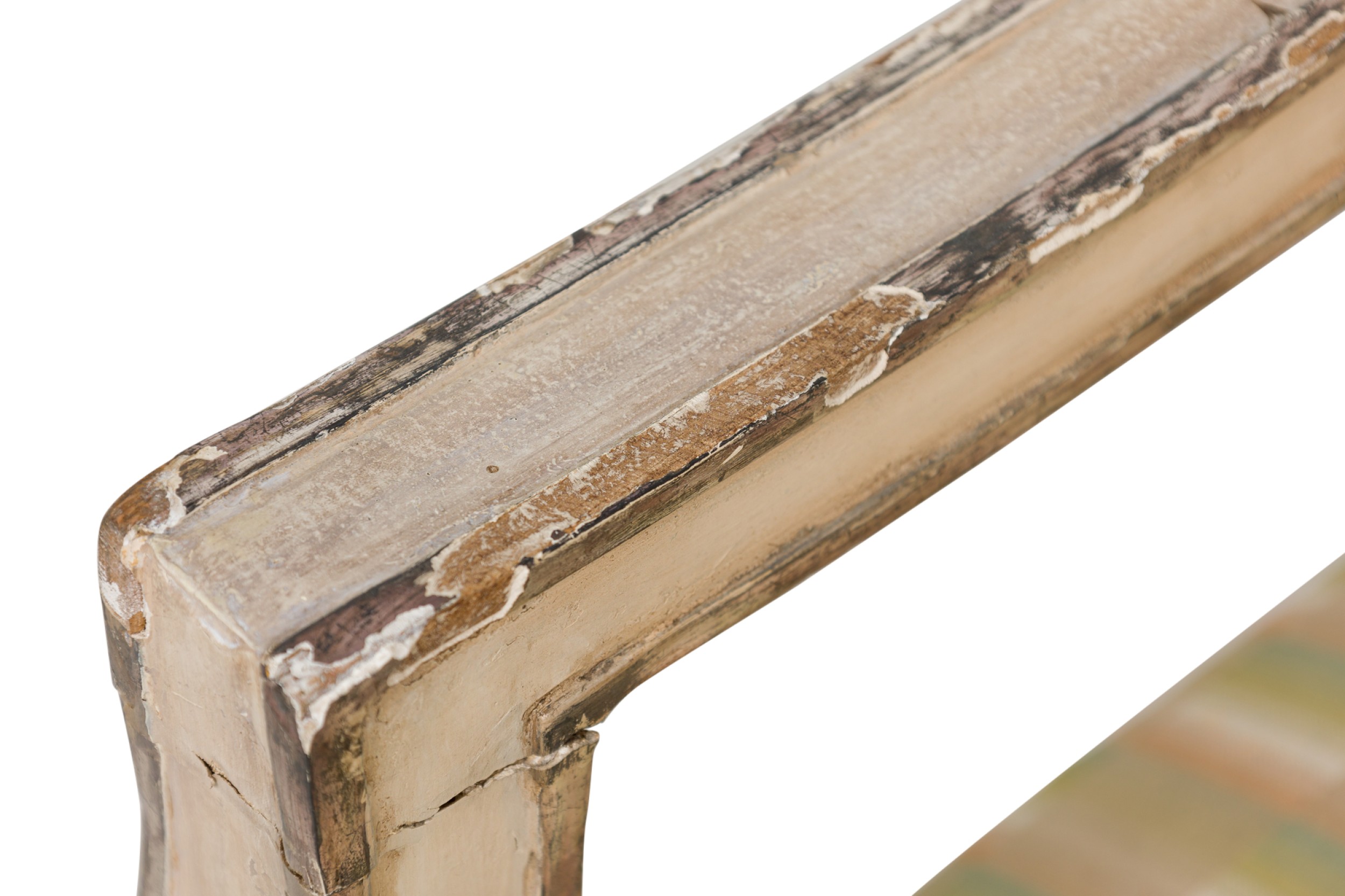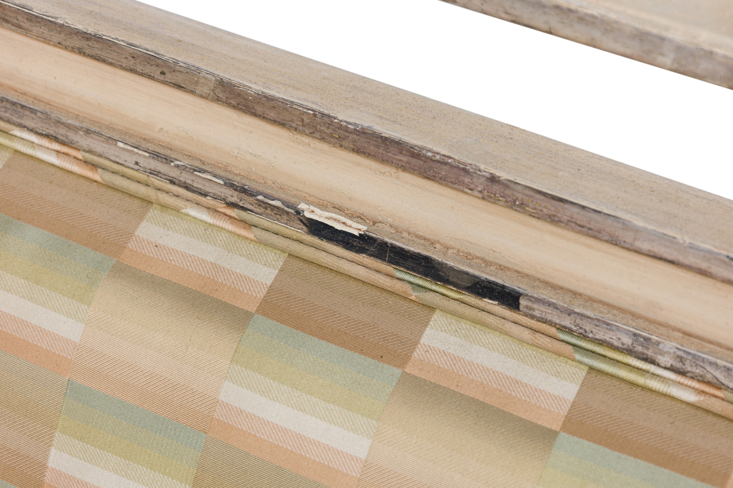 Style: Continental Materials & Techniques: Fabric, gilt / giltwood, painted, upholstered, wood Category: Seating Condition: Two center front legs repaired, losses to silver gilding and painted finish, recently reupholstered. Fair; Minor structural damages