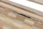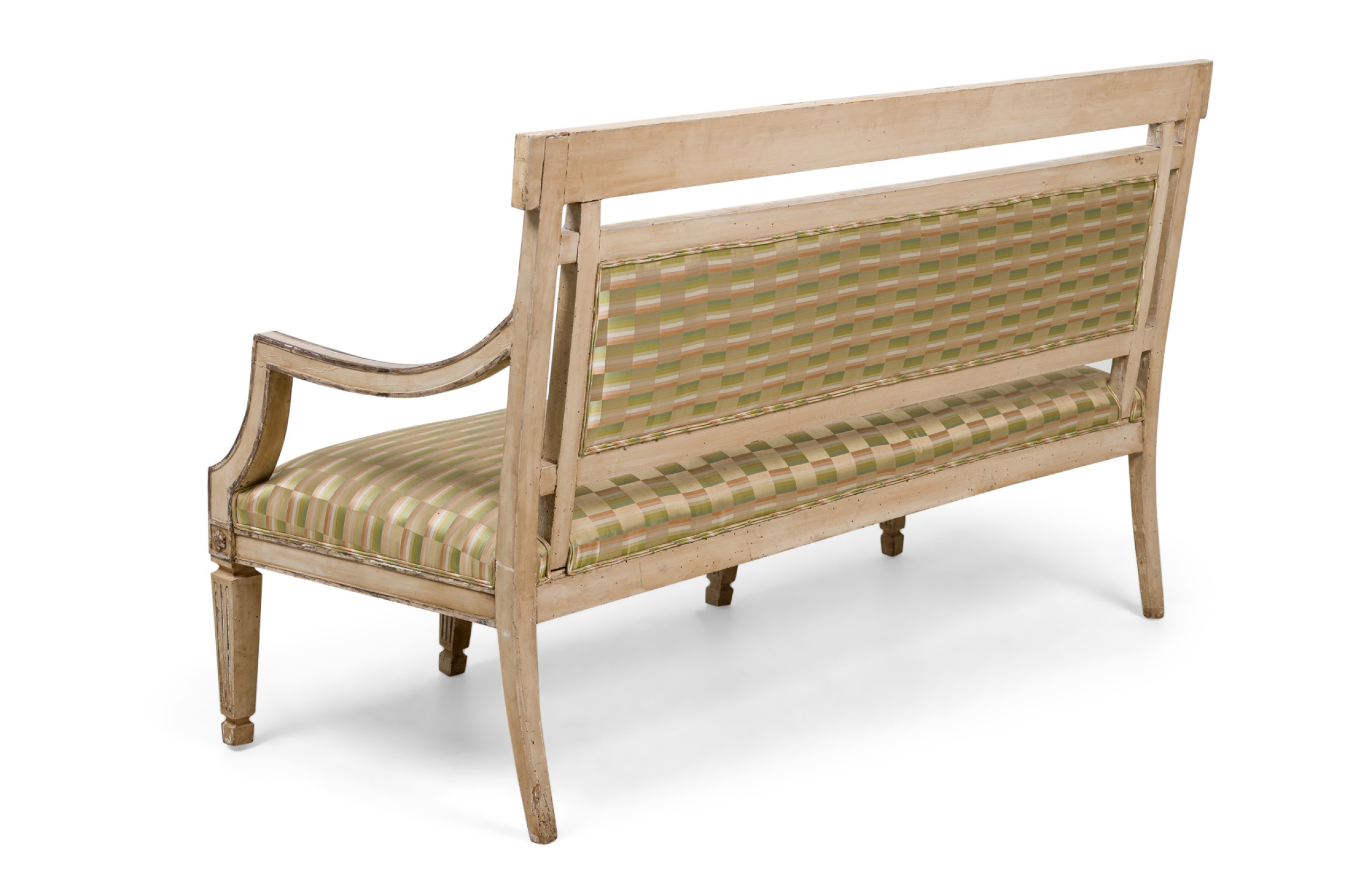 Swedish Neo-Classical settee with a carved wooden frame, painted white and parcel silver gilt, with decorative silver giltwood foliate carvings and rosettes, the seat and back upholstered in a checkered sage green and beige striped and checkered fabric..