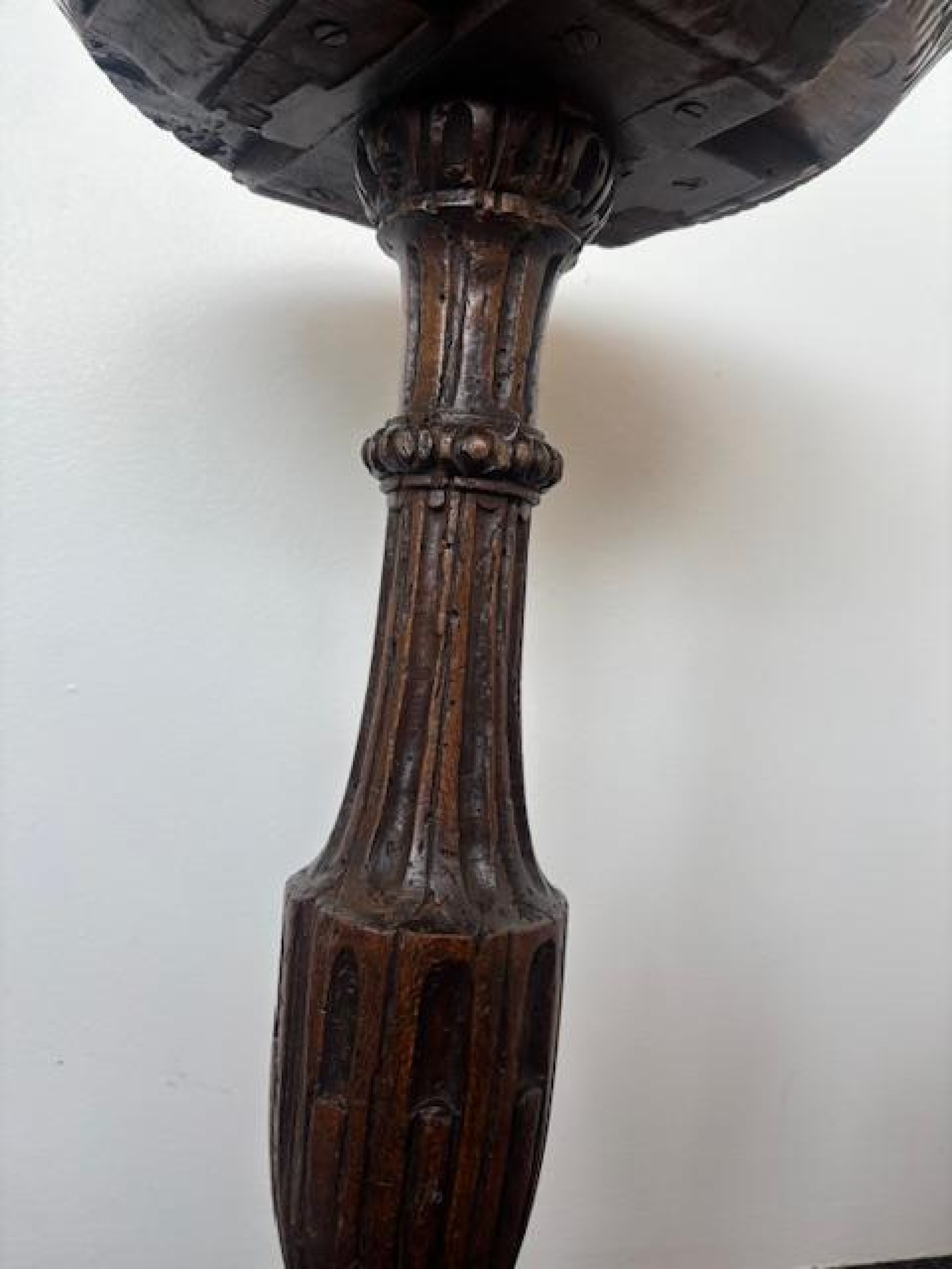 English Renaissance (17th Century)small walnut end table with fluted pedestal base and round top with carved apron.