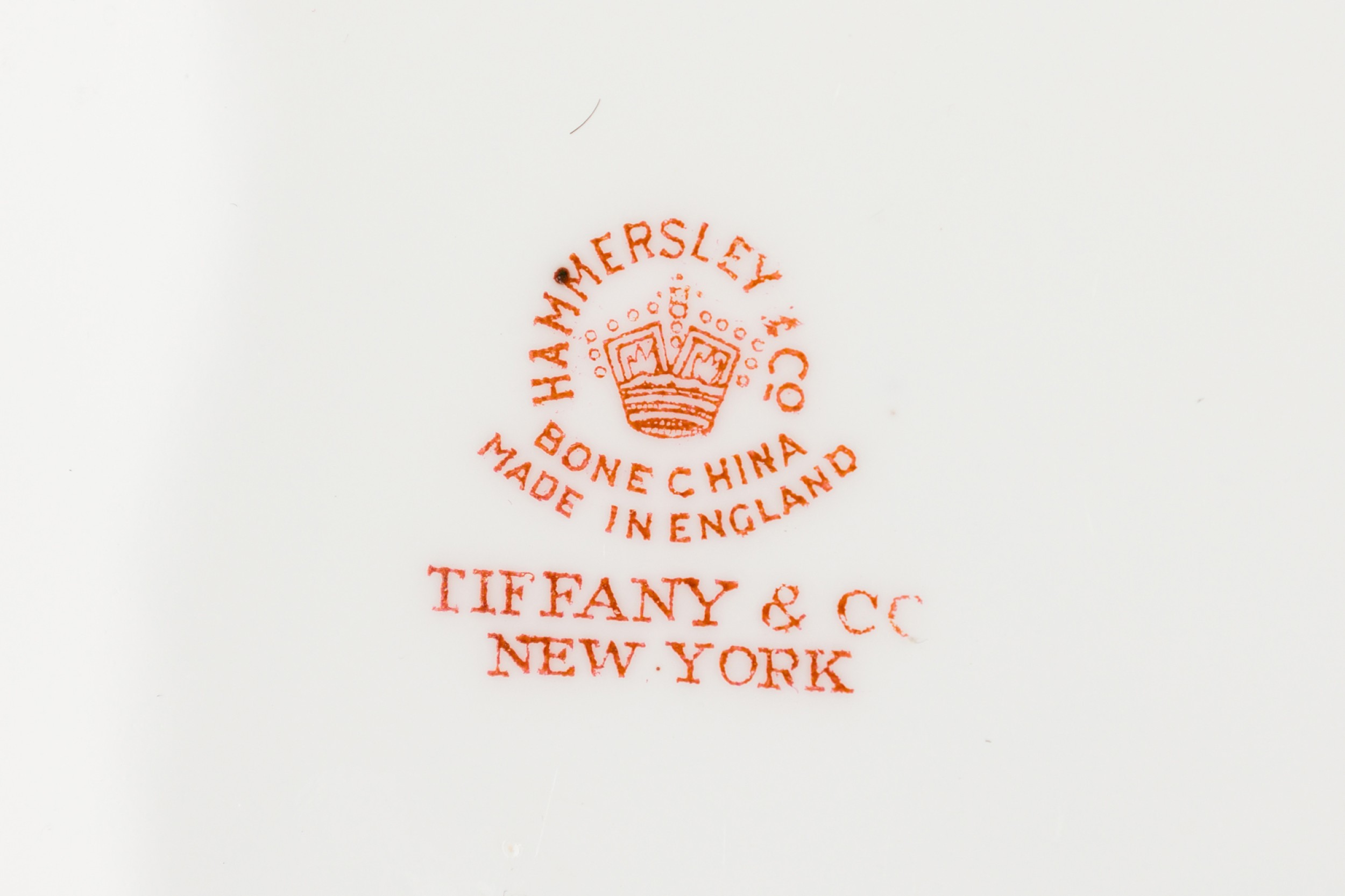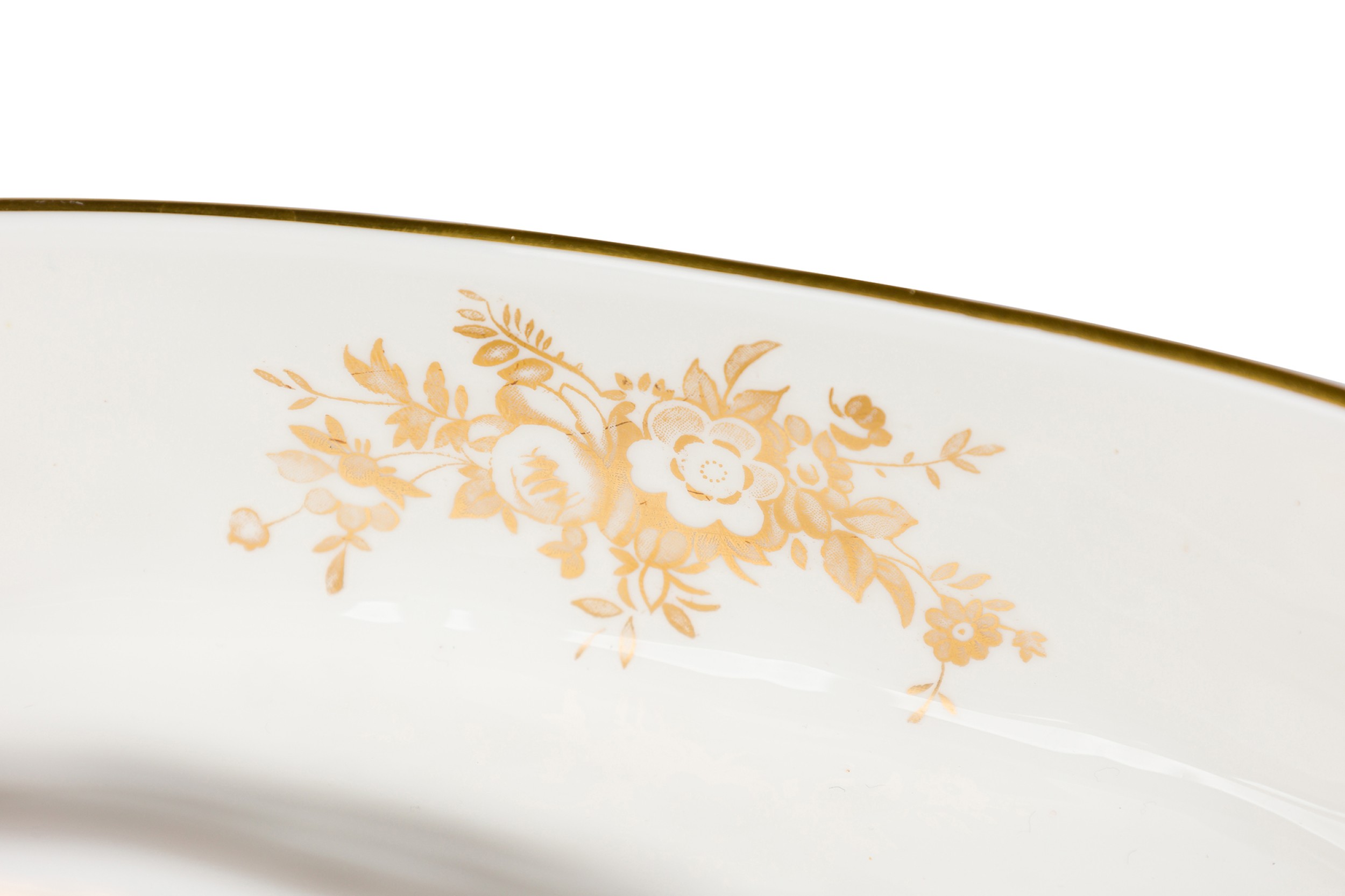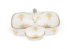 English style Mid-Century white ceramic picnic tray complote with gold floral decoration and having 2 small sections on each end of handle (HAMMERSLEY COMPANY FOR TIFFANY & CO).