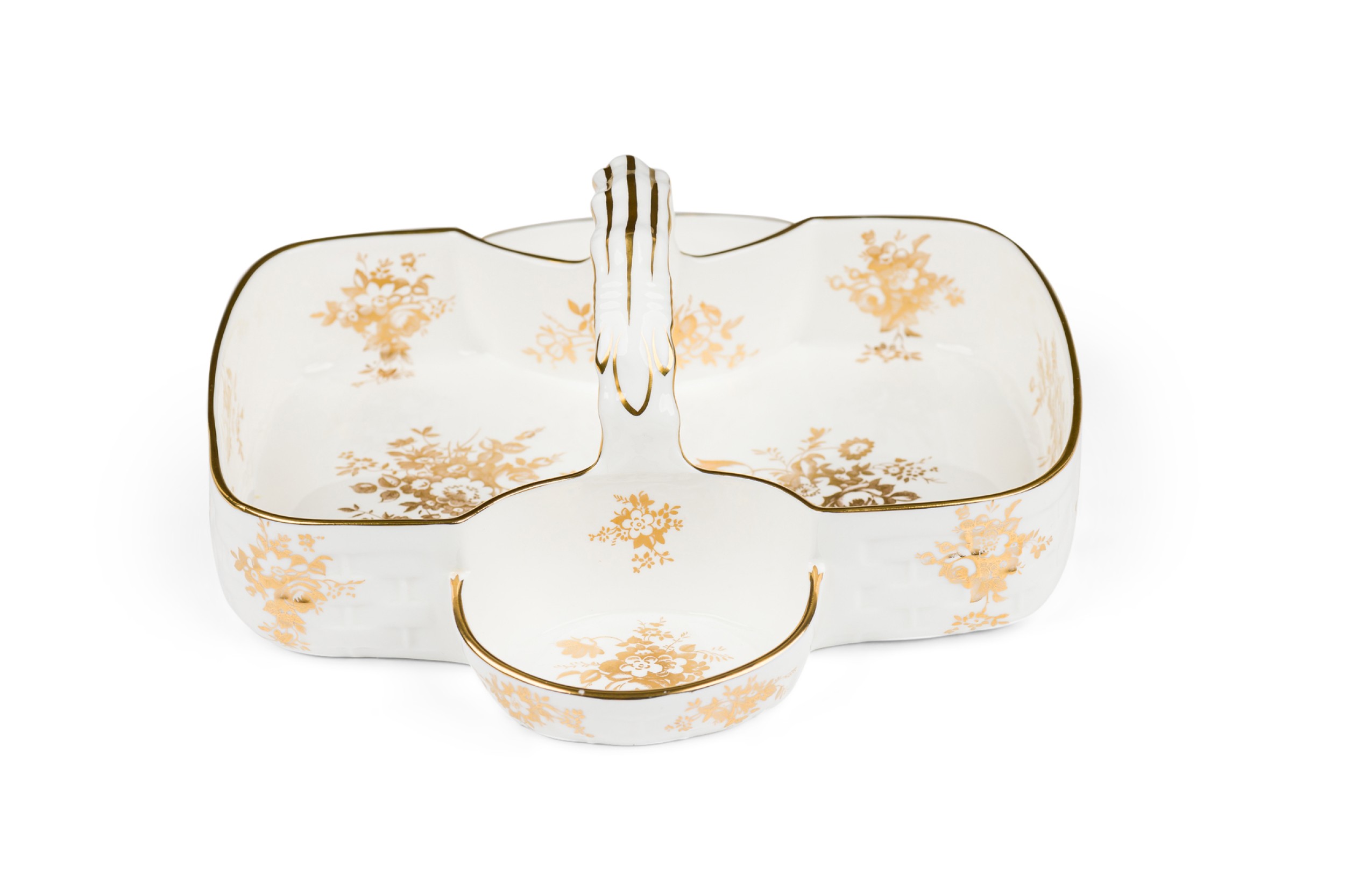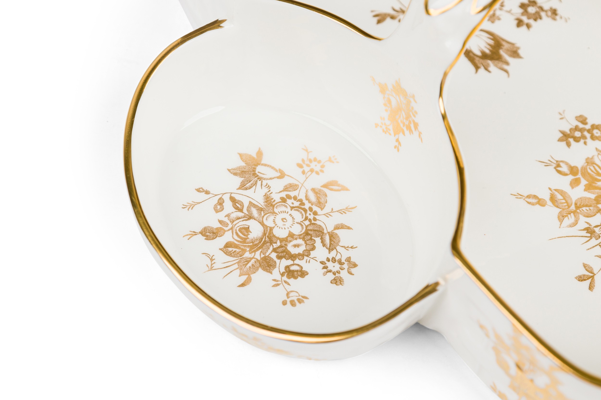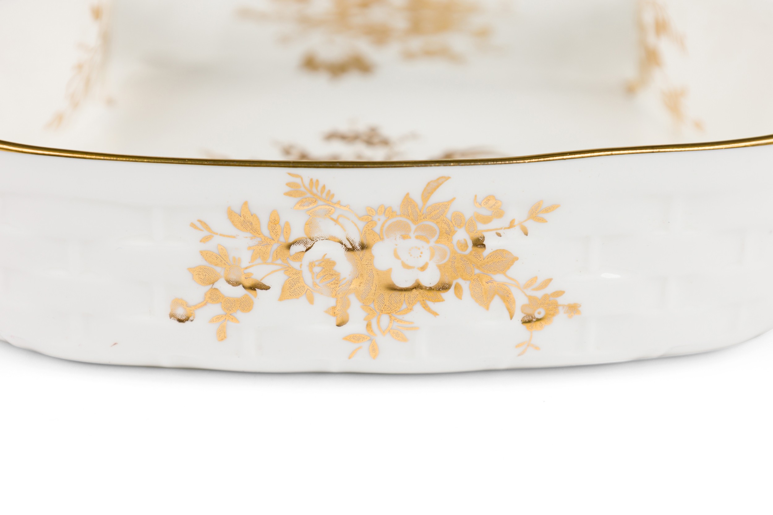 English style Mid-Century white ceramic picnic tray complote with gold floral decoration and having 2 small sections on each end of handle (HAMMERSLEY COMPANY FOR TIFFANY & CO)
