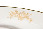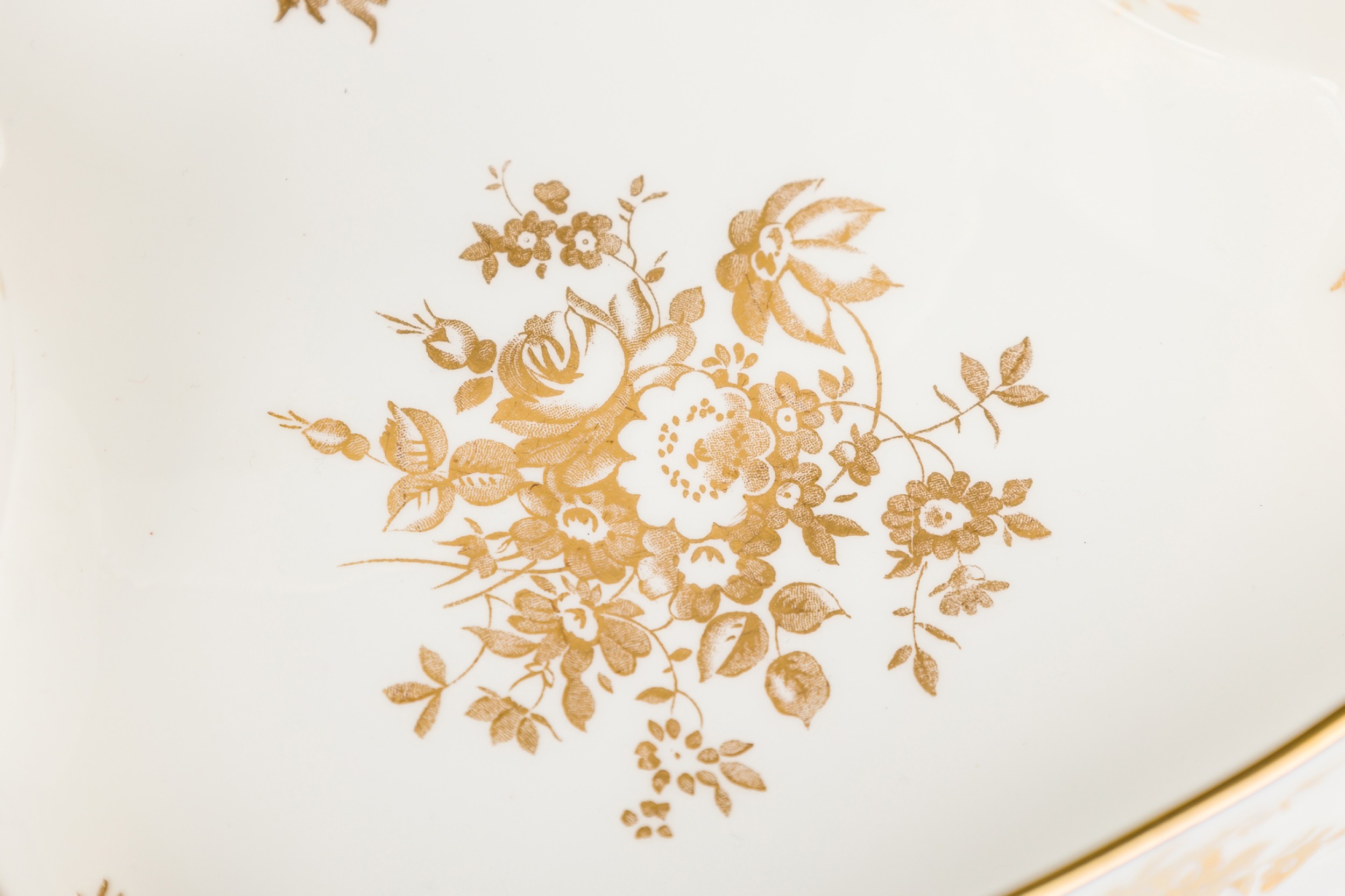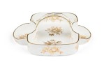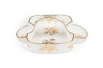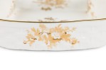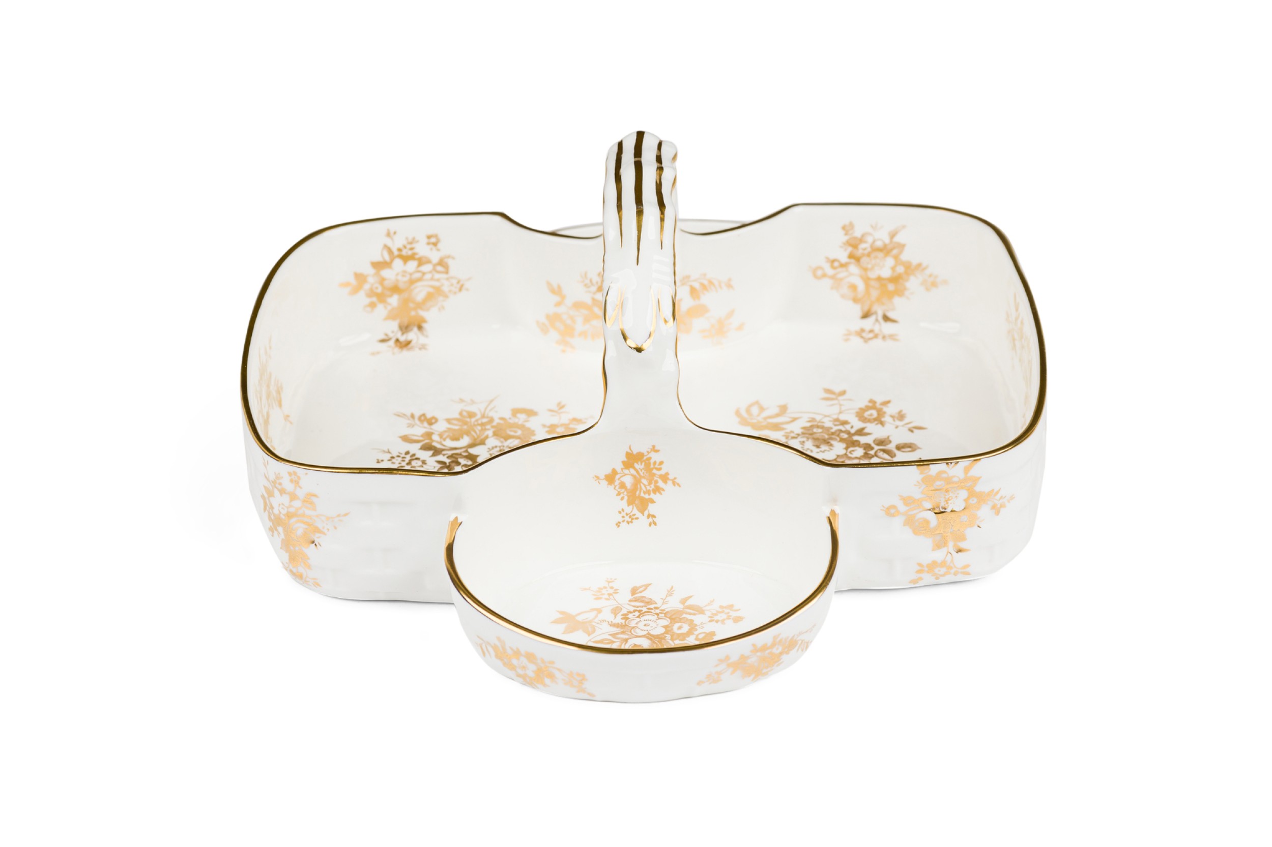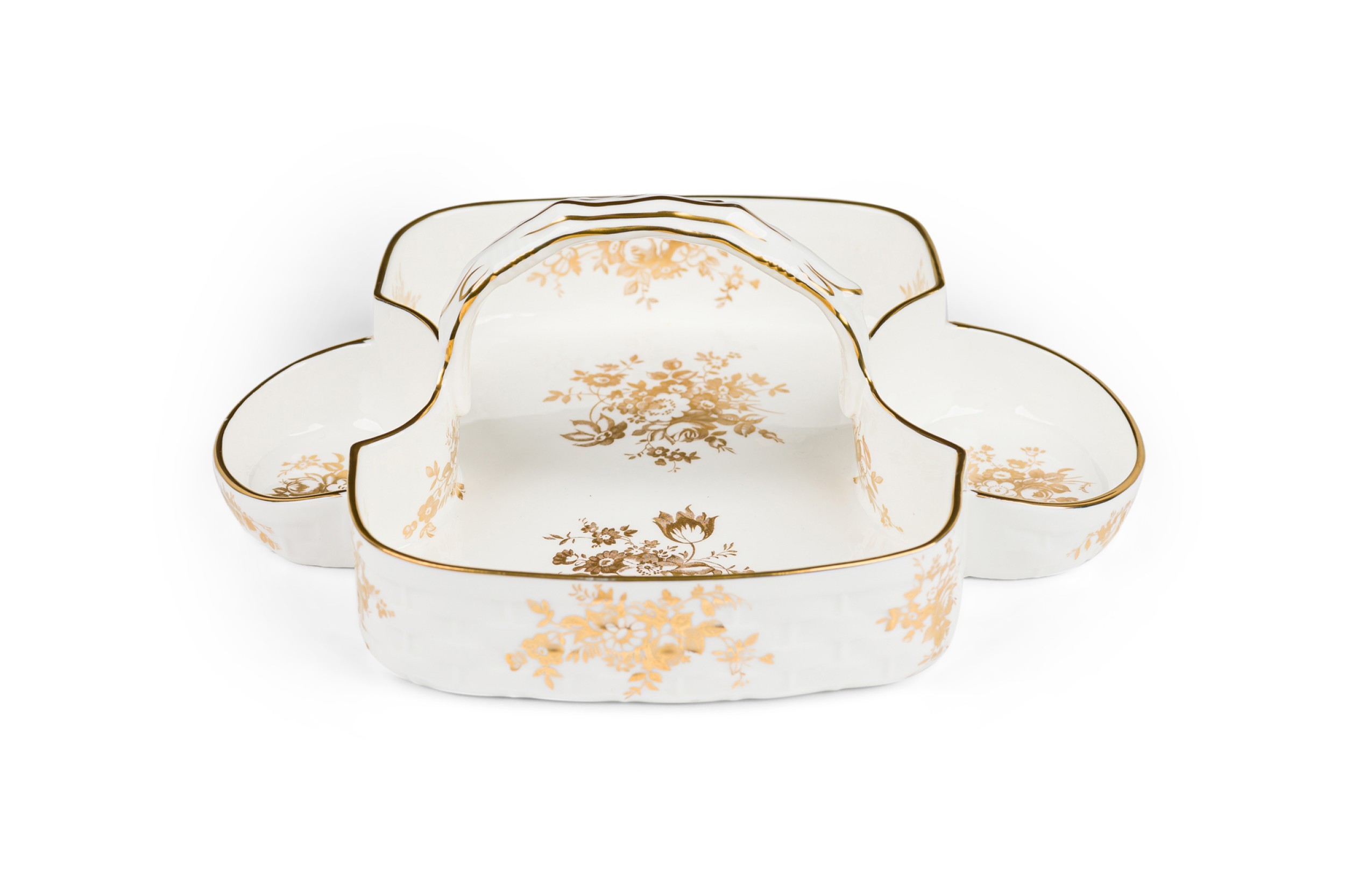 English style Mid-Century white ceramic picnic tray complote with gold floral decoration and having 2 small sections on each end of handle (HAMMERSLEY COMPANY FOR TIFFANY & CO)