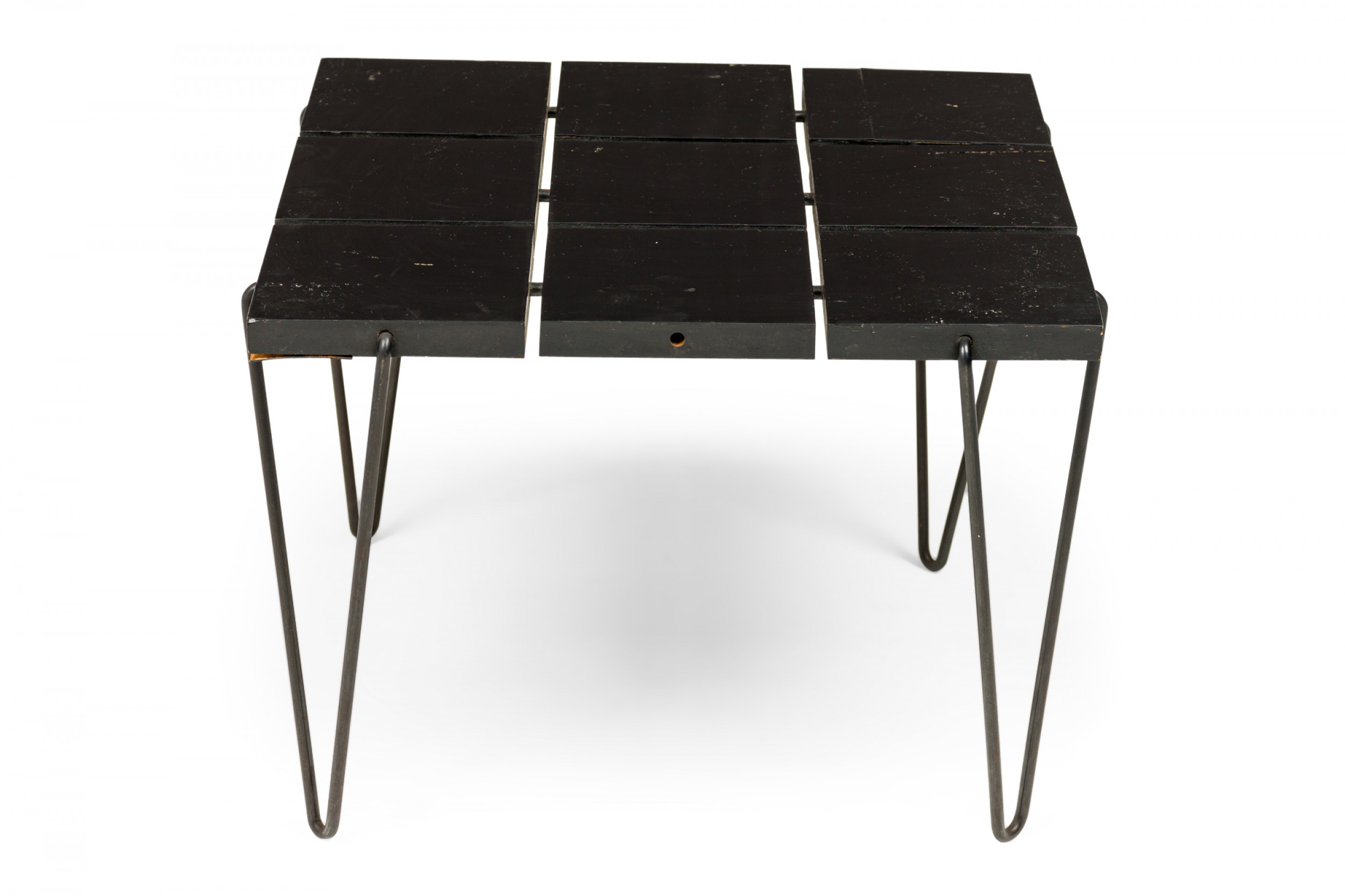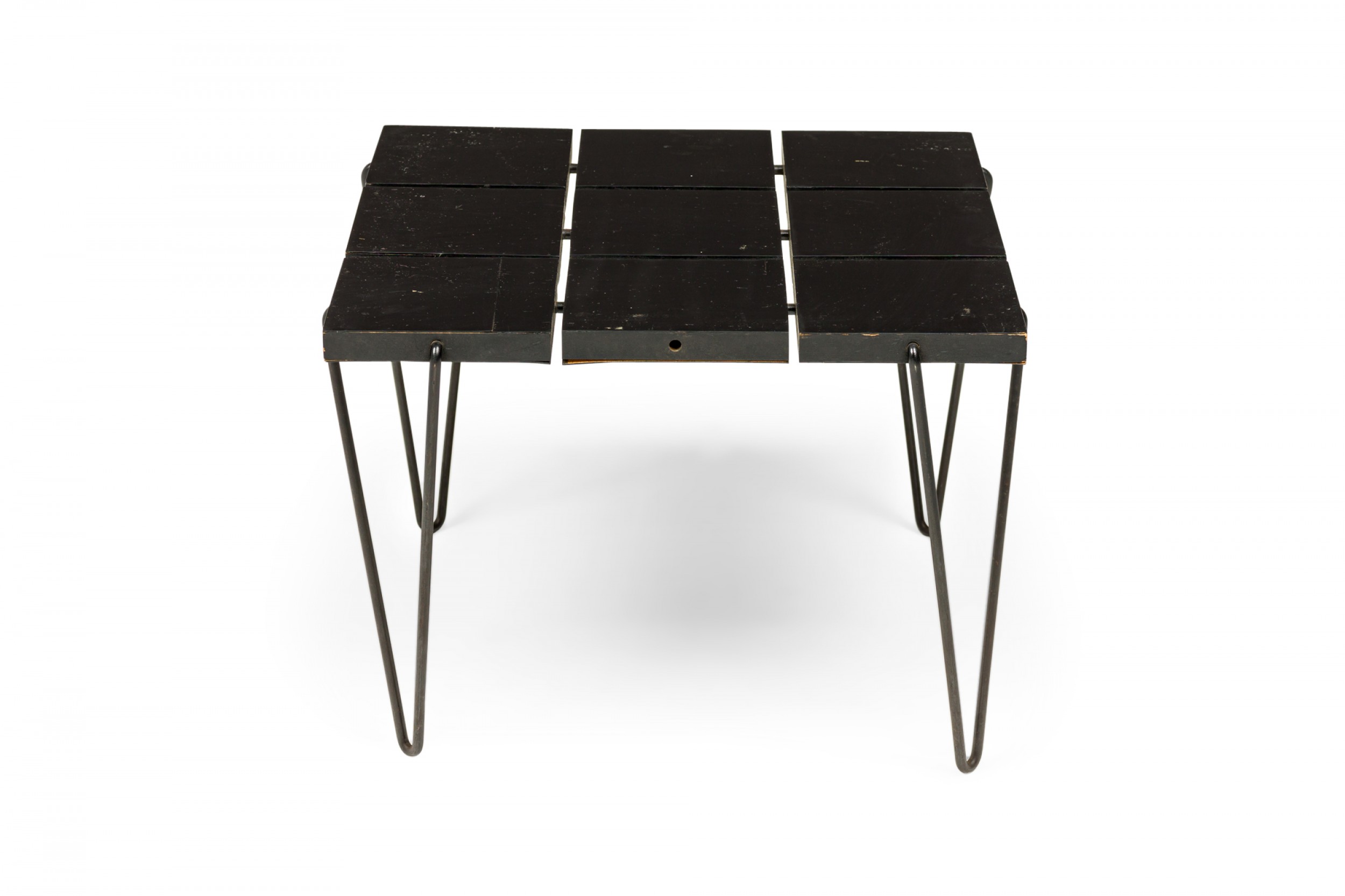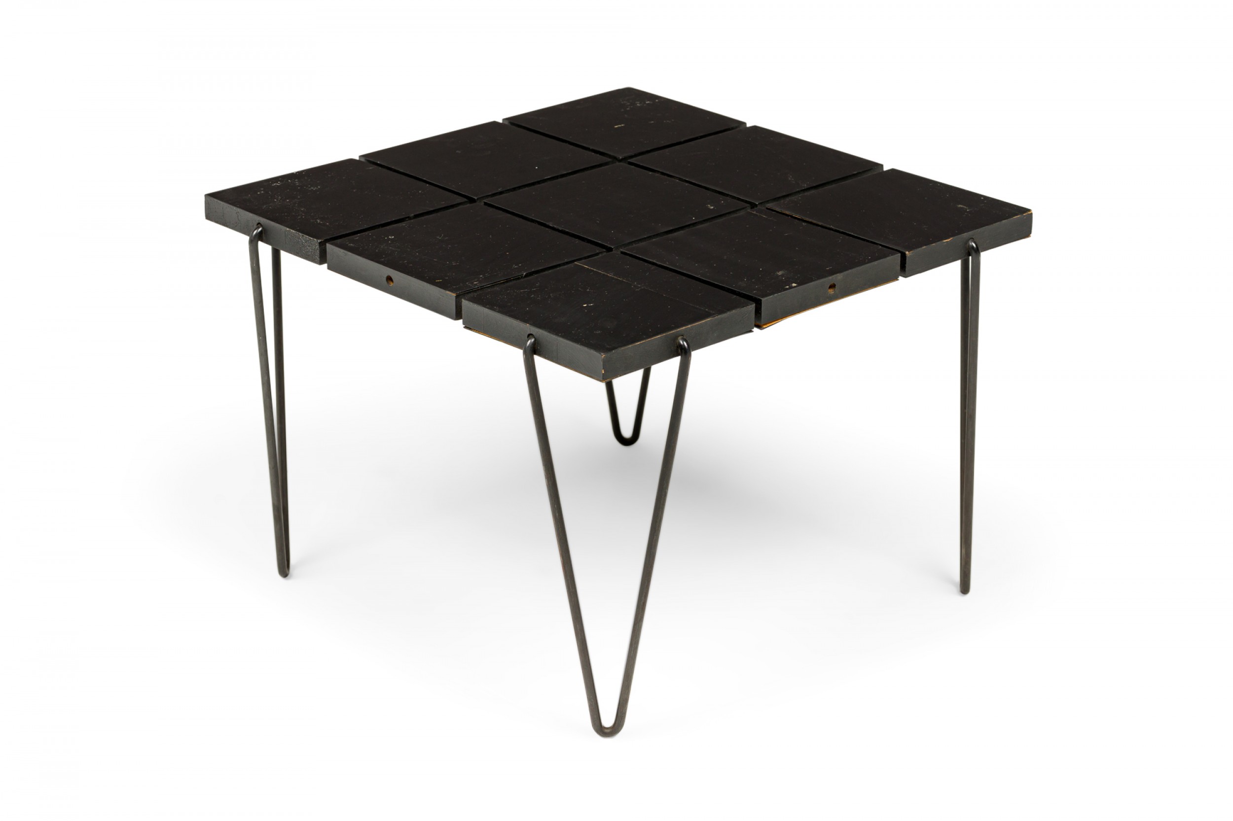 American Mid-Century end / side table with a top comprised of nine ebonized wooden square pieces connected by a flexible wire frame, resting on four black hairpin wire legs. (TONY PAUL)