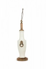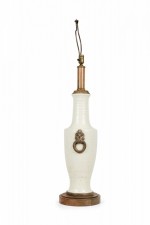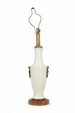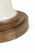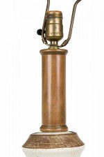Style: Mid-Century Materials & Techniques: Brass, ceramic, metal, wood Category: Lighting Condition: 46" height with harp, loose wood stem & vase dismounted. Electrics working. Ships without shade. Good; Wear consistent with age and use