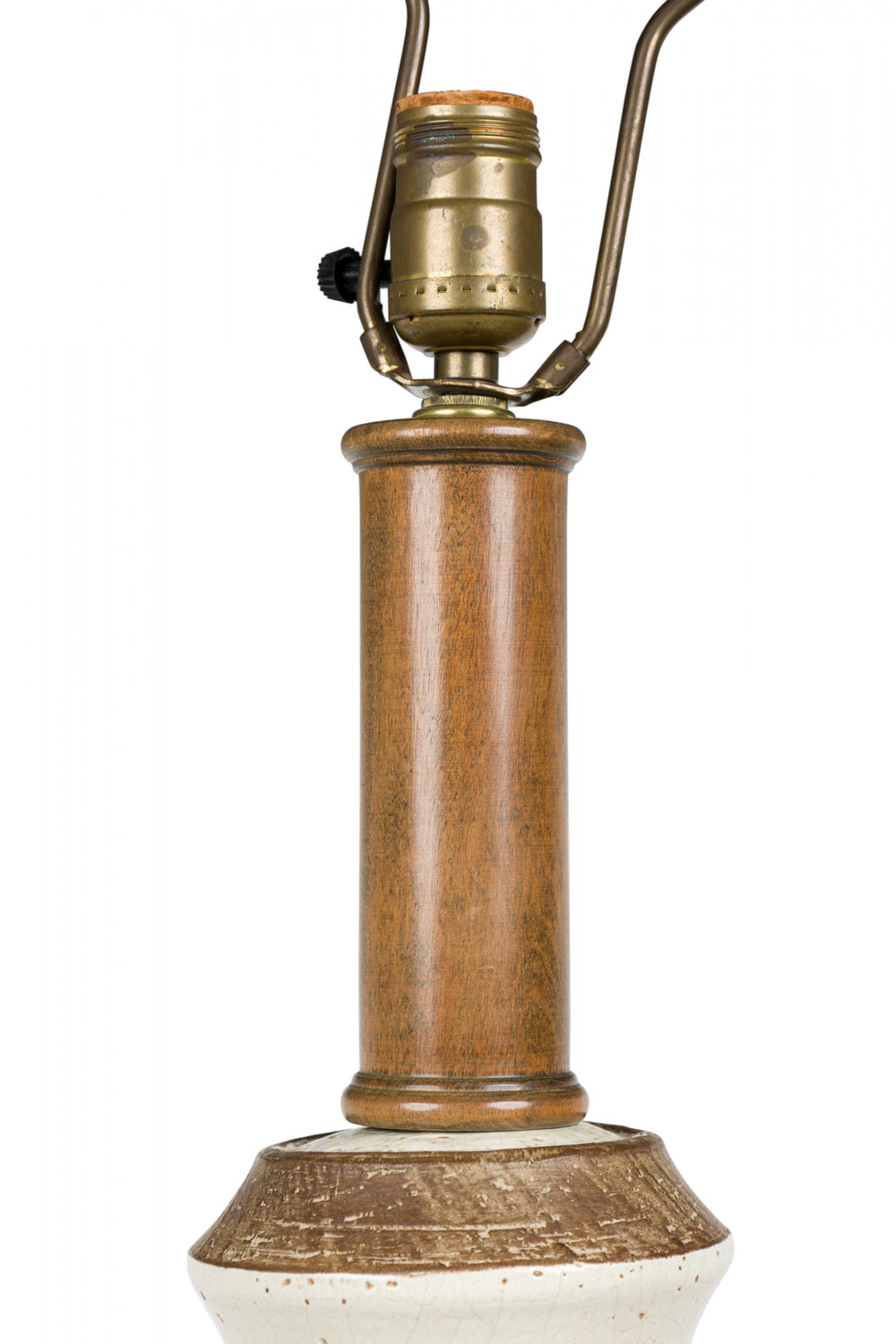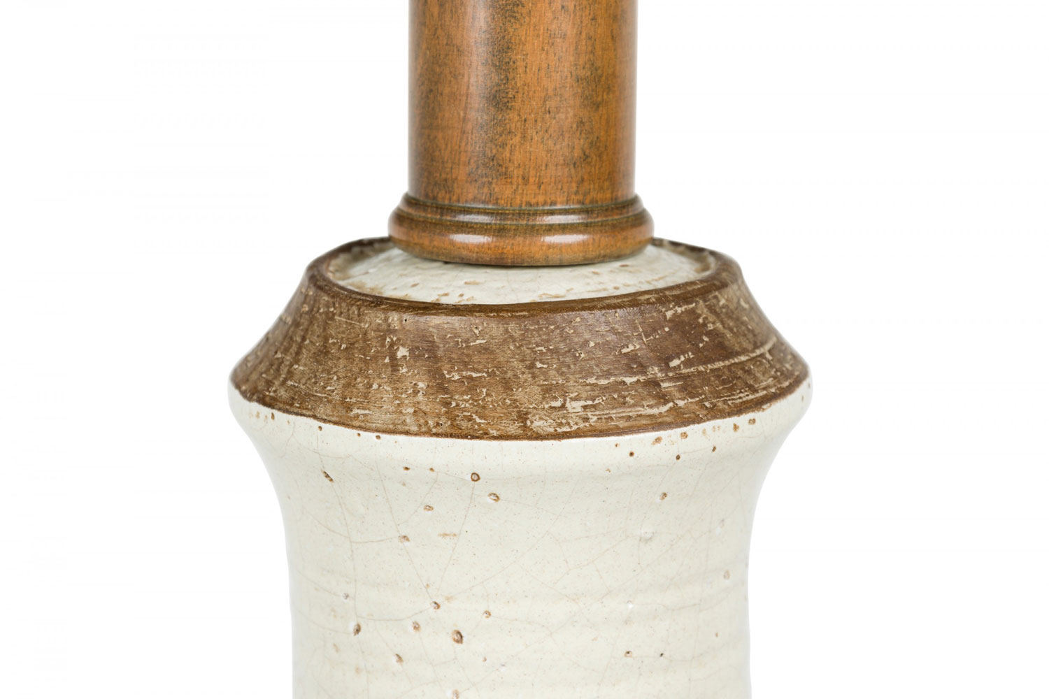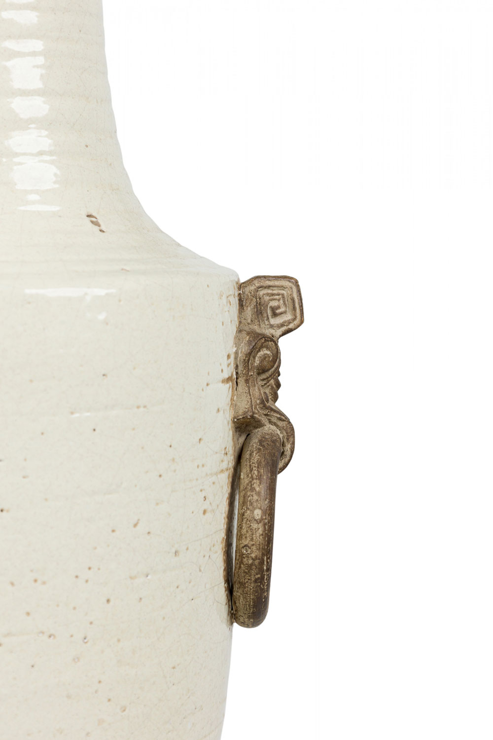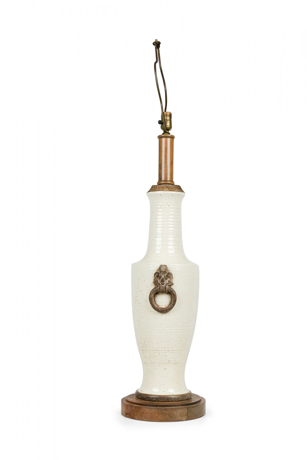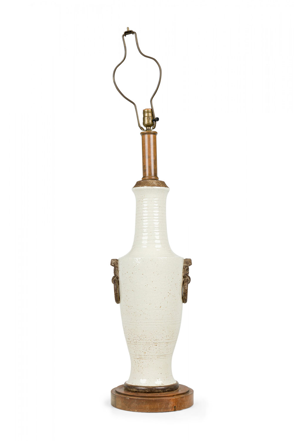 Mid-Century Italian ceramic tall urn table lamp in ovoid form Hollywood Regency Style with a flattened concave neck and tapered ringed top, turned wood stem and functioning brass light switch socket plus harp, the glossy white crackle-glazed body featuring a subtle ringed texture, flanked by faux mask ring handles fired in a matte oatmeal glaze, flaring out toward bottom to a ring foot and mounted on a stepped circular, light veneered wood base. (UGO ZACCAGNINI) (Similar piece: DUL0091)
