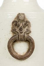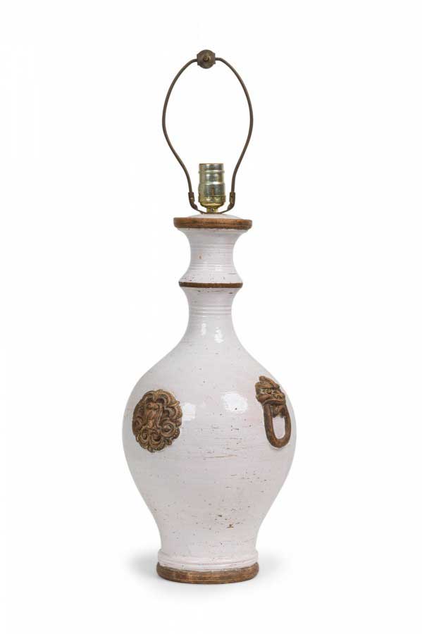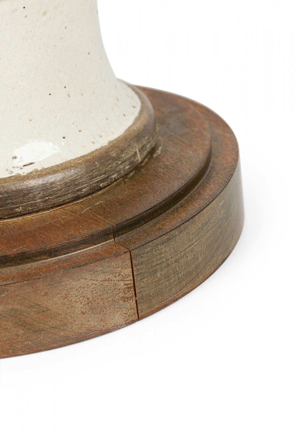 Mid-Century Italian ceramic tall urn table lamp in ovoid form Hollywood Regency Style with a flattened concave neck and tapered ringed top, turned wood stem and functioning brass light switch socket plus harp, the glossy white crackle-glazed body featuring a subtle ringed texture, flanked by faux mask ring handles fired in a matte oatmeal glaze, flaring out toward bottom to a ring foot and mounted on a stepped circular, light veneered wood base. (UGO ZACCAGNINI) (Similar piece: DUL0091).