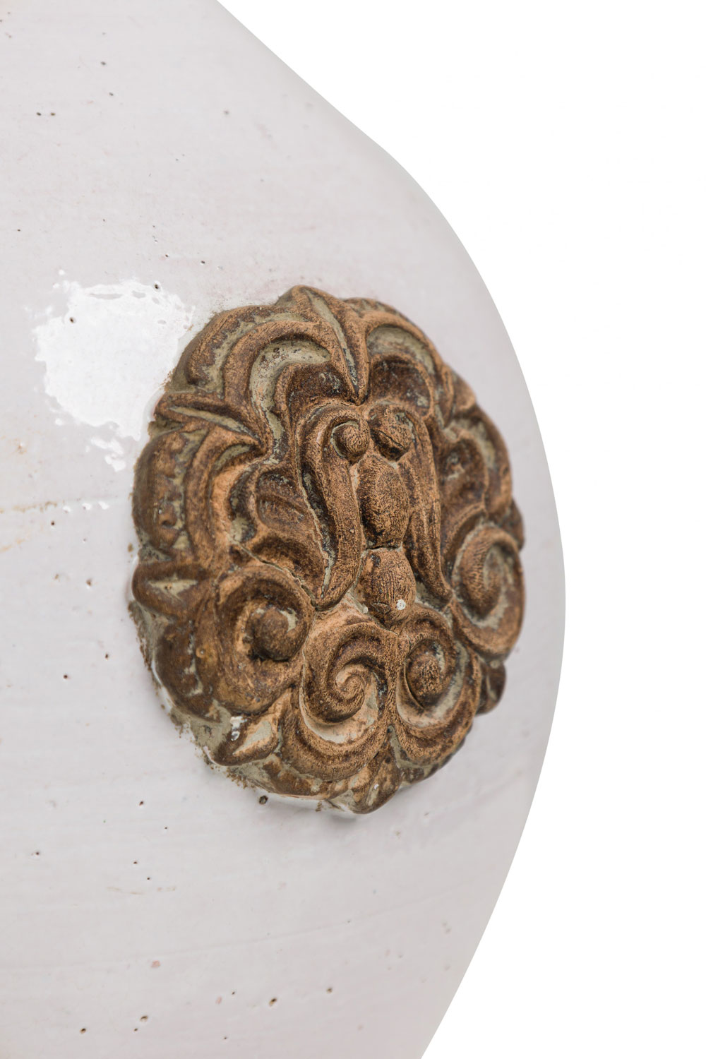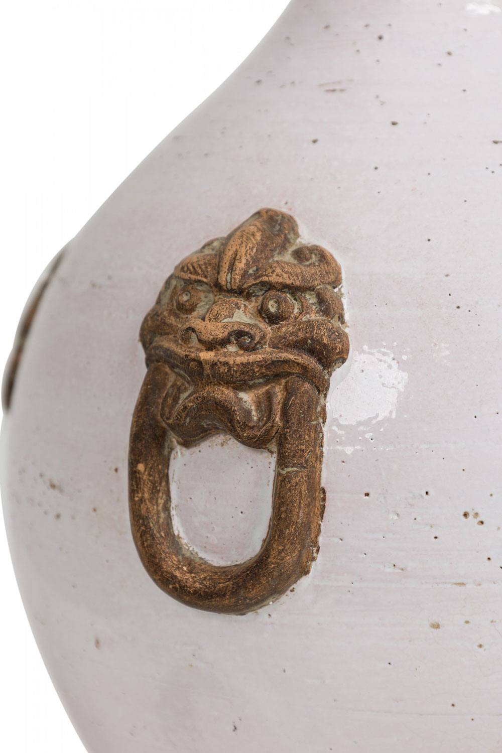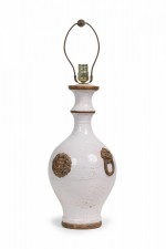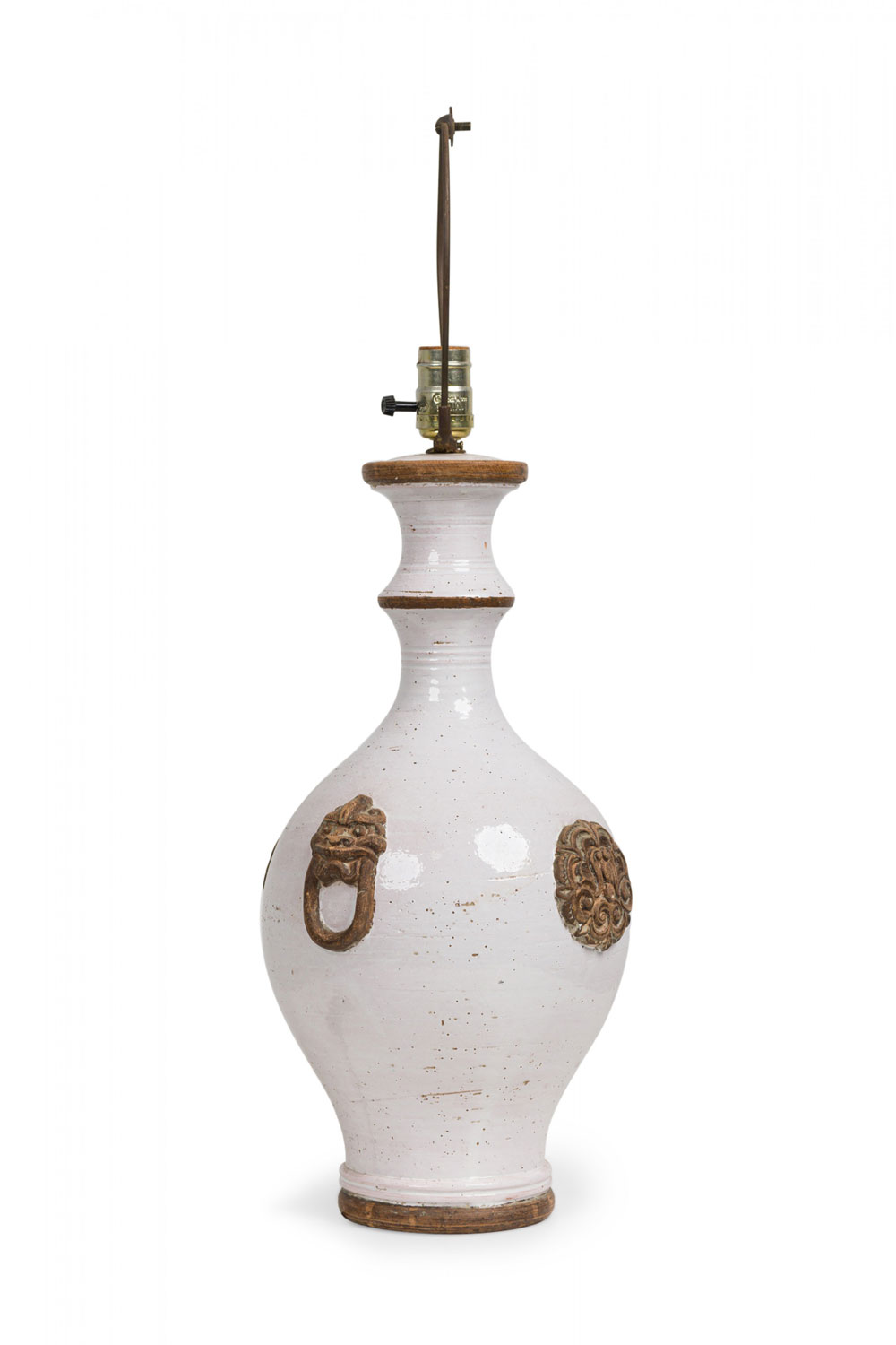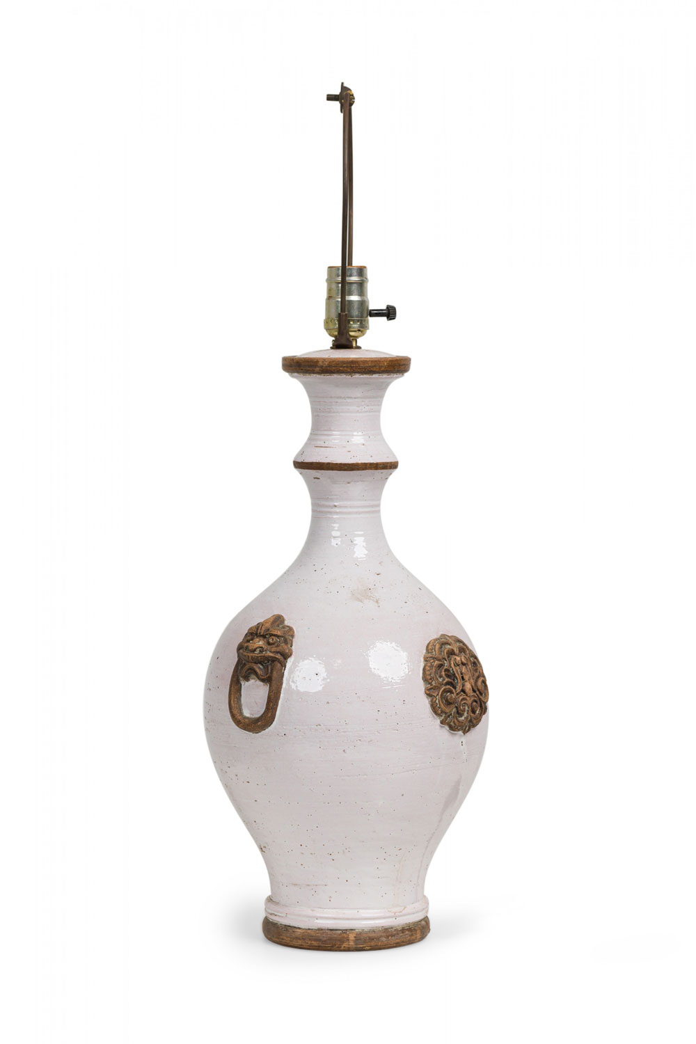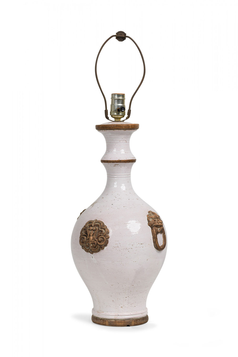 Mid-Century Italian ceramic urn / vase form table lamp in Hollywood Regency Style baluster form featuring a double waisted neck with two matte oatmeal glazed rims, leading to a functioning brass light switch socket and harp, the body fired in a glossy white glaze and decorated with two oatmeal glazed faux mask ring handles plus two scroll medallions, resting on a ringed foot. (UGO ZACCAGNINI) (Similar piece: DUL0089)
