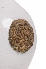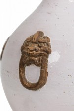 Mid-Century Italian ceramic urn / vase form table lamp in Hollywood Regency Style baluster form featuring a double waisted neck with two matte oatmeal glazed rims, leading to a functioning brass light switch socket and harp, the body fired in a glossy white glaze and decorated with two oatmeal glazed faux mask ring handles plus two scroll medallions, resting on a ringed foot. (UGO ZACCAGNINI) (Similar piece: DUL0089).