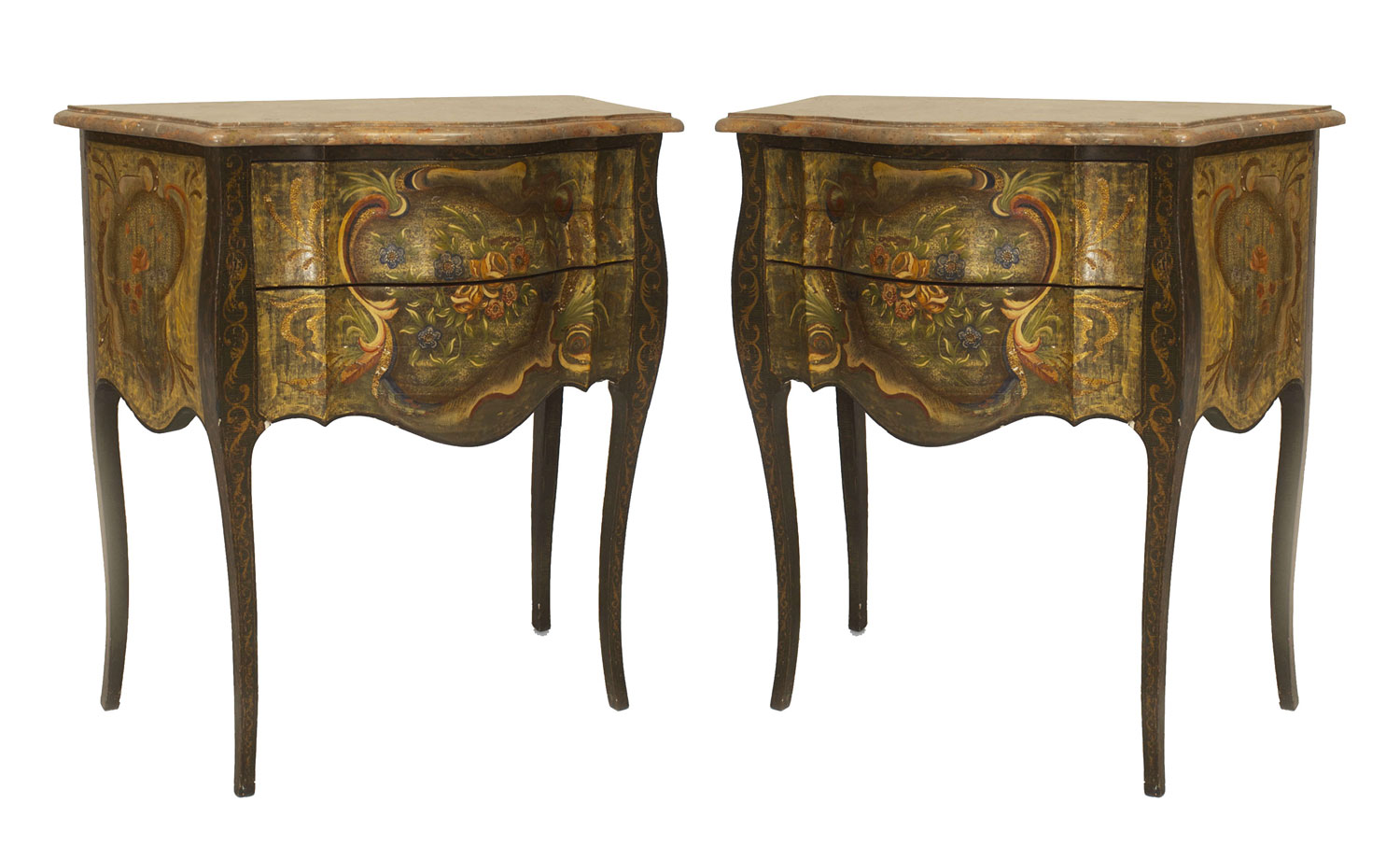 Pair of Venetian Floral Painted & Marble Top Commodes