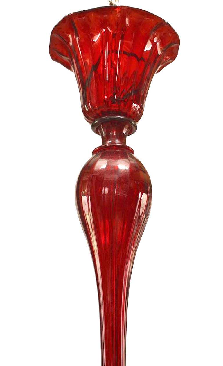 Venetian Murano ruby red colored fluted glass 6 arm chandelier with flared design cup shades and shaped stem with finial drop at bottom.
