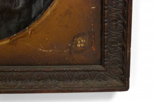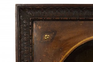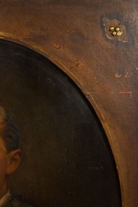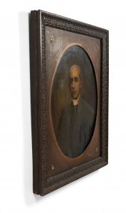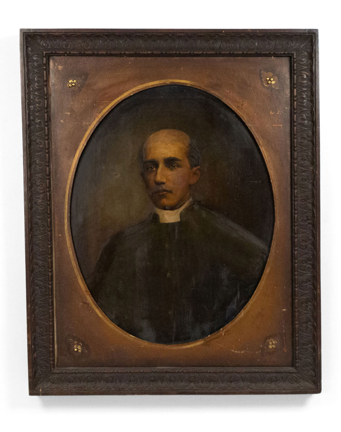 Wood carved framed oval oil painting portrait of balding man with collar..