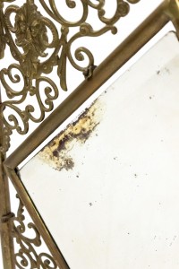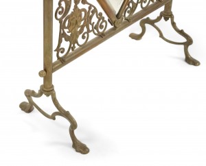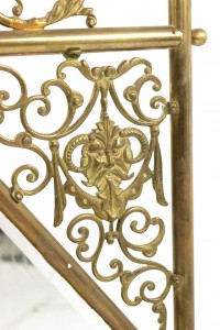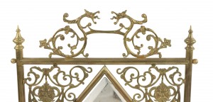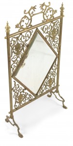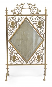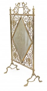 French Victorian brass fire screen with filigree design and diamond shaped mirror at center.