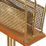 English Victorian brass and wood revolving book stand with 3 brass mesh divider sections on brass tripod base..