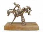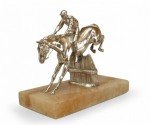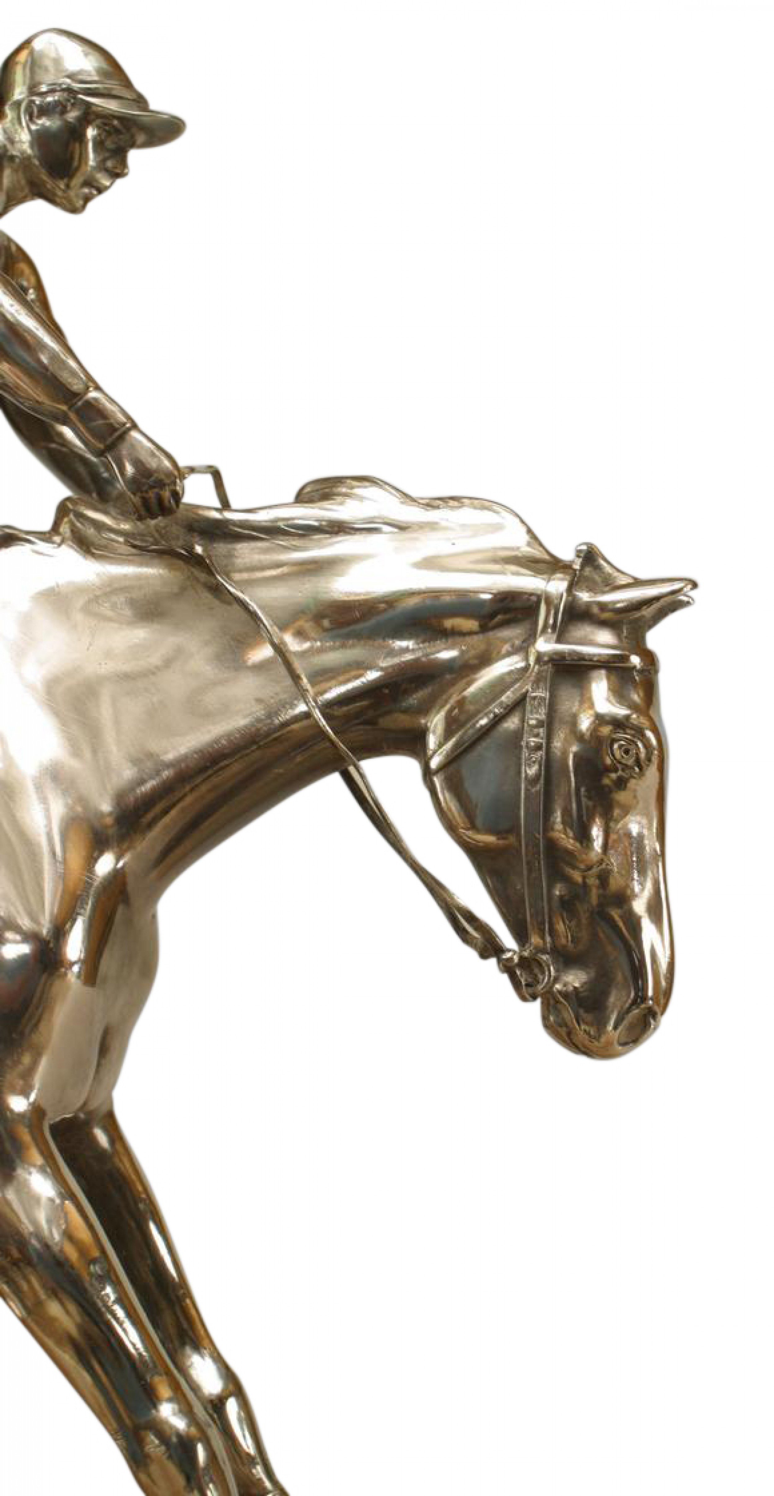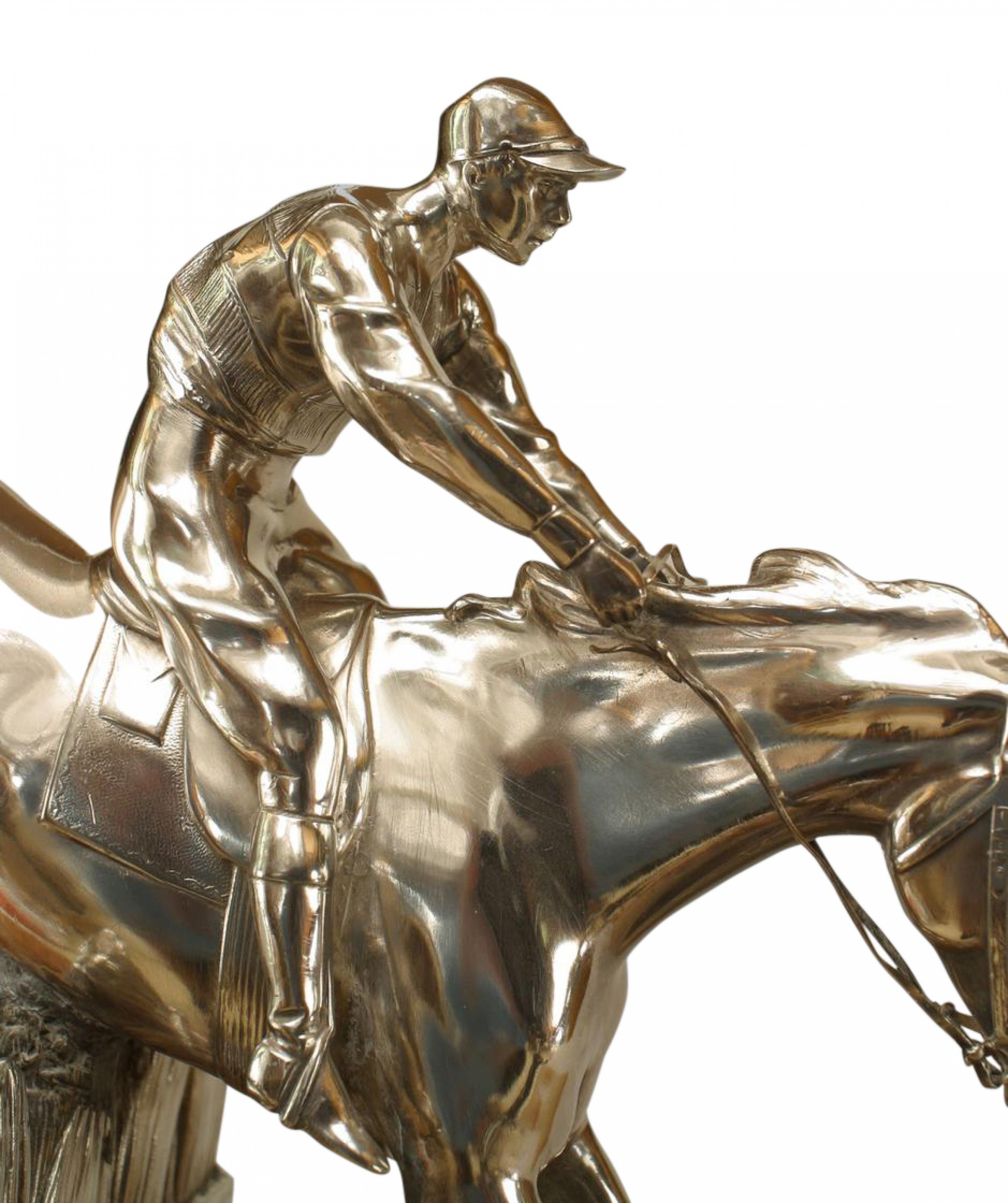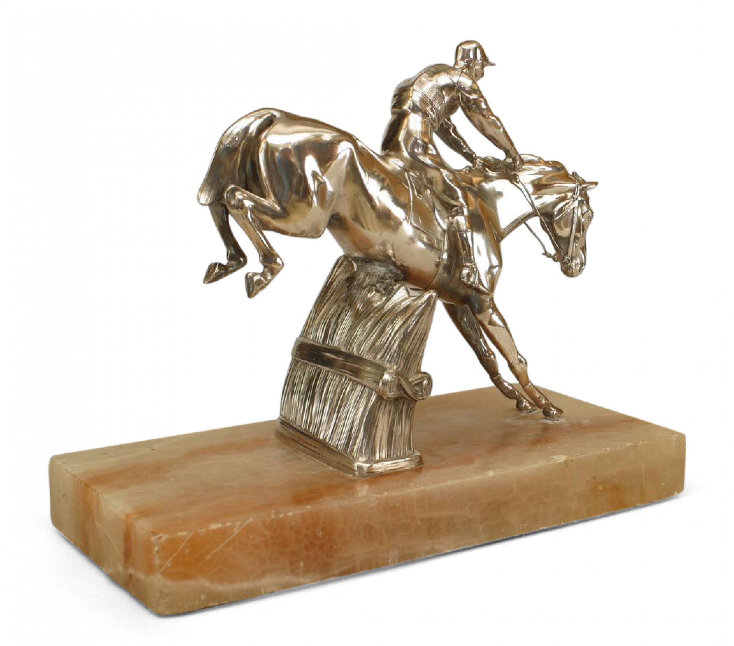 English Victorian silver plated bronze figure of horse and jockey jumping grass fence on white onyx rectangular shaped base