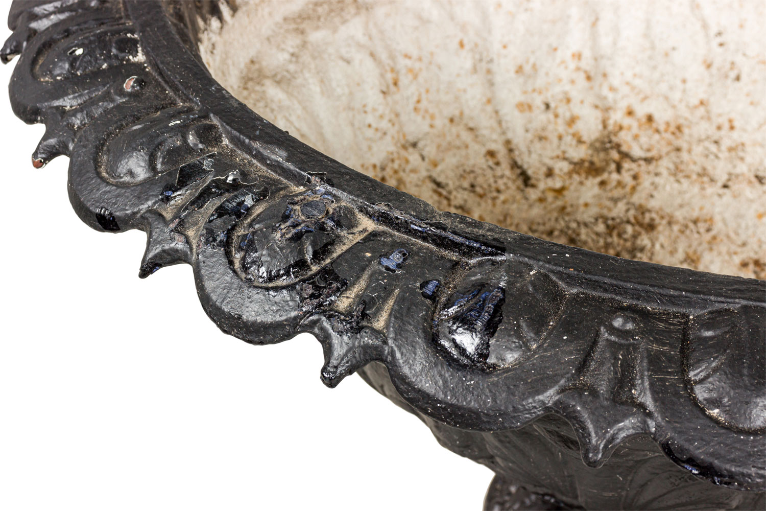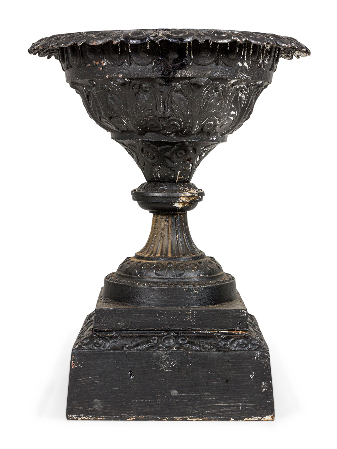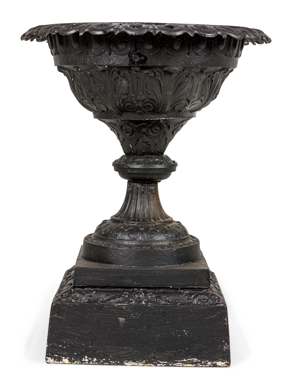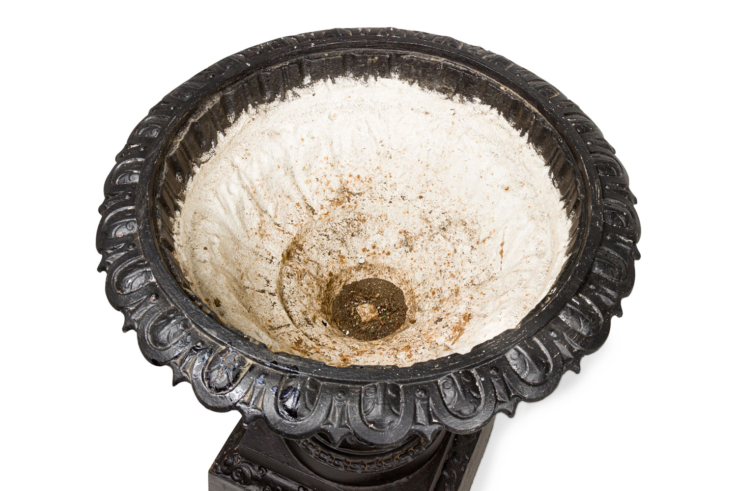 PAIR of American Victorian black painted cast iron outdoor urns with scalloped round edge raised on a separate square base.