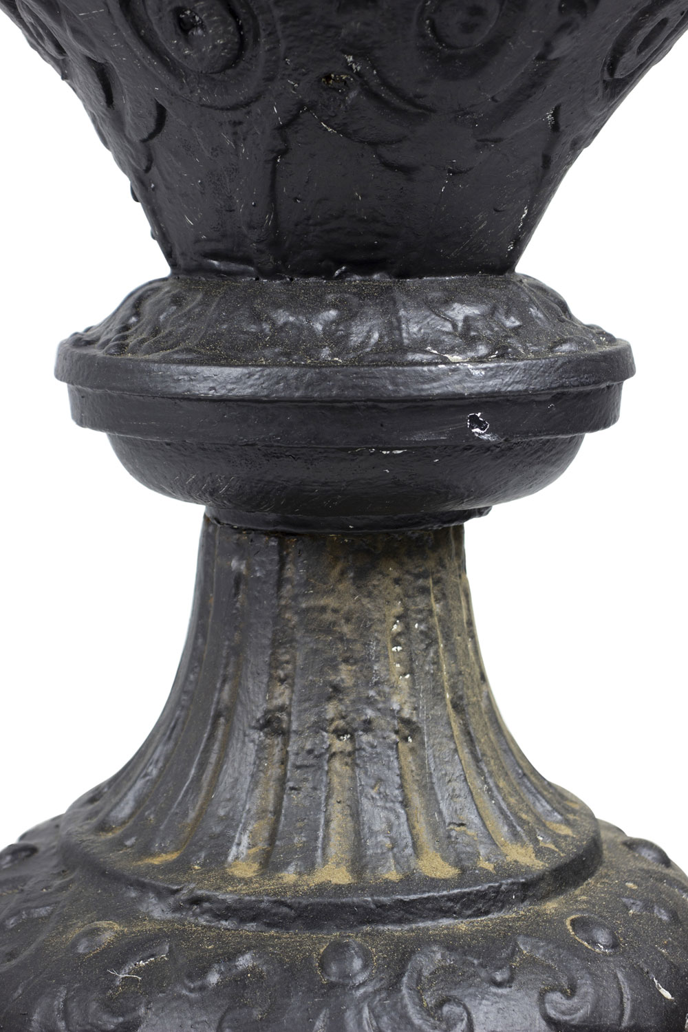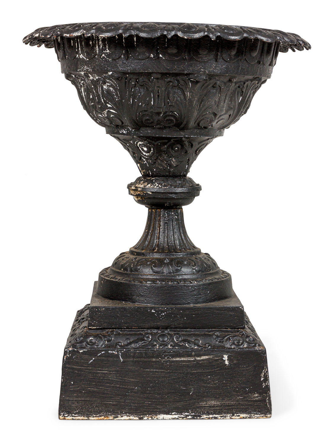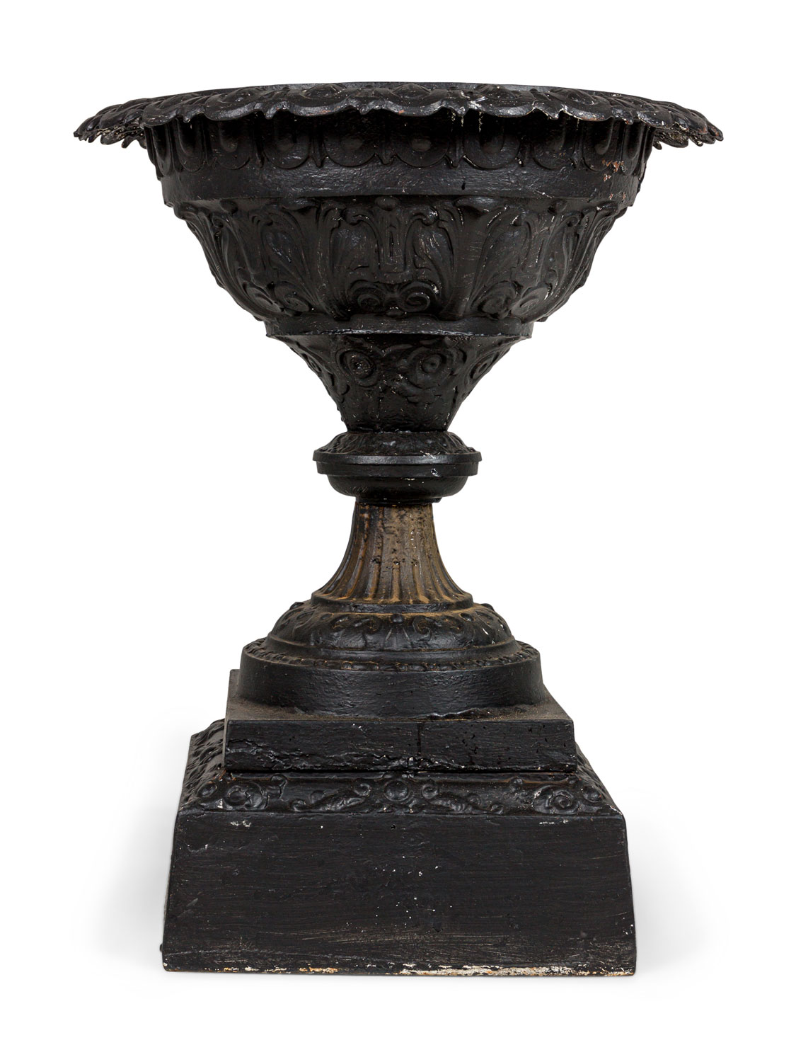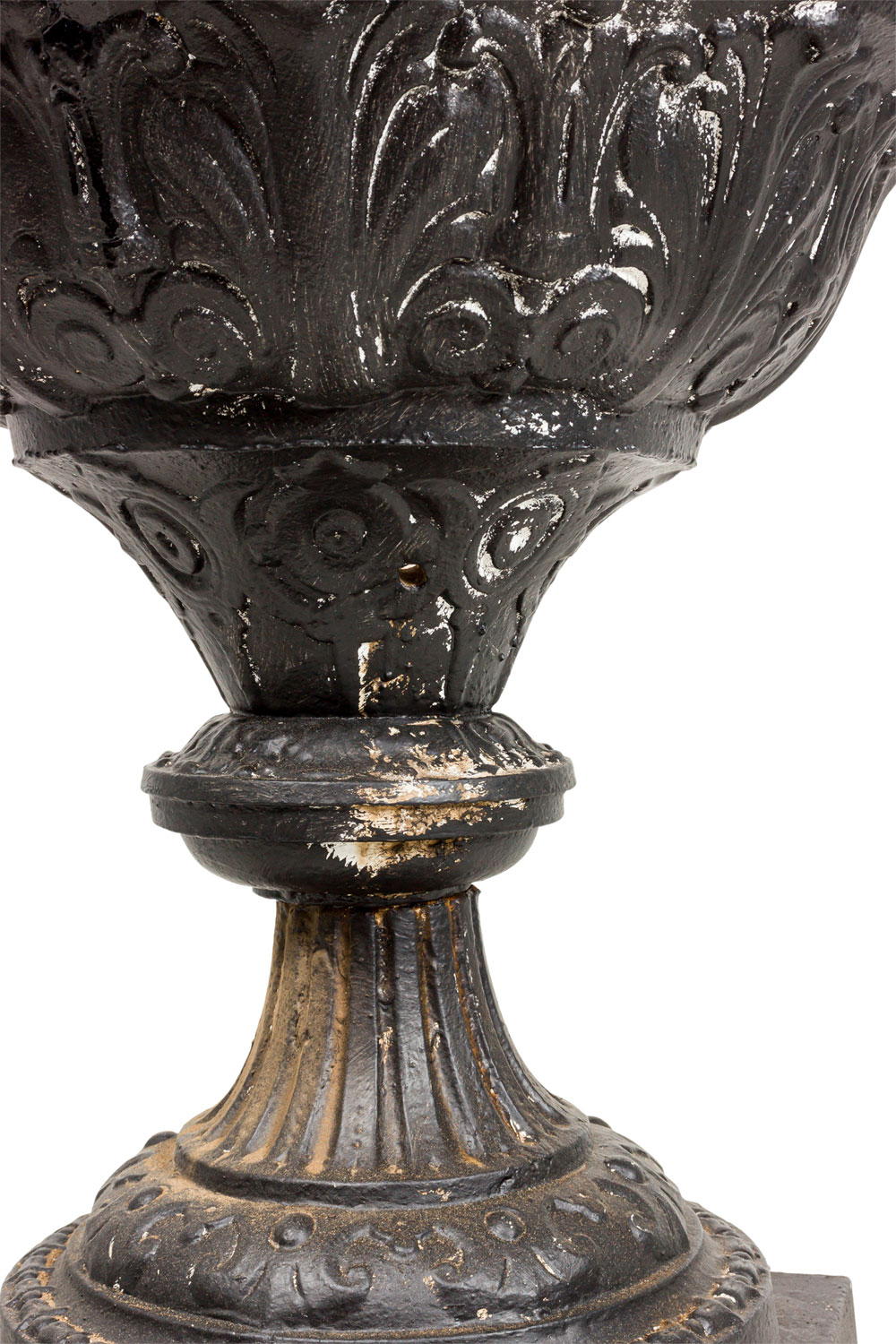 PAIR of American Victorian black painted cast iron outdoor urns with scalloped round edge raised on a separate square base.
