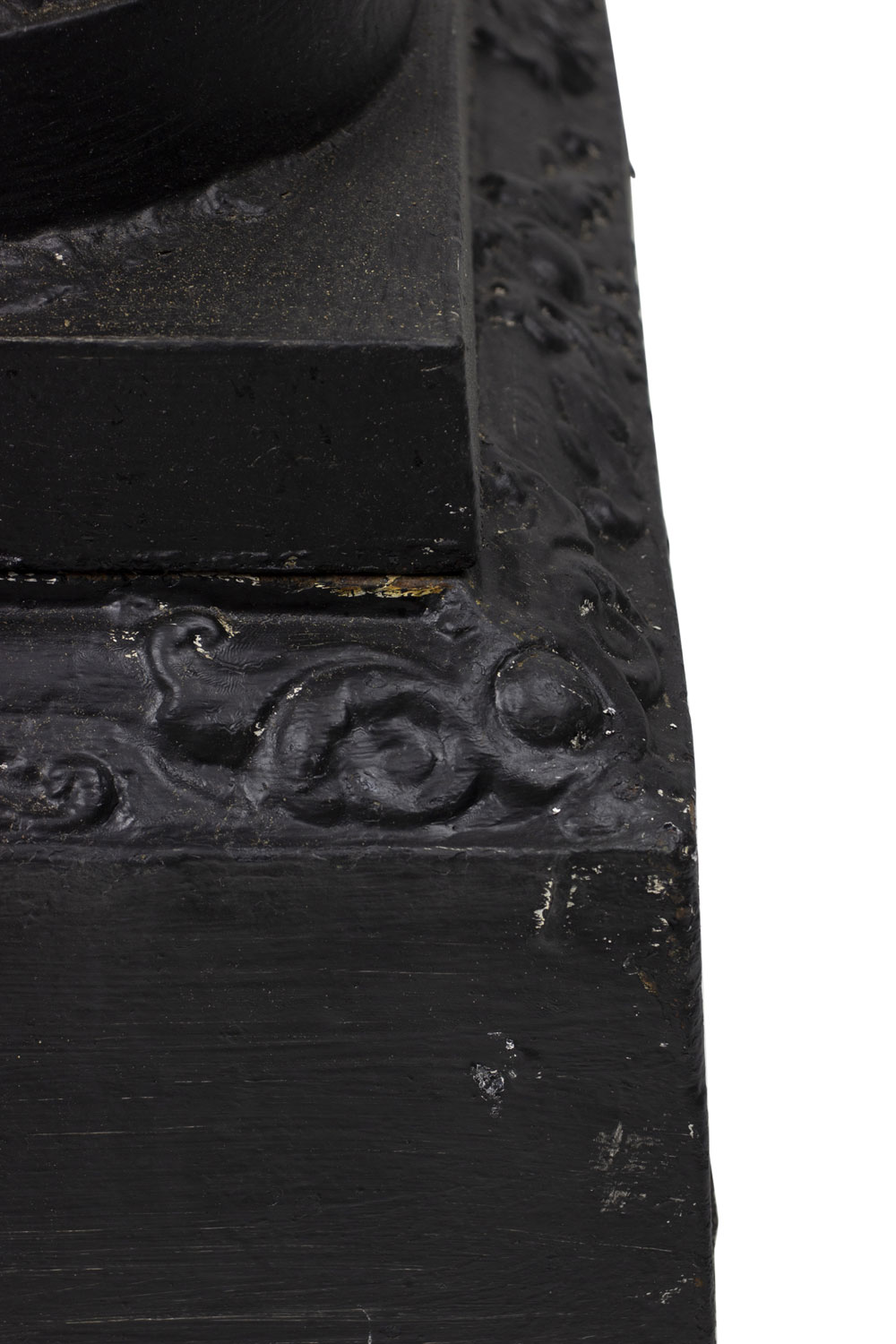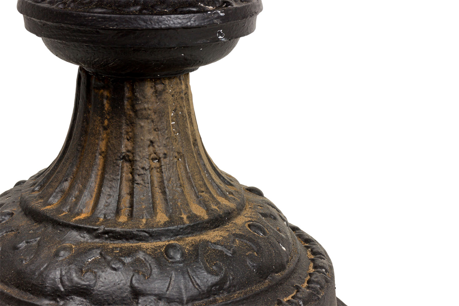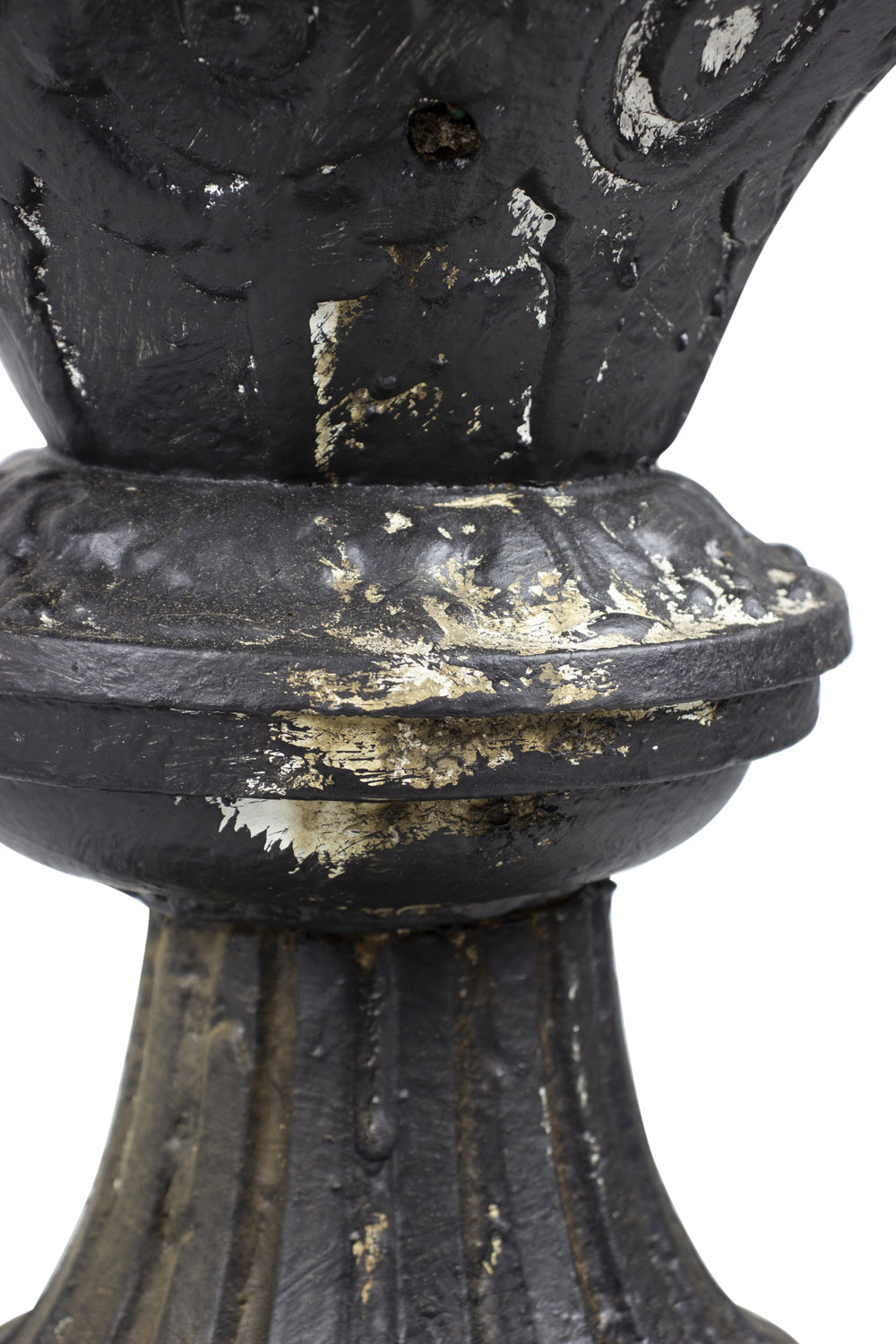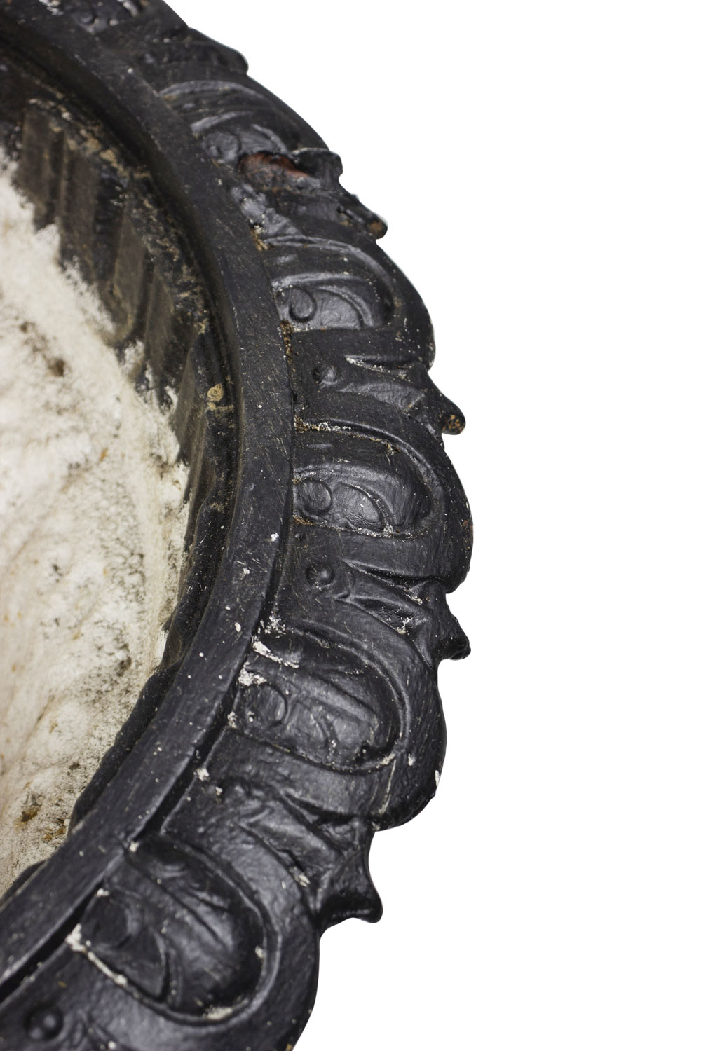 PAIR of American Victorian black painted cast iron outdoor urns with scalloped round edge raised on a separate square base.