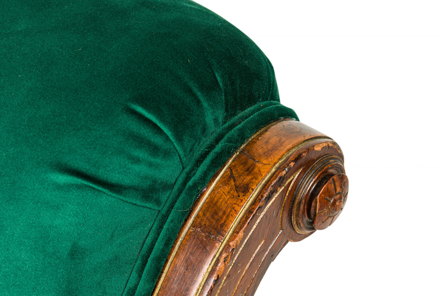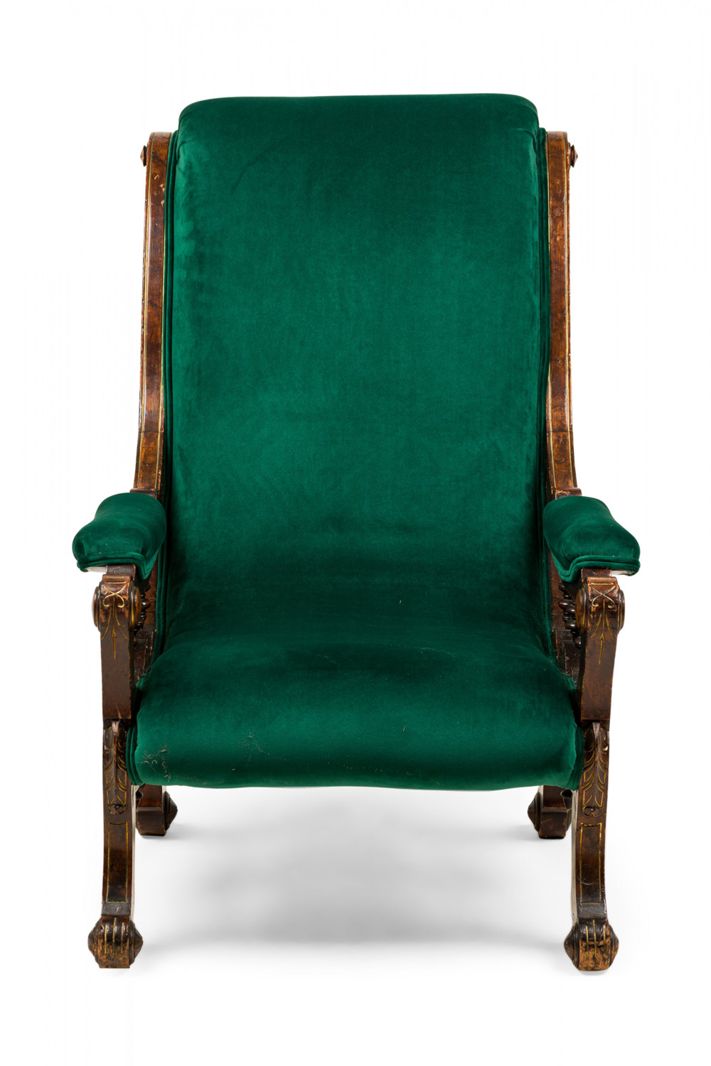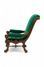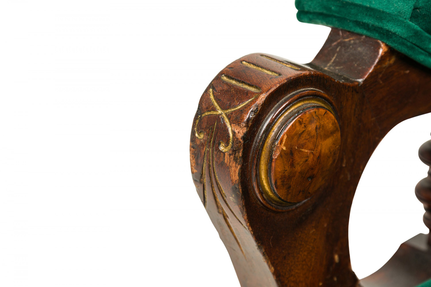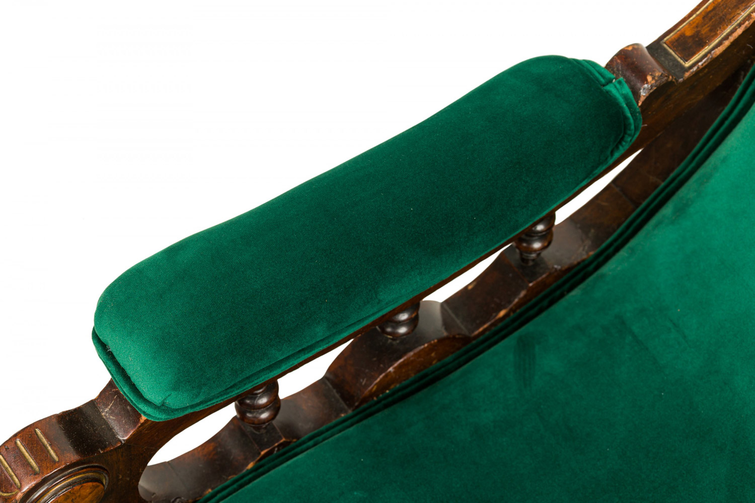 American Victorian Eastlake-style burl walnut and gilt trimmed sleigh back armchair with green colored upholstery. (Signed: HOSTATTER, Pat Pending, 4/3/1877)
