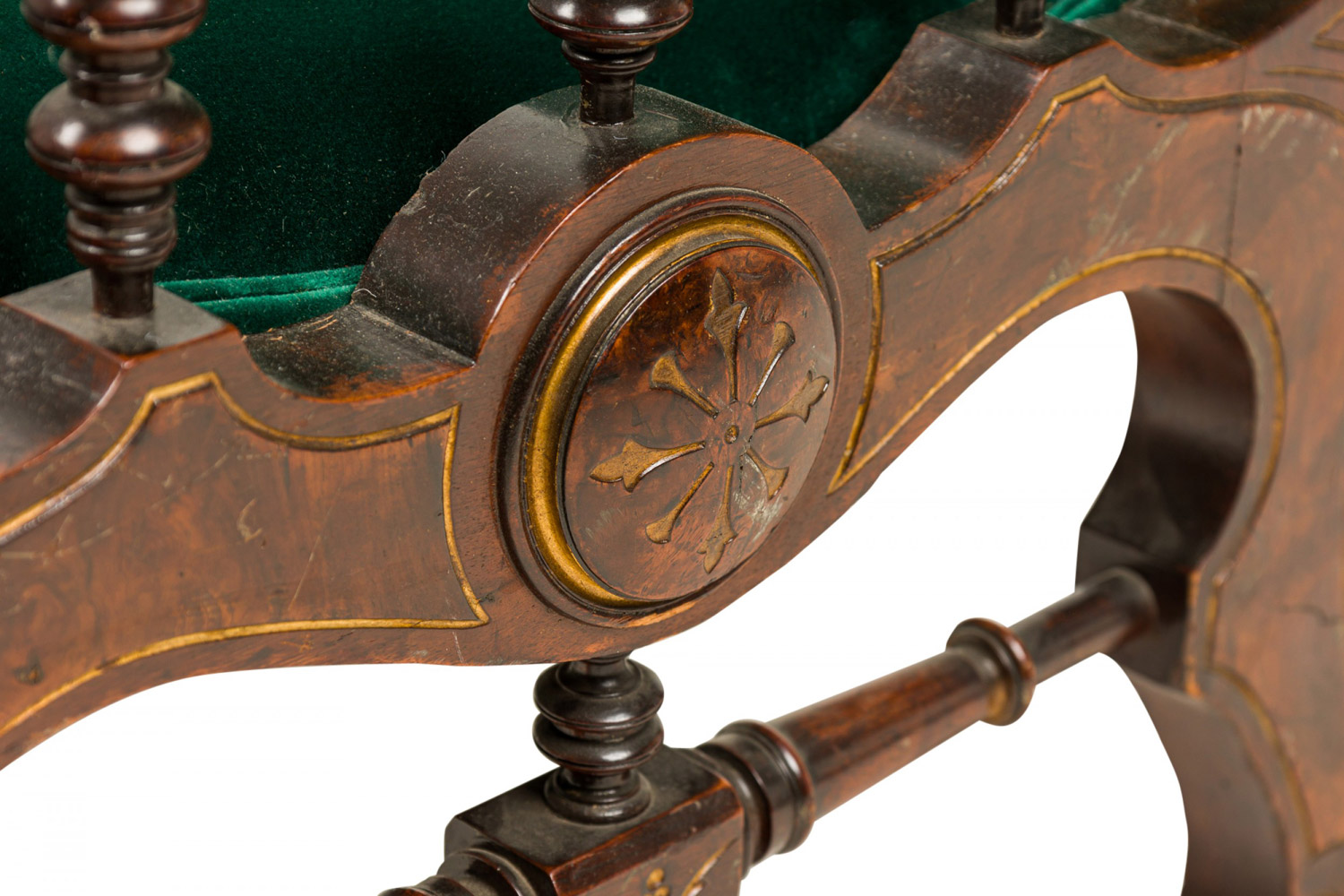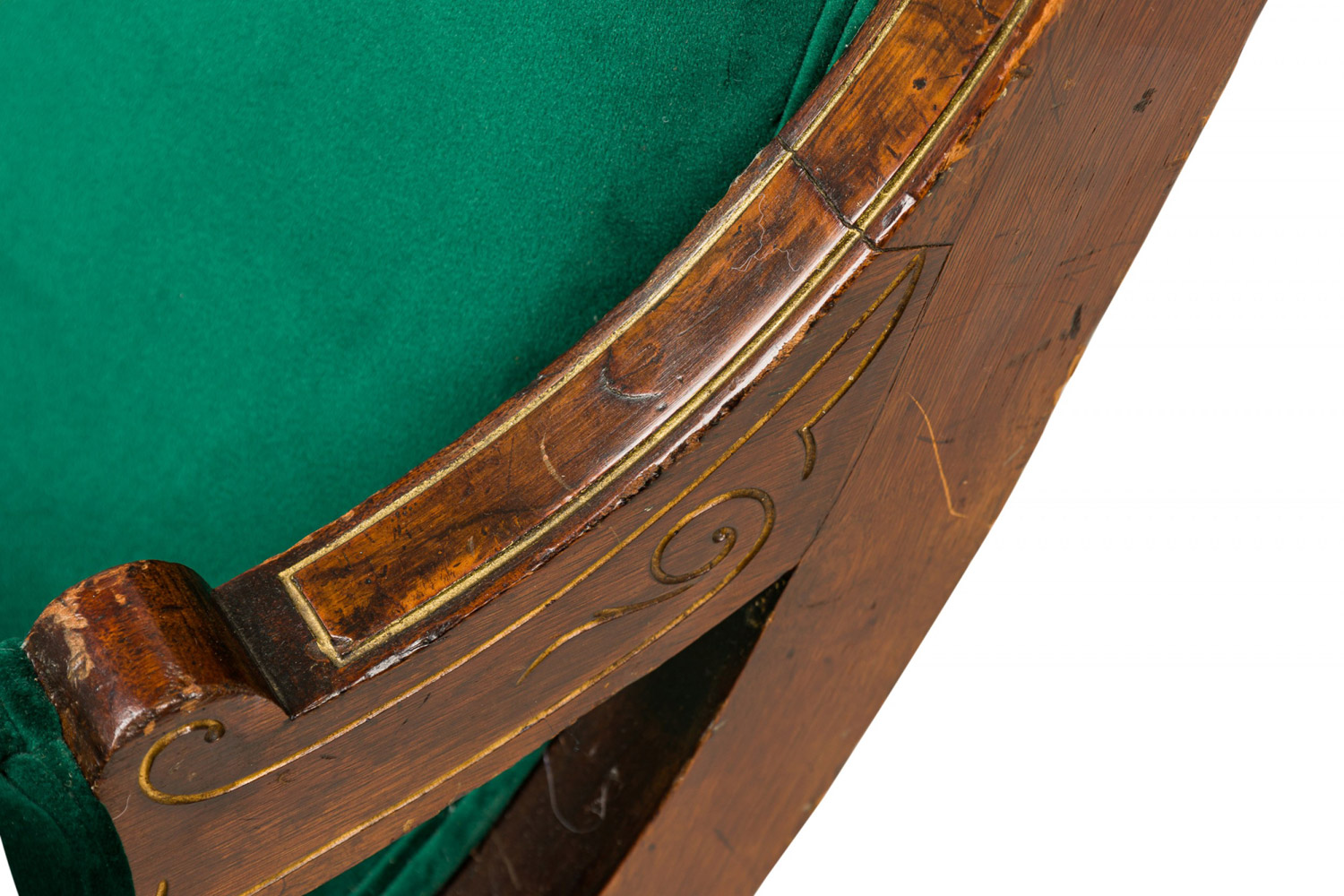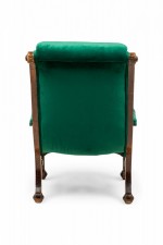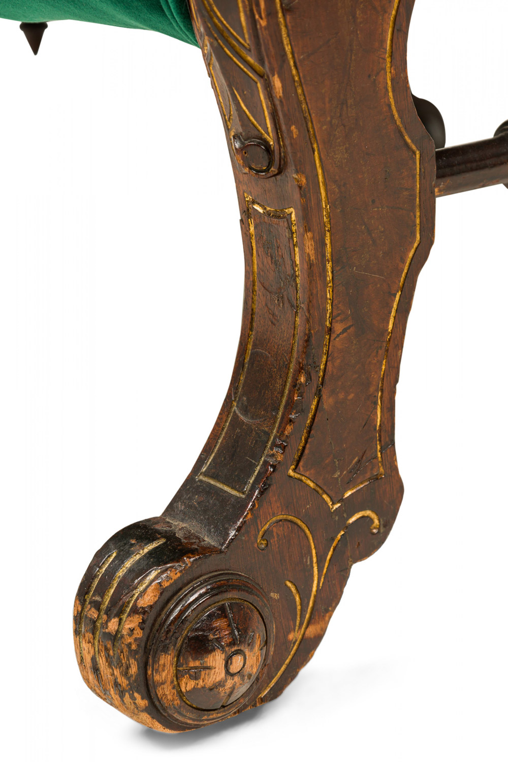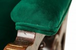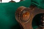 American Victorian Eastlake-style burl walnut and gilt trimmed sleigh back armchair with green colored upholstery. (Signed: HOSTATTER, Pat Pending, 4/3/1877)