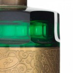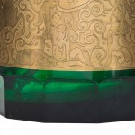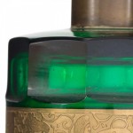 Vintage decagonal green-tinted glass perfume bottle with a gilded metal band featuring an embossed war scene around the middle and patinated brass diamond-shaped stopper.