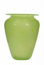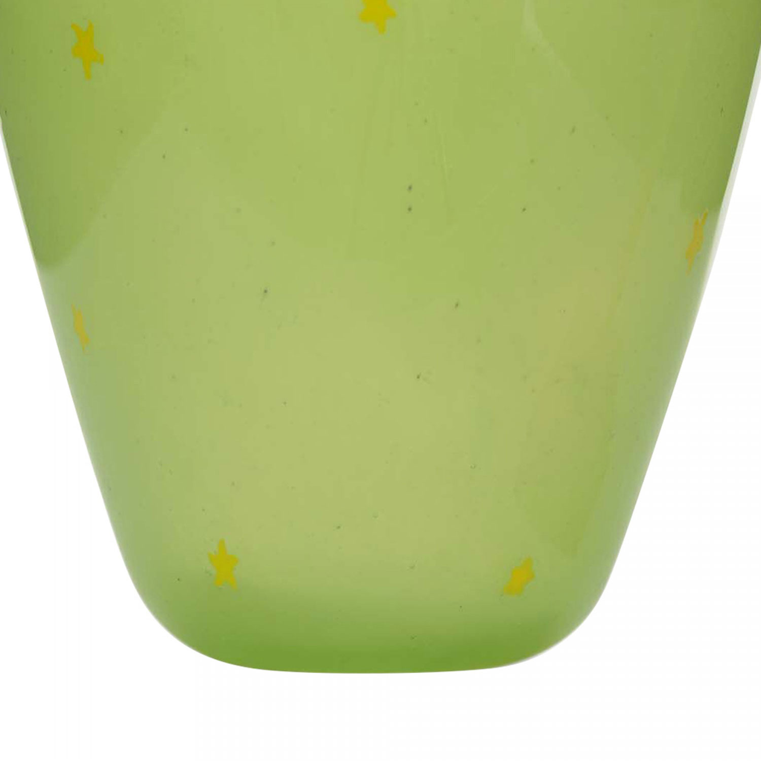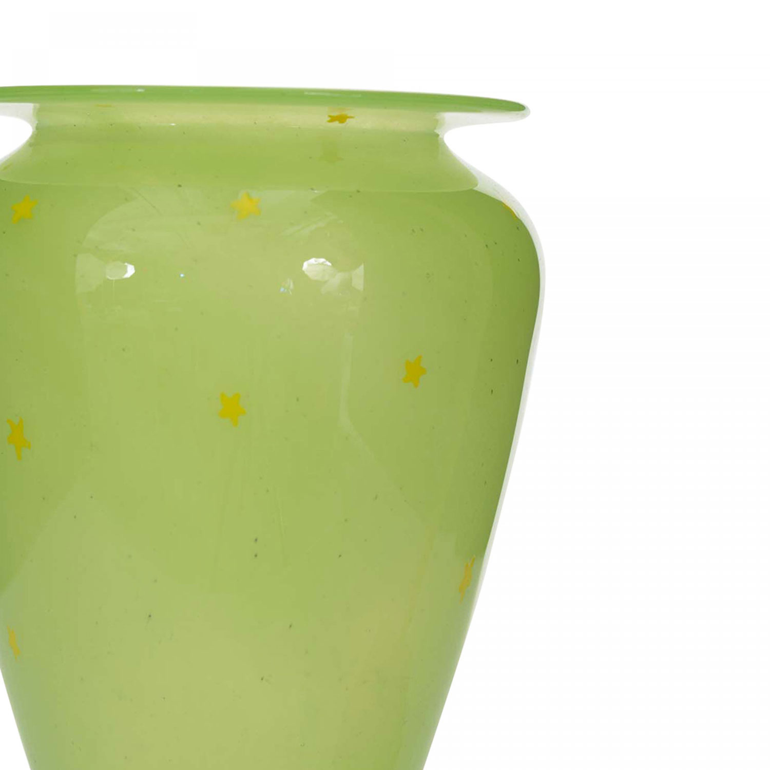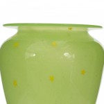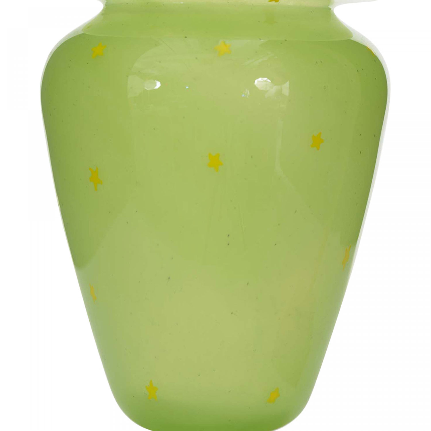 Vintage tapered green glass vase with a wide opening, a wide flat rim, and a yellow star pattern.