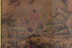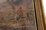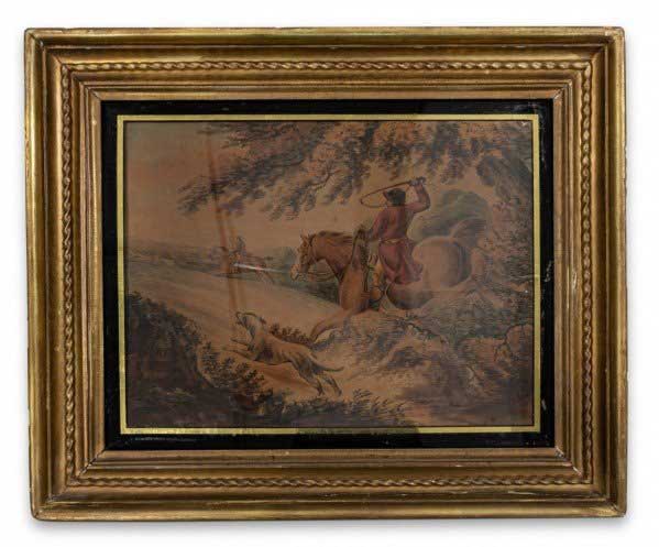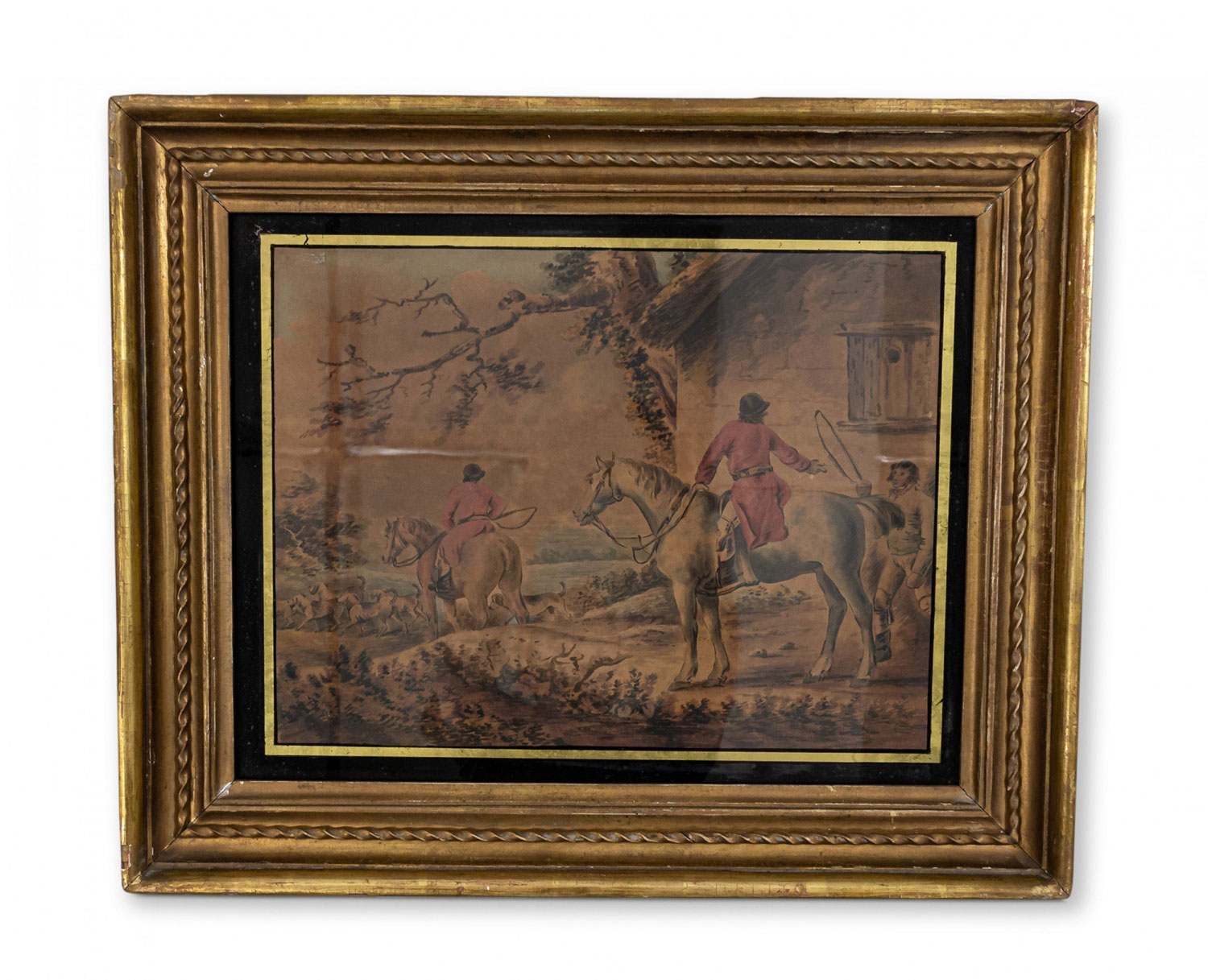 English Victorian watercolor painting of two hunters on horses accompanied by dogs under glass in a gold and black rectangular frame (Companion piece: 062458)