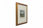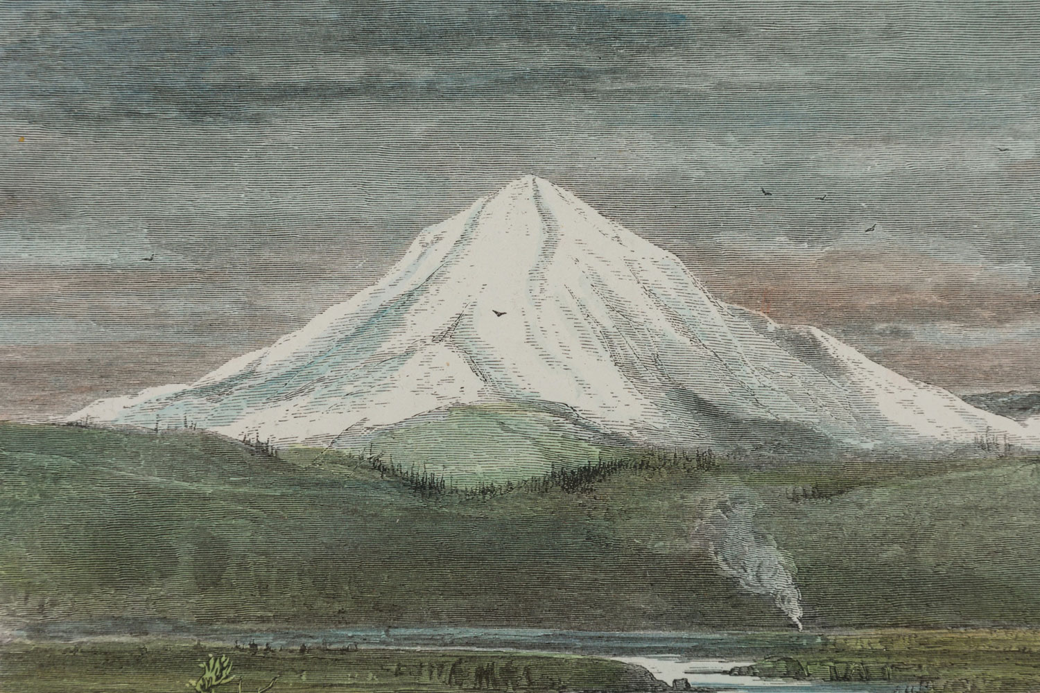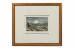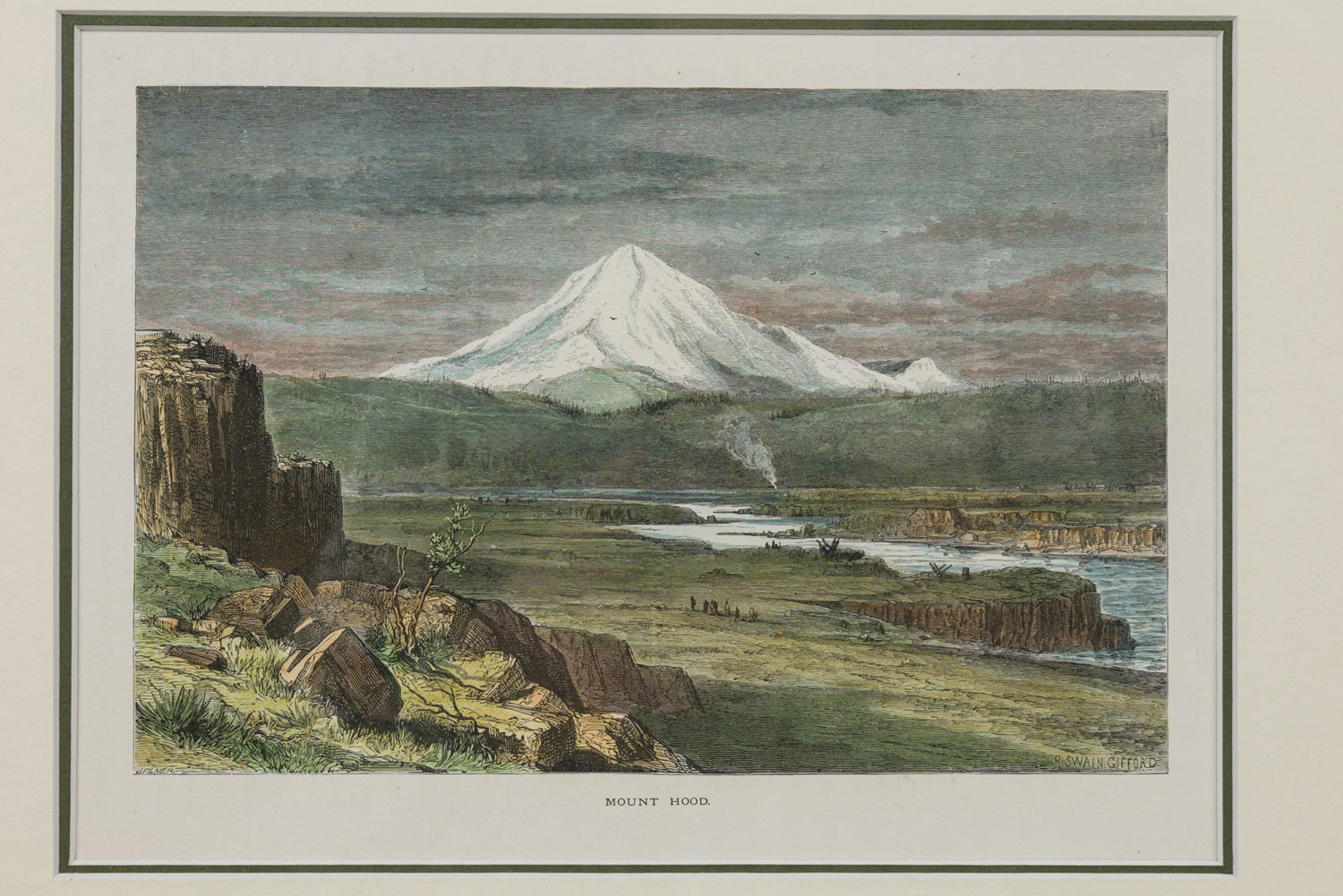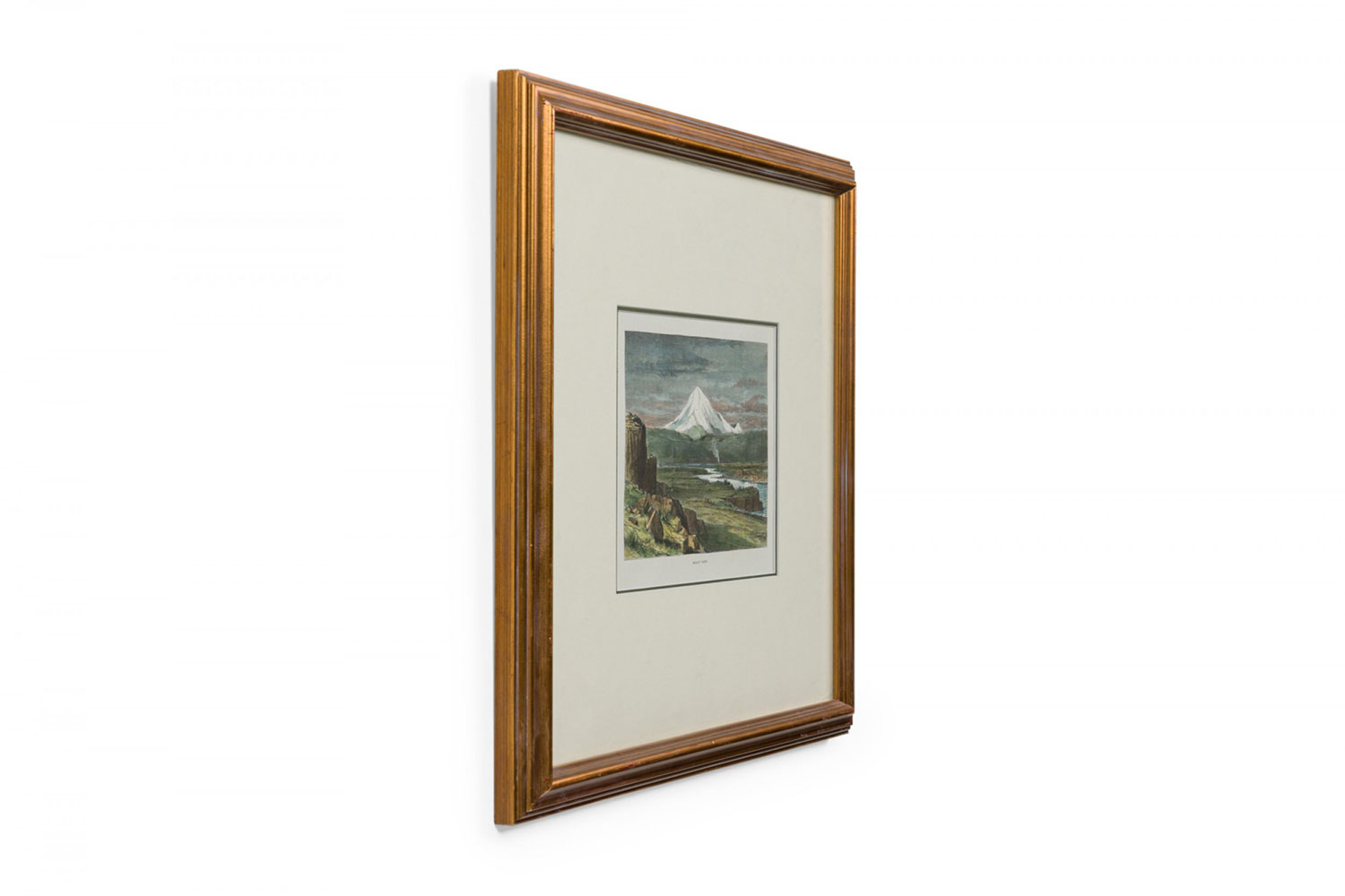 American Mid-century color etching of a green rocky landscape by a river with a prominent white mountain in the background titled: "Mount Hood" in a white mat with a gilt wooden frame.