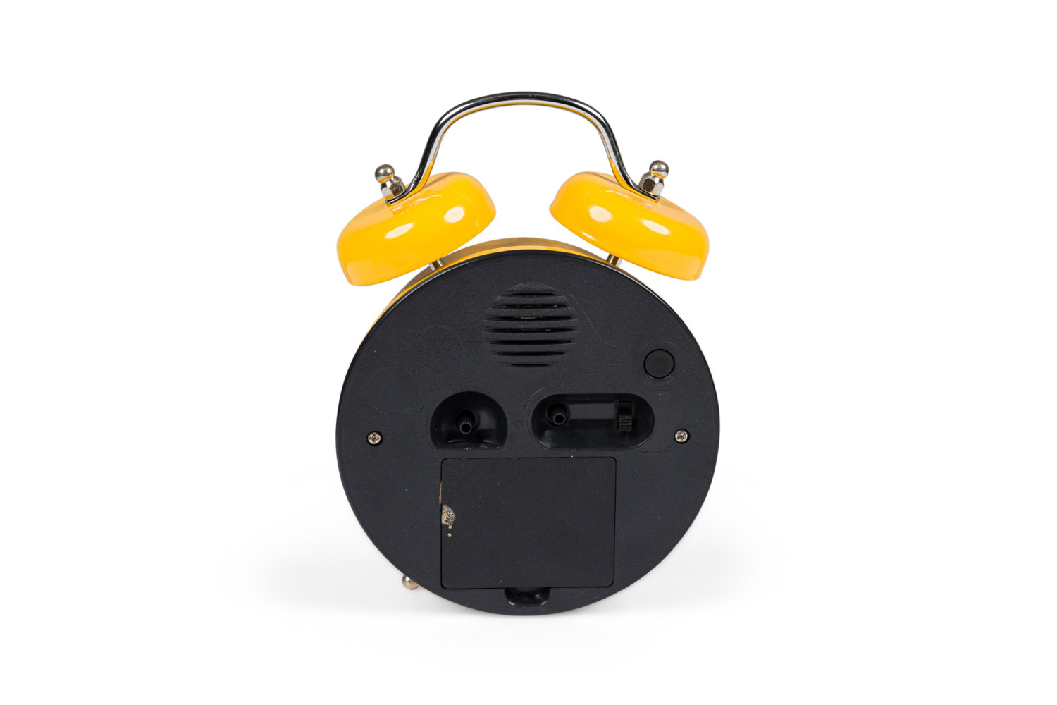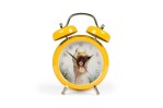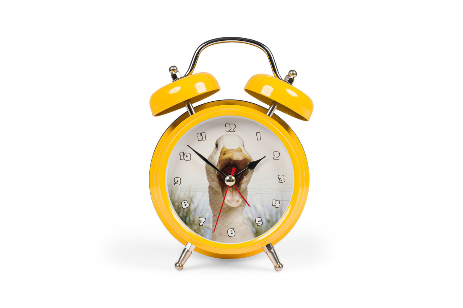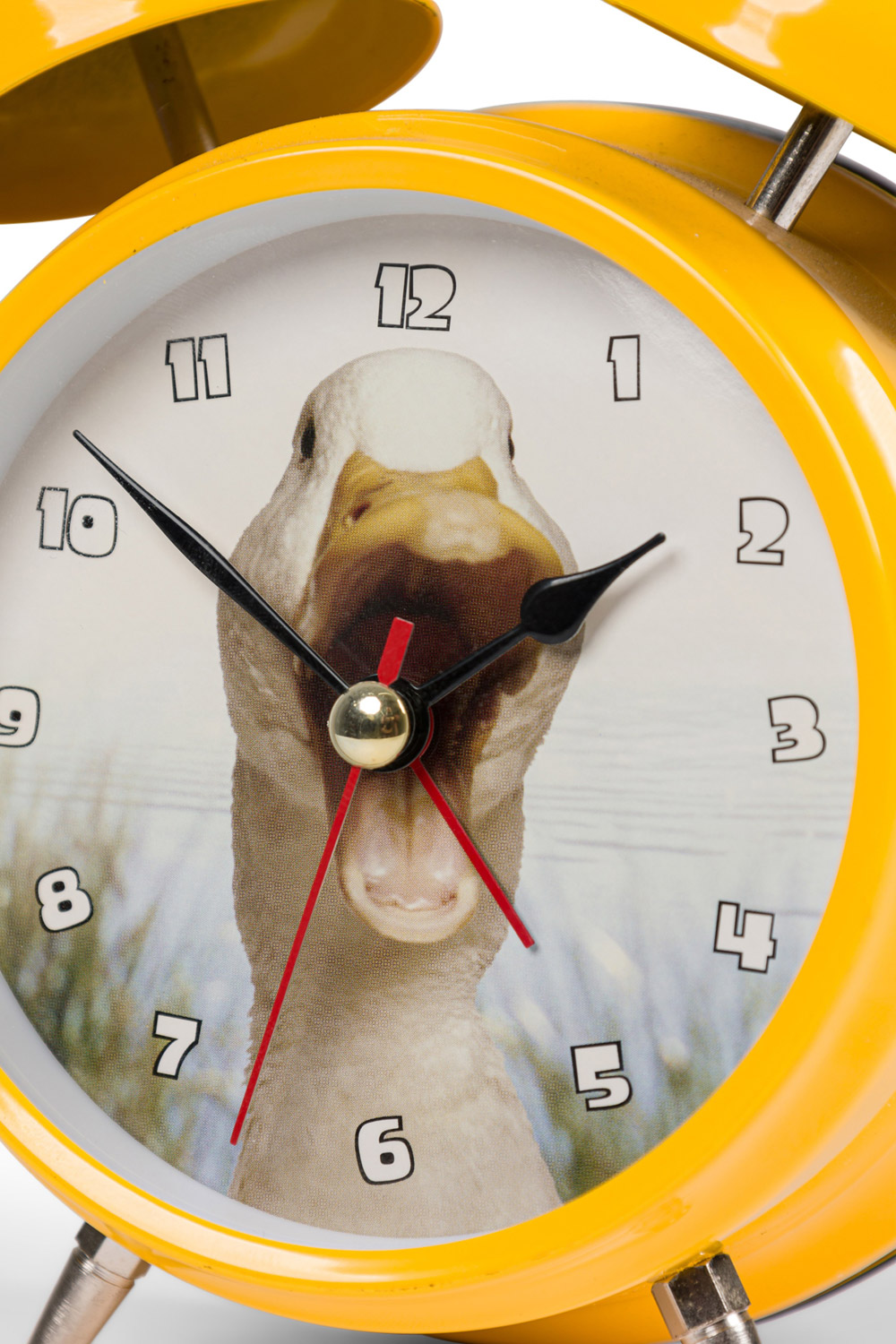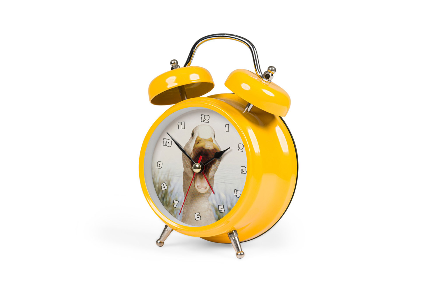 Round yellow metal twin-bell alarm clock with feet, a white face with a picture of a duck, and white numbers.