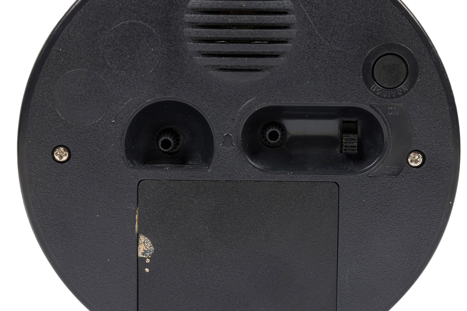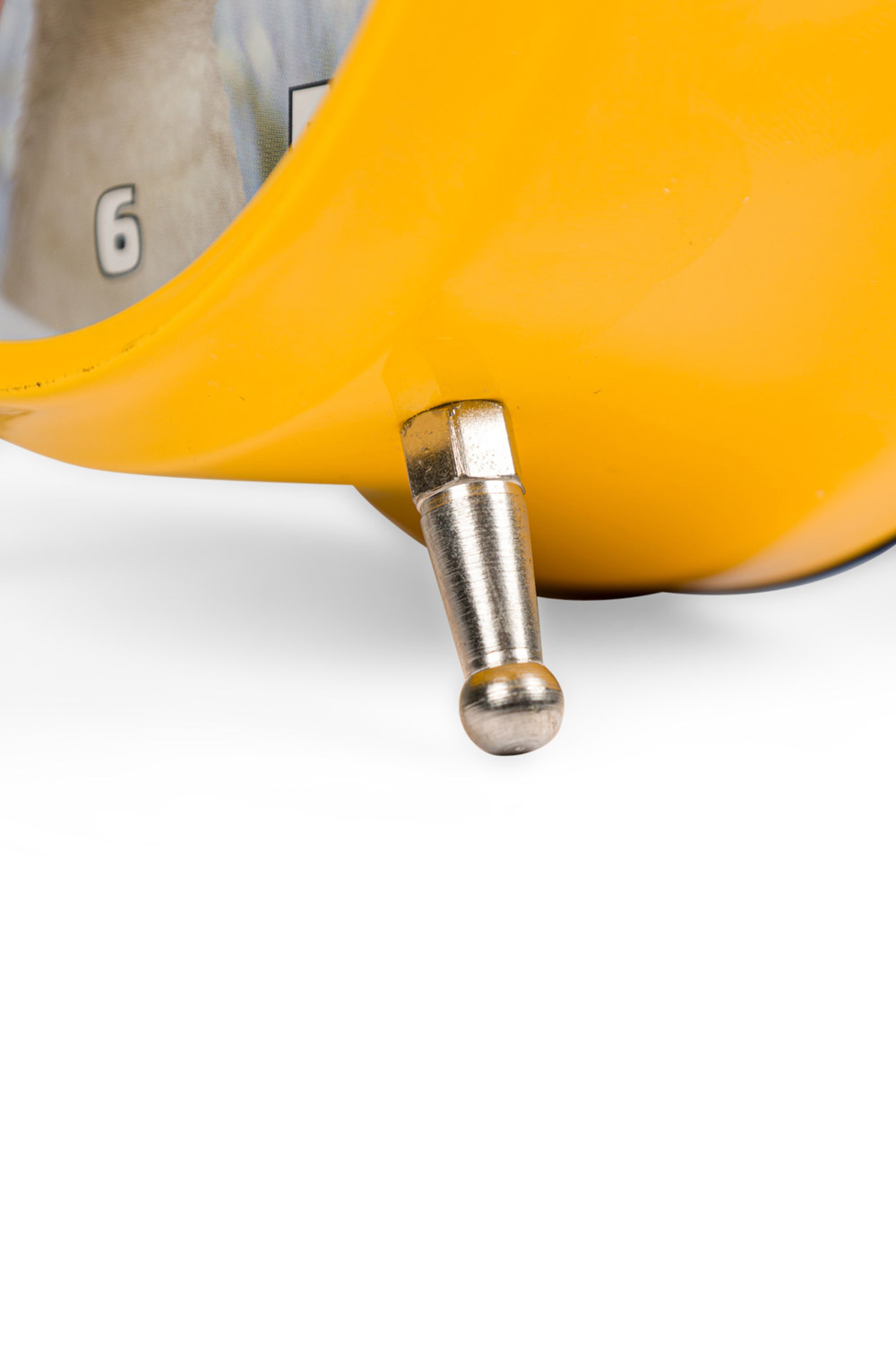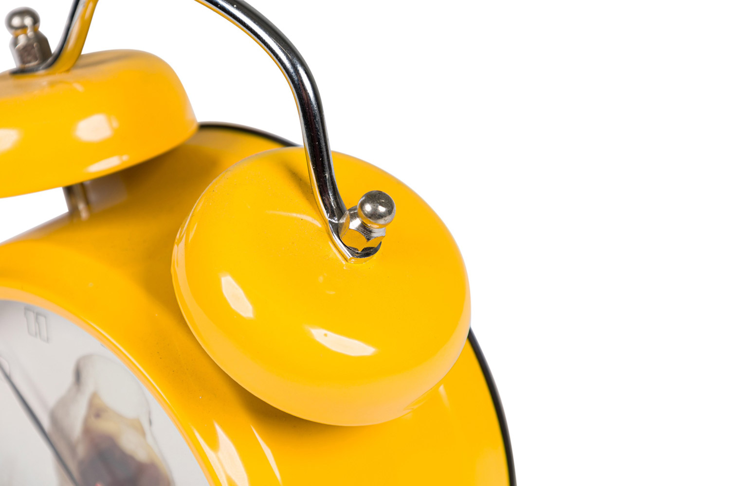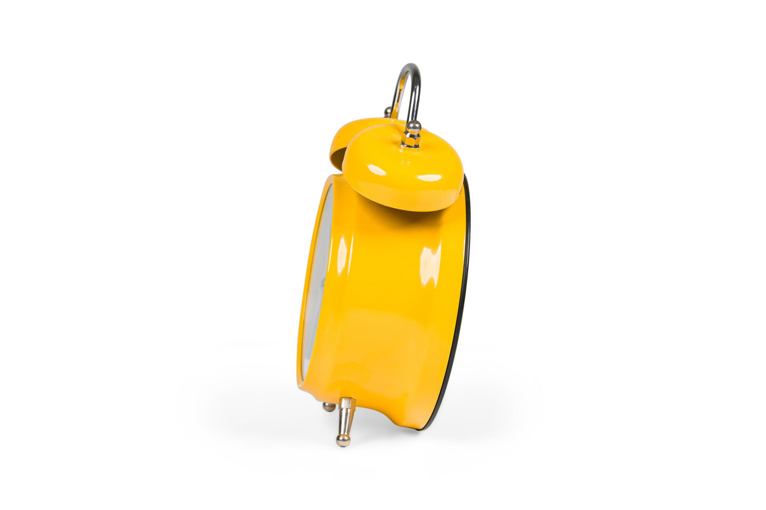 Round yellow metal twin-bell alarm clock with feet, a white face with a picture of a duck, and white numbers.