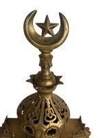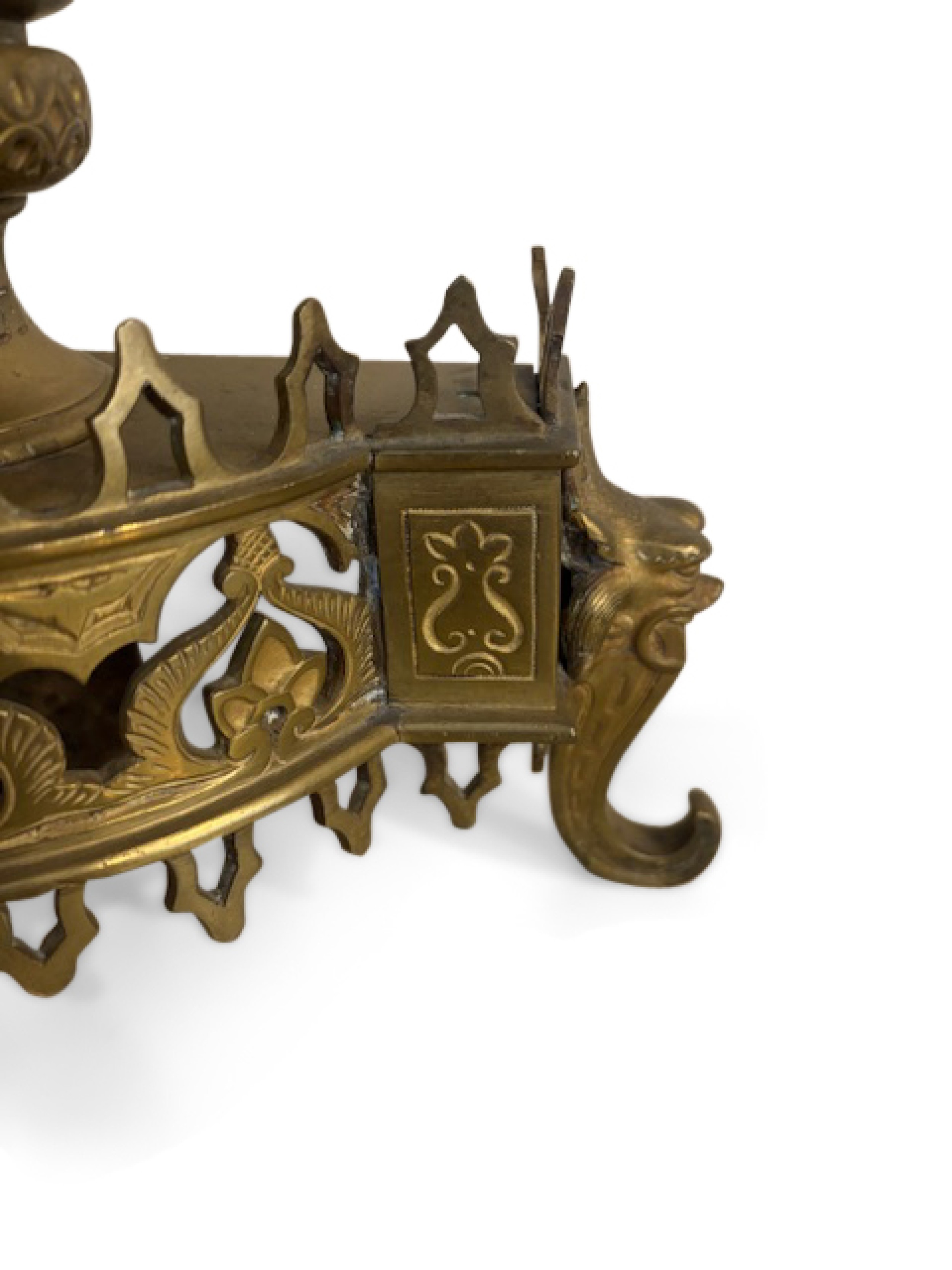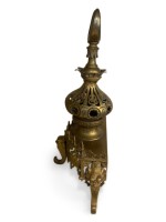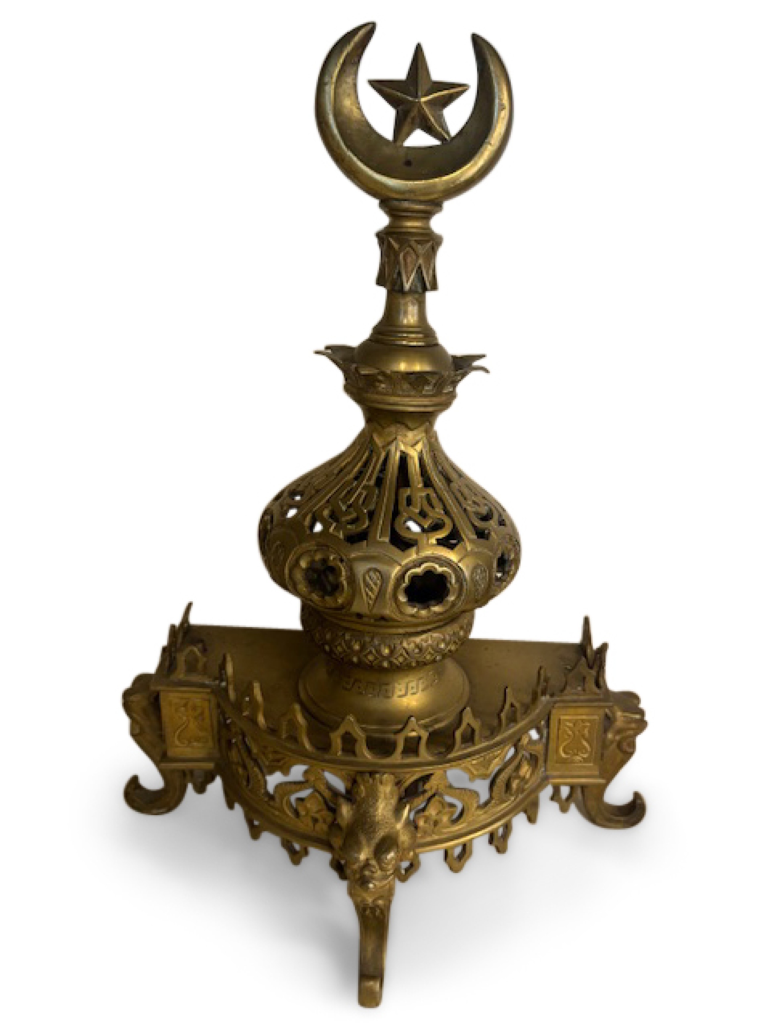 French (19/20th Century) Moorish style bronze andirons with crescent and star finial top and resting on 3 elephant head form legs.