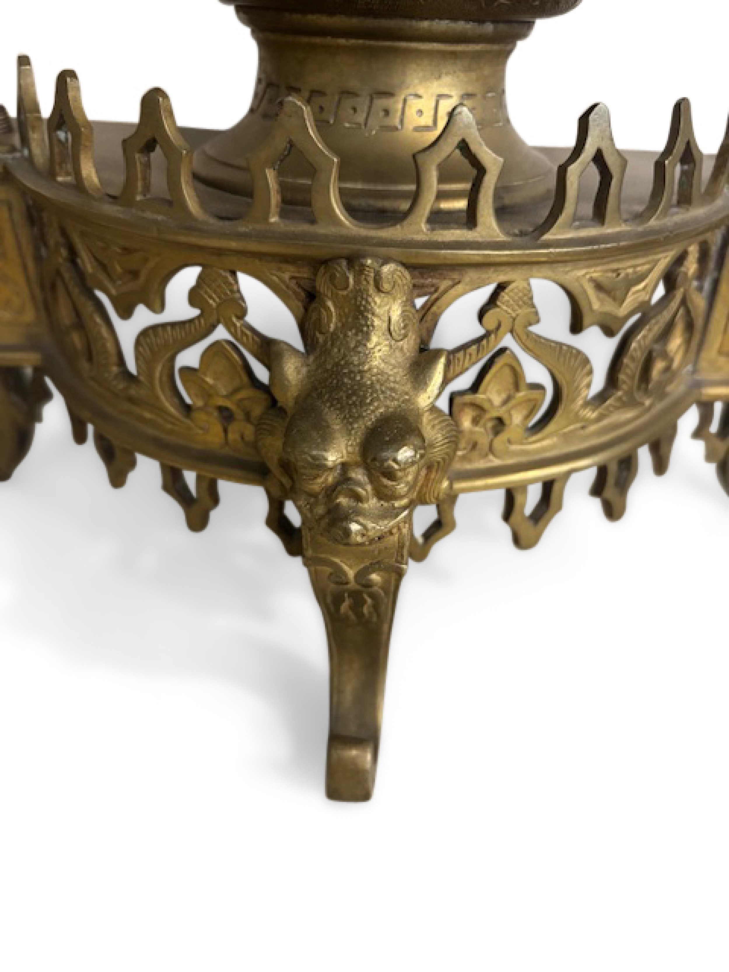 French (19/20th Century) Moorish style bronze andirons with crescent and star finial top and resting on 3 elephant head form legs