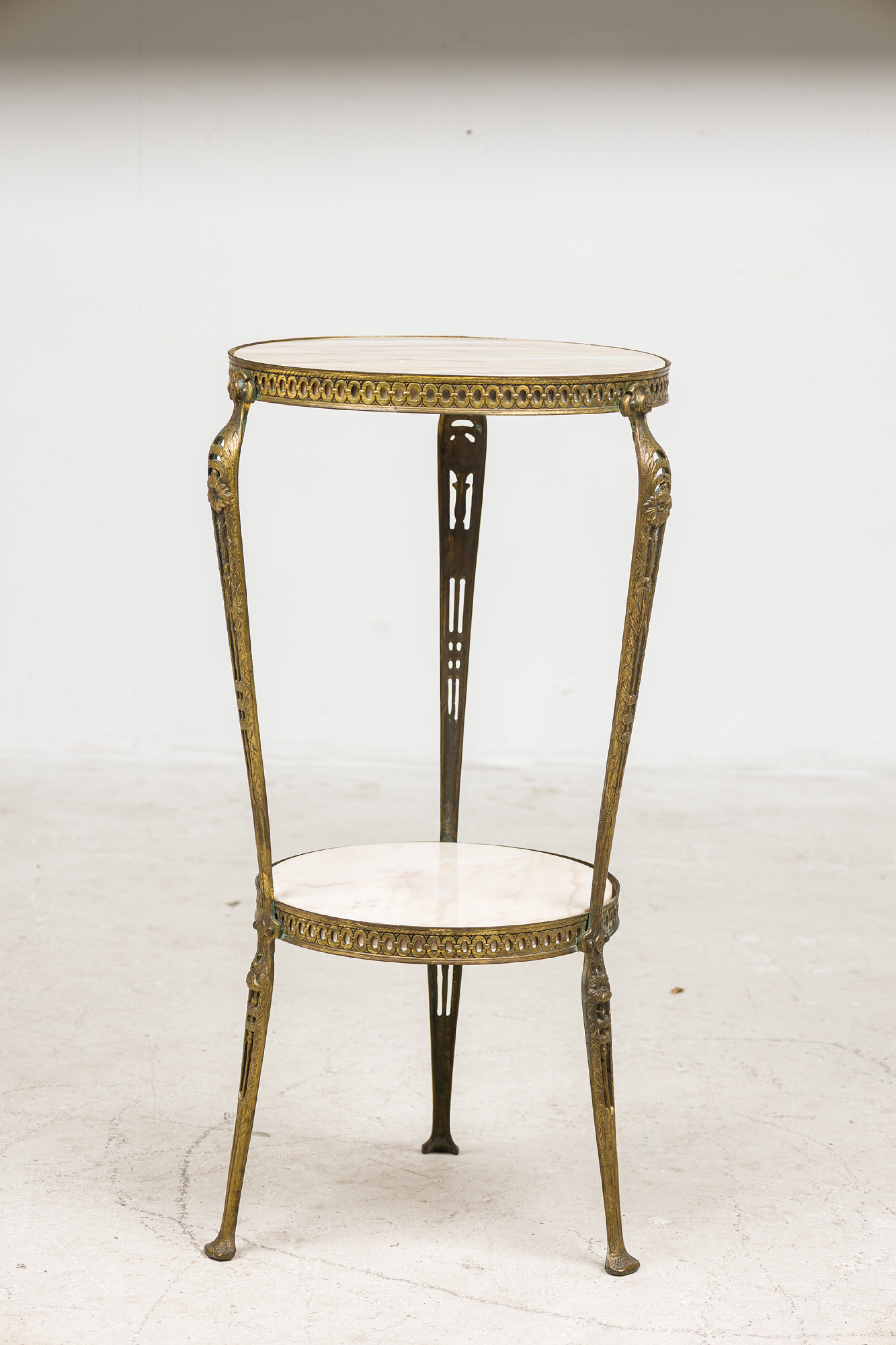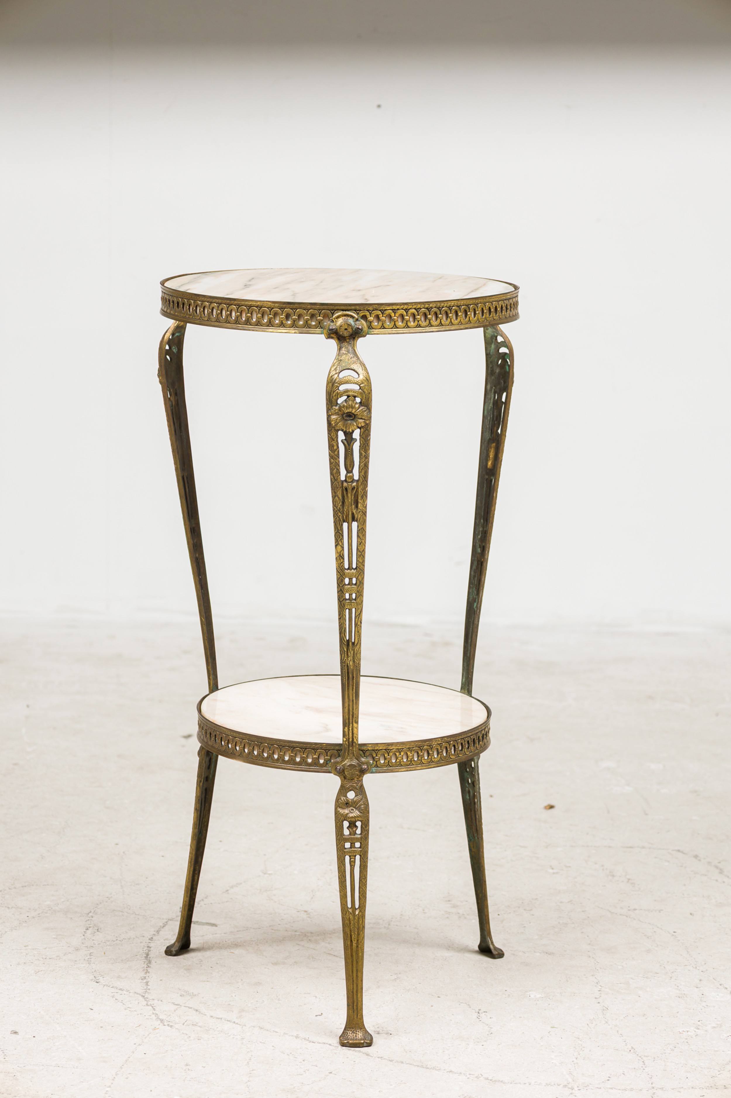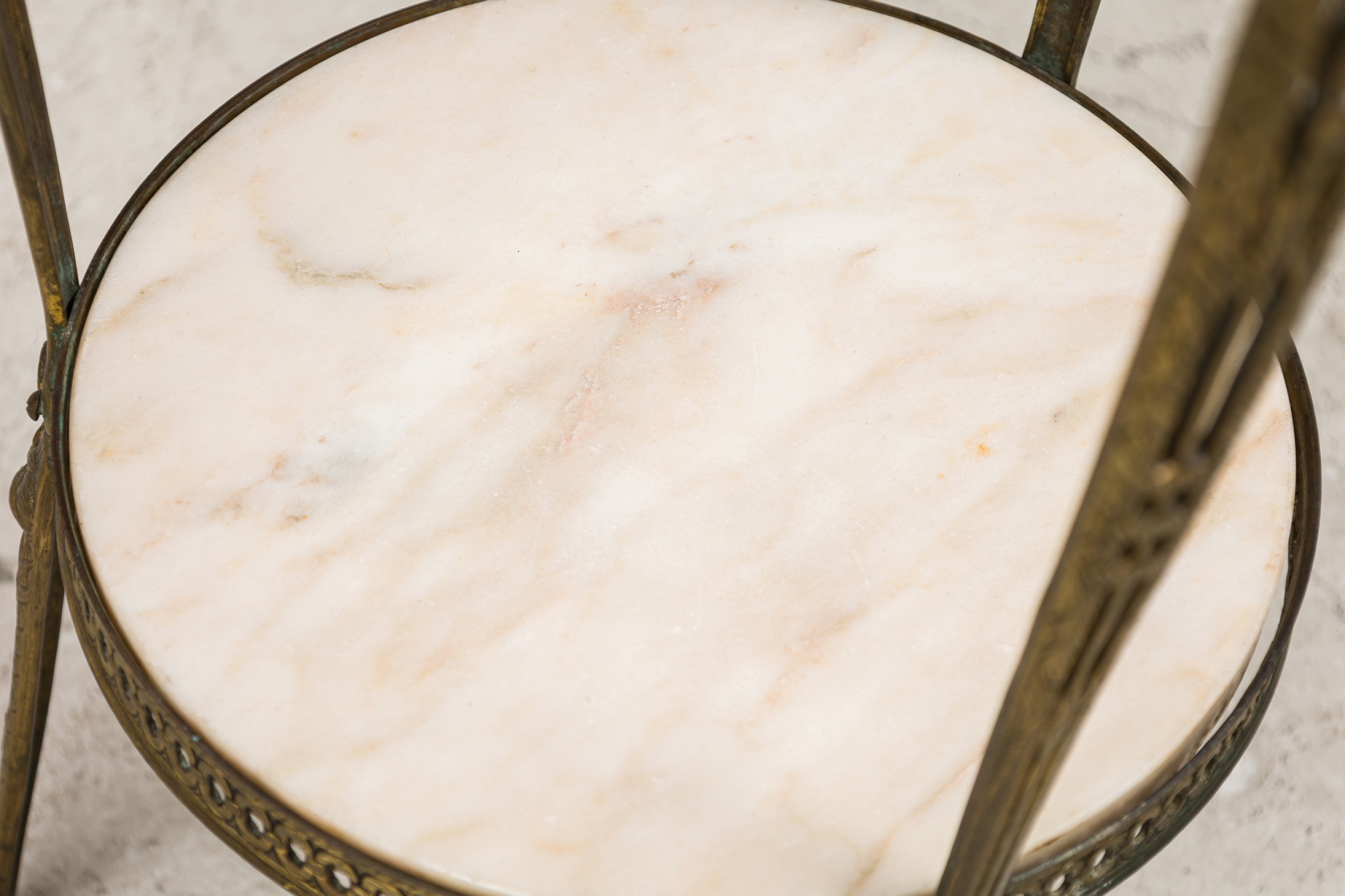 French Directoire style (1920s) gueridon / end table having a round marble top inset into a pierced rim and supported on three cast filigree bronze legs with flower stalks joined by a lower marble shelf