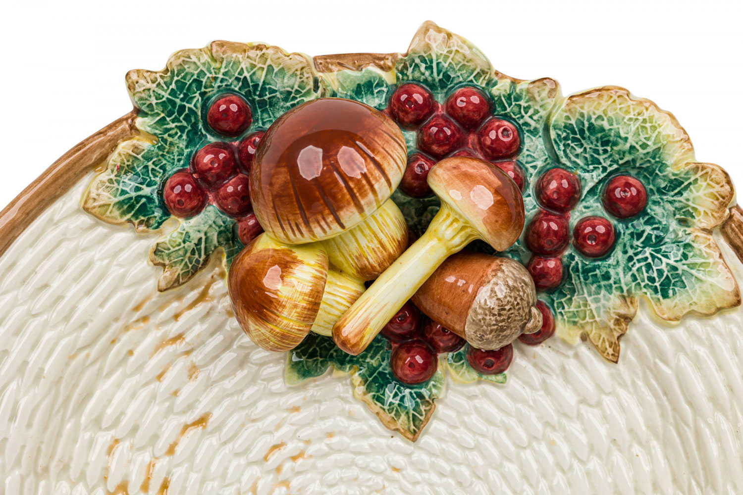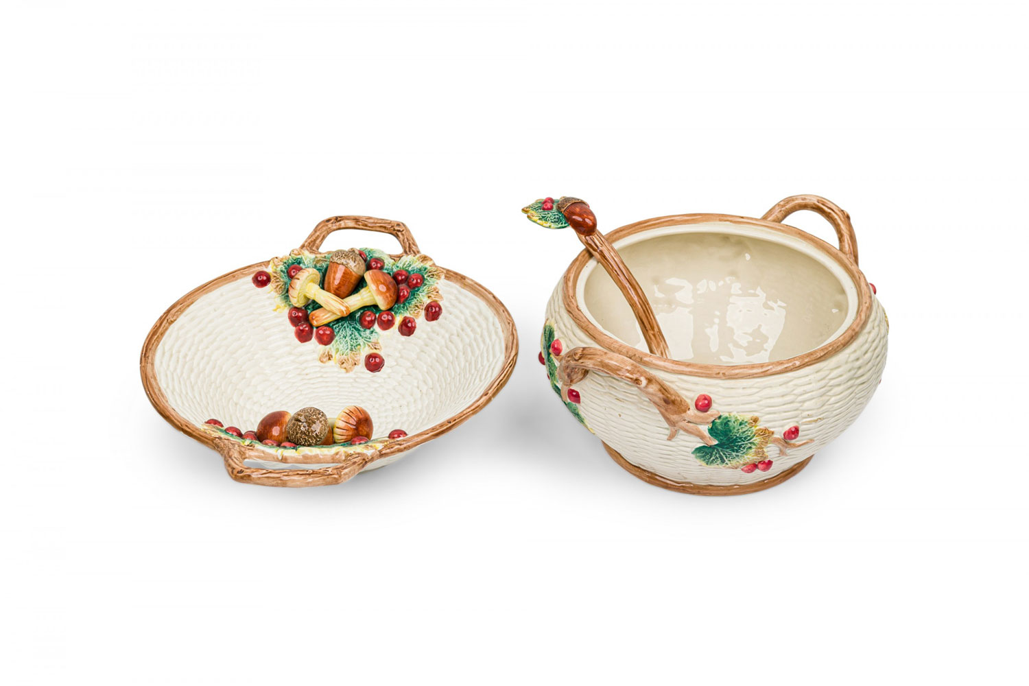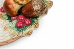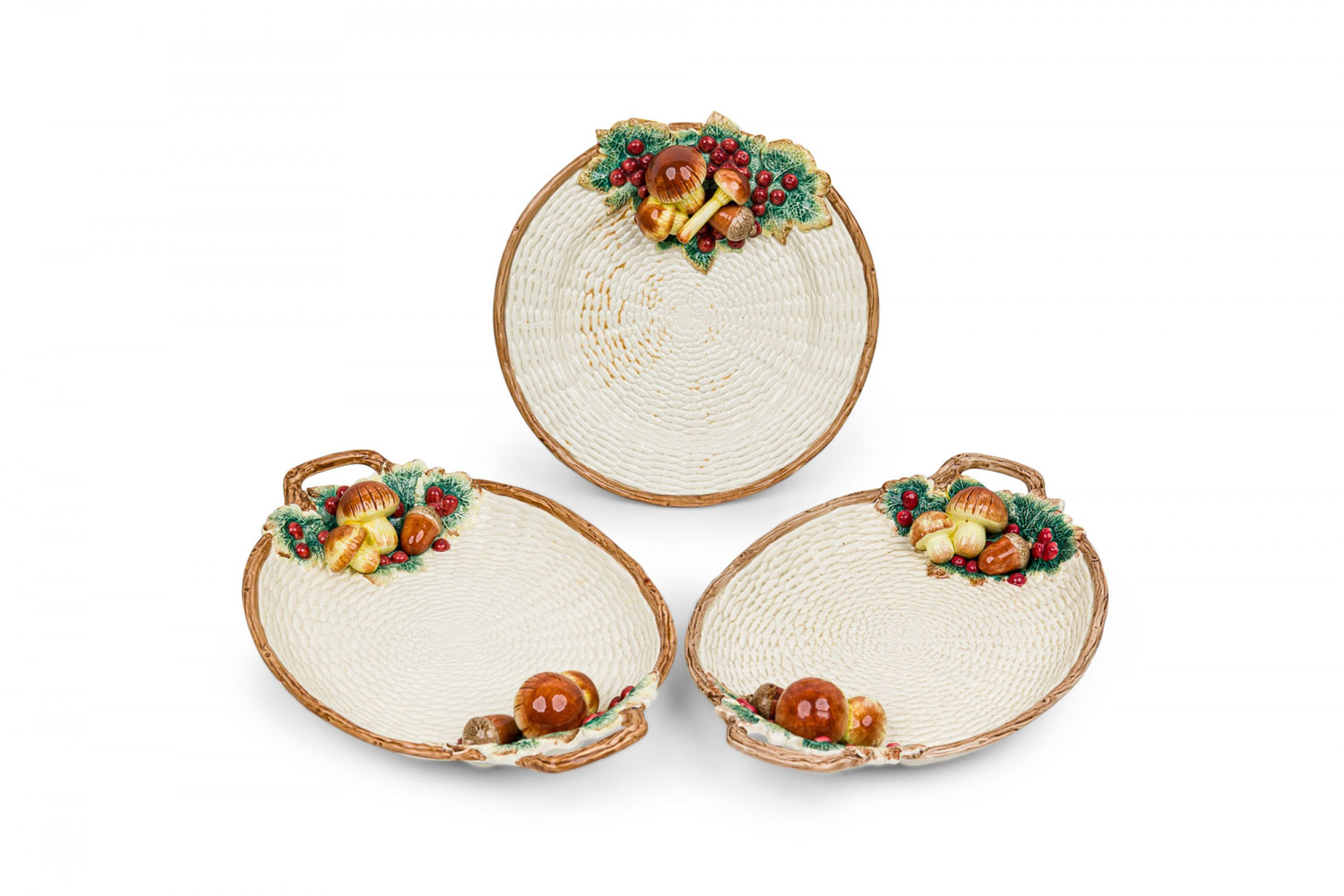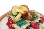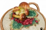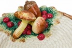 Style: Mid-Century Materials & Techniques: Ceramic, painted Category: Dining Room Condition: A few chips. Mushroom on small oblong dish has been broken and repaired. Good; Minor losses