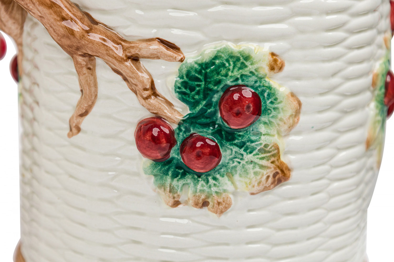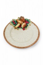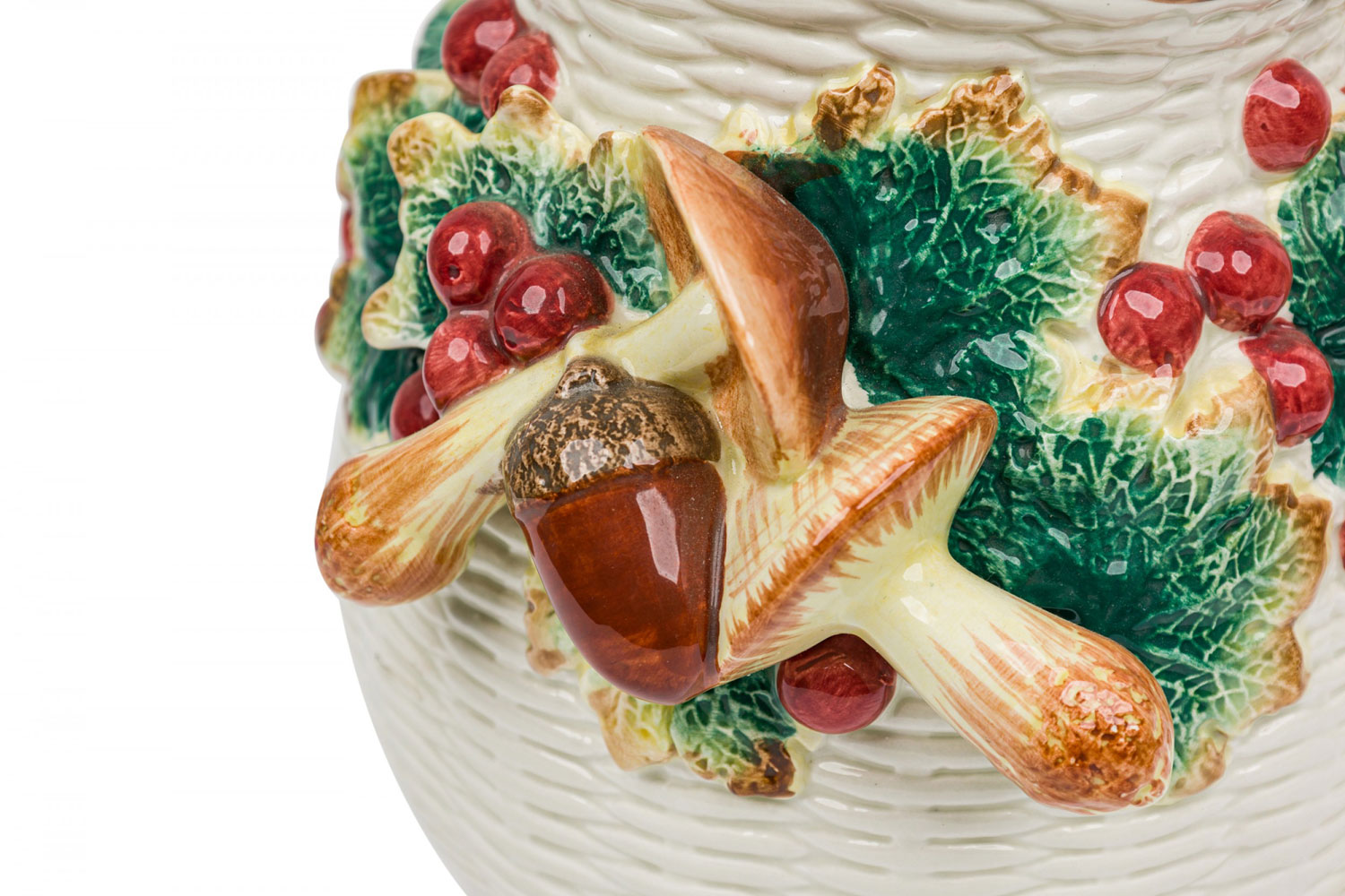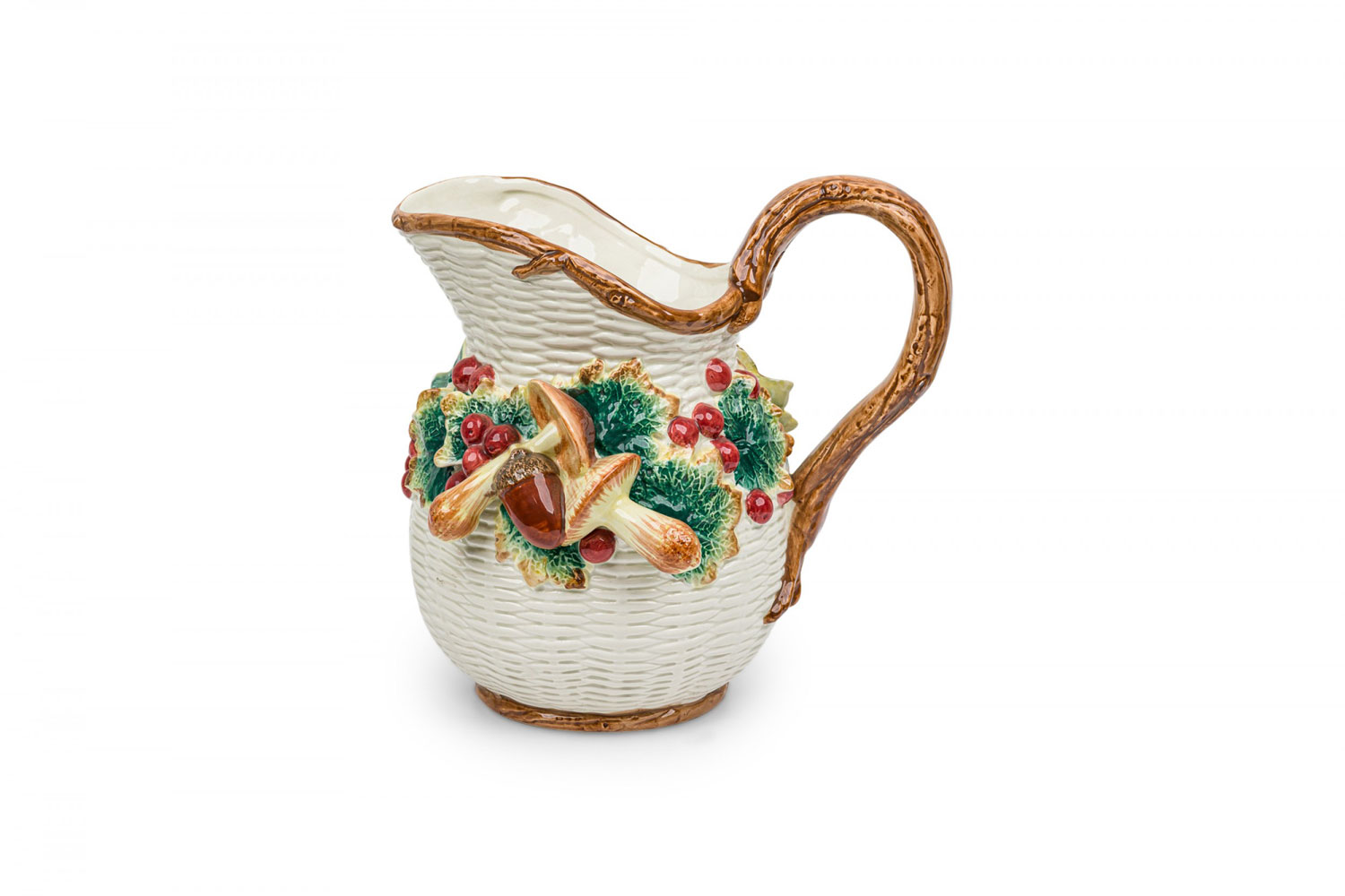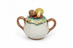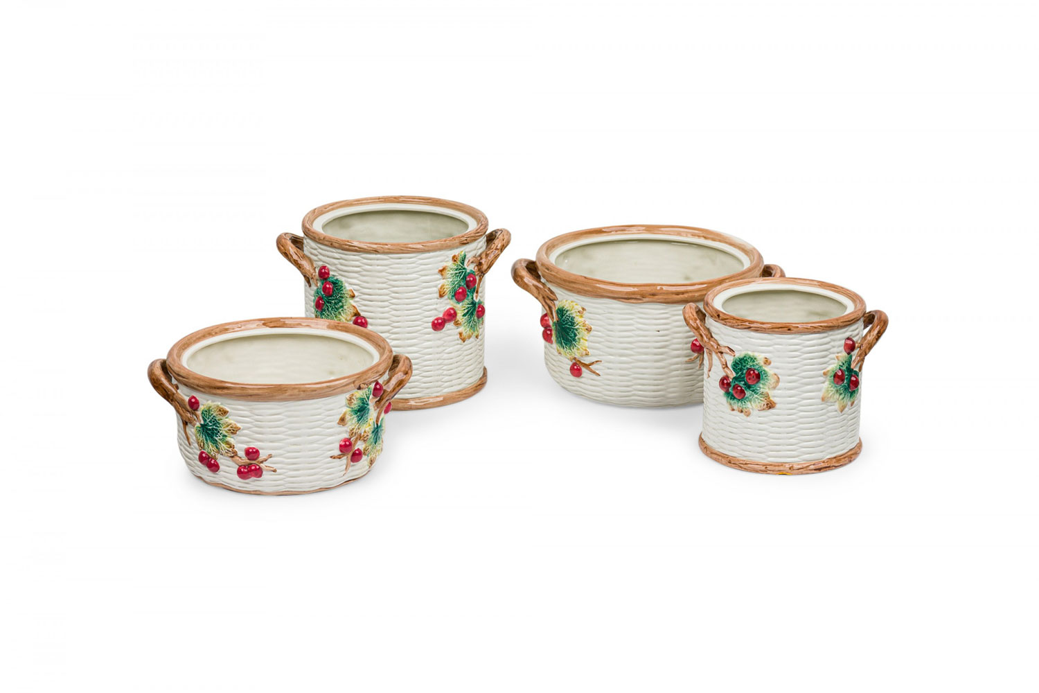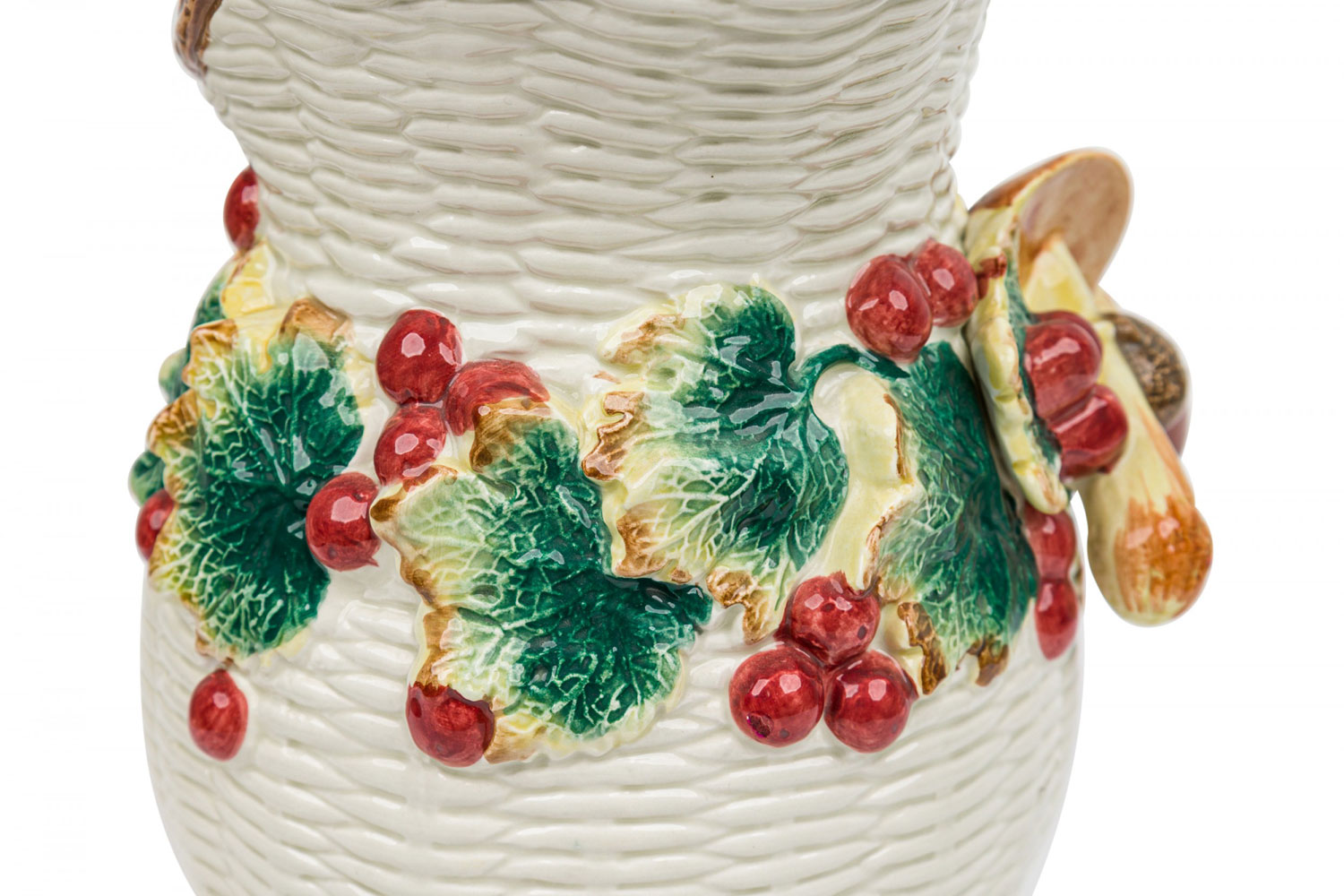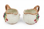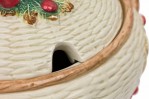 17 PIECE-SET of Vintage crockery including 3 small plates, 1 large plate, 2 large trays, a water pitcher, 2 cream pitchers, a sugar bowl, a soup tureen, and four dry good cannisters, all with basket weave white surfaces with colorful accents featuring mushrooms, berries, asparacus, leaks, and other vegetables. (PRICED AS SET)