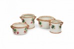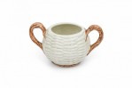 17 PIECE-SET of Vintage crockery including 3 small plates, 1 large plate, 2 large trays, a water pitcher, 2 cream pitchers, a sugar bowl, a soup tureen, and four dry good cannisters, all with basket weave white surfaces with colorful accents featuring mushrooms, berries, asparacus, leaks, and other vegetables. (PRICED AS SET).