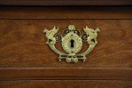 French Louis XVI-style (late 19th/early 20th Century) mahogany writing desk with bronze trim, gilt embossed leather writing top, with pull-out side extensions and 5 front and back drawers (with key)